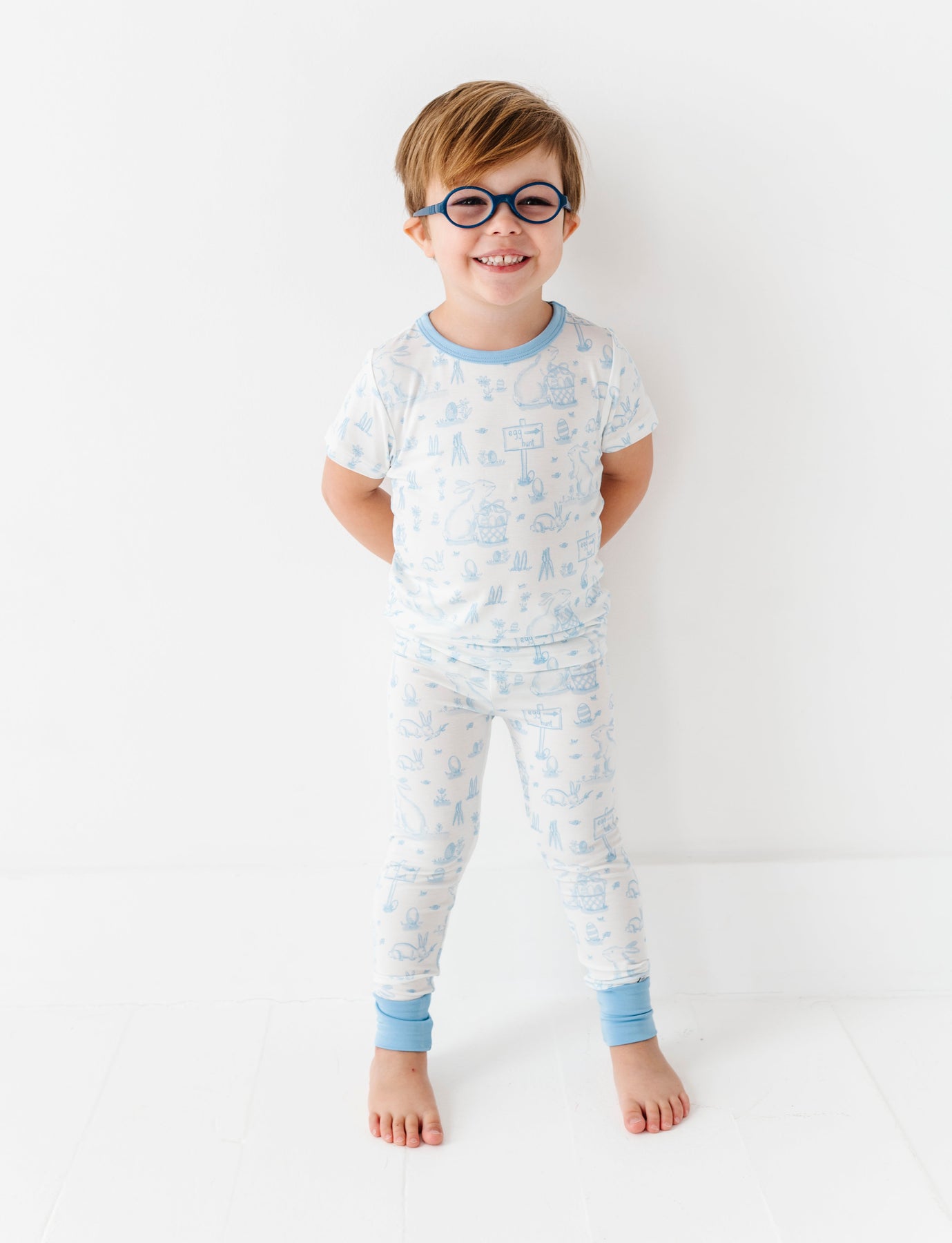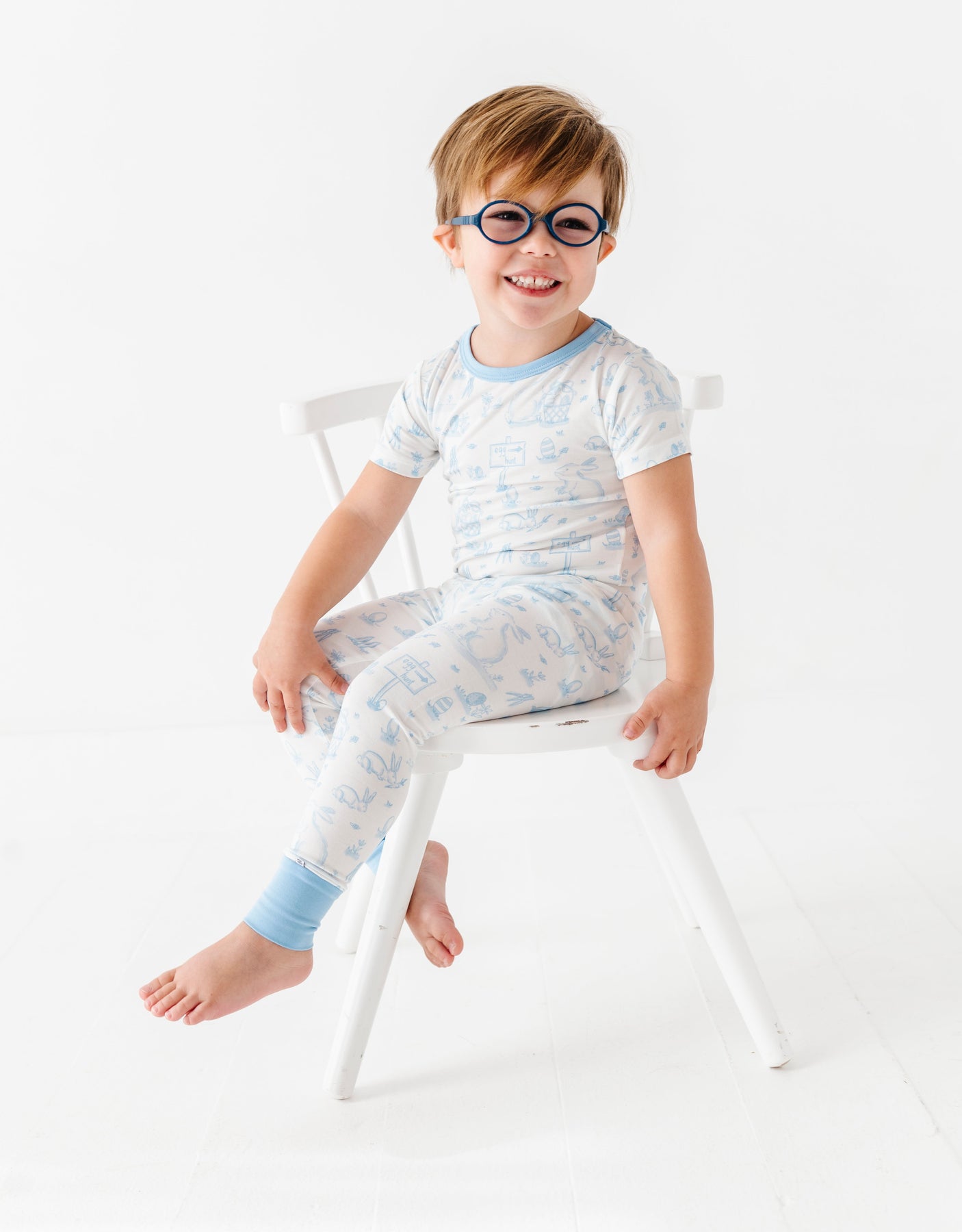 Child wearing glasses and a light blue pajama set with animal prints on a white background
