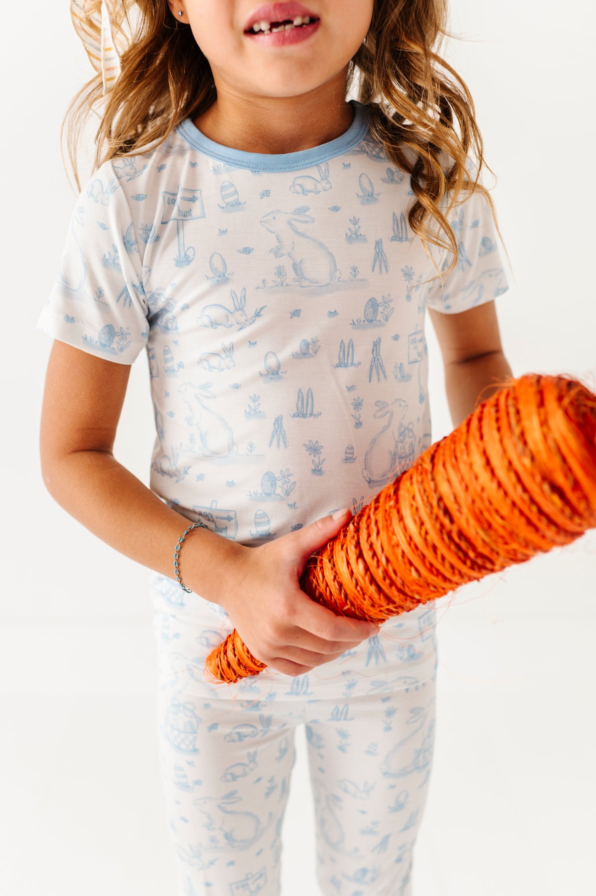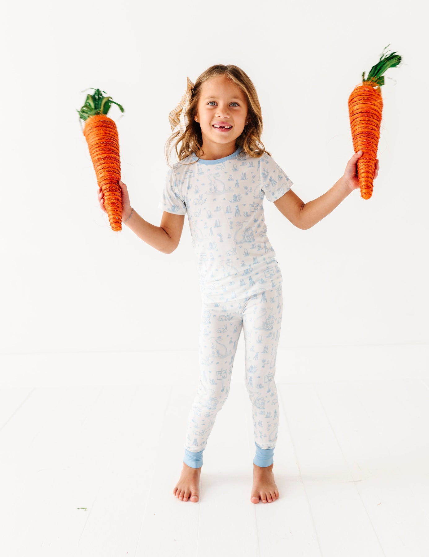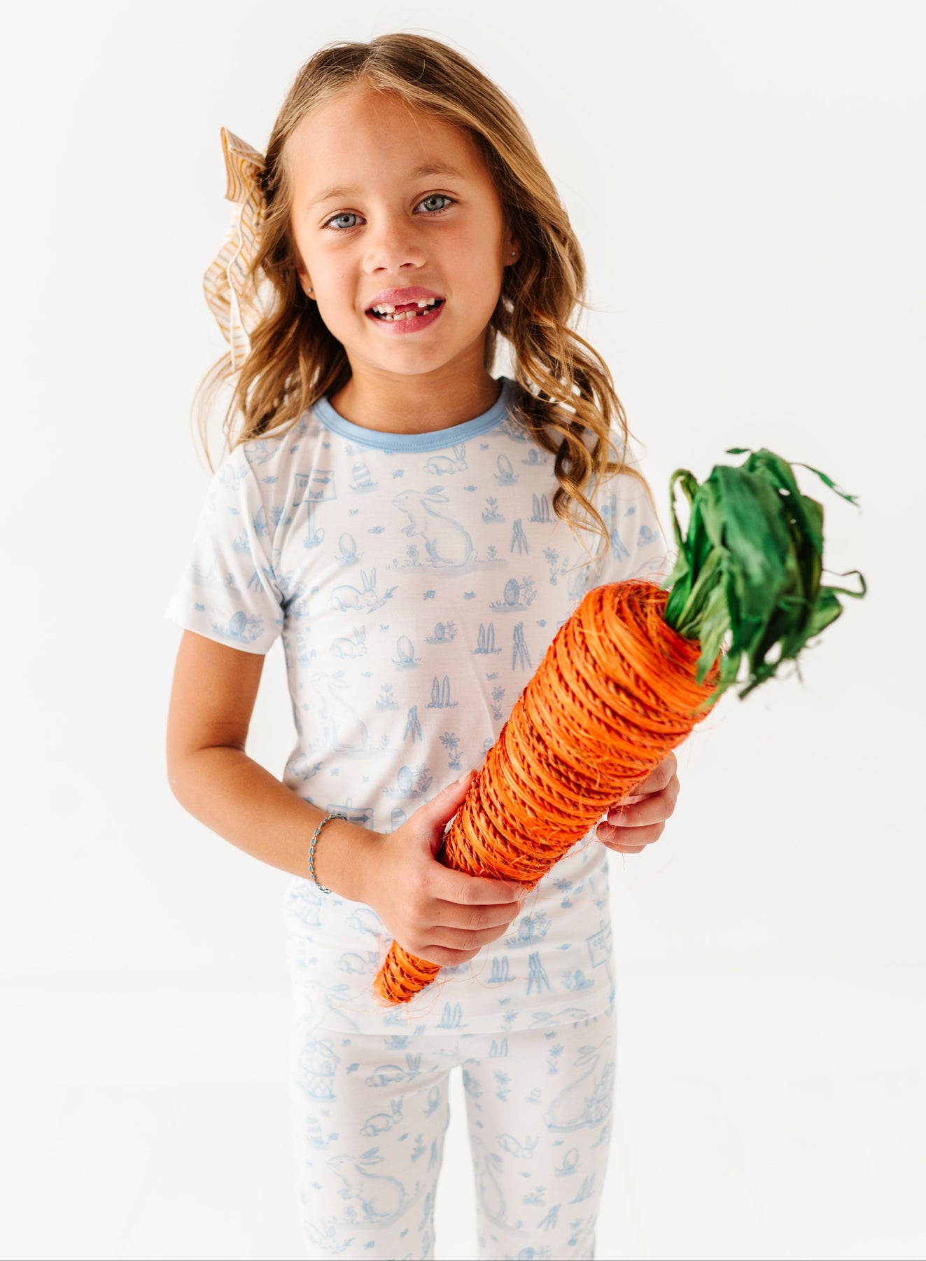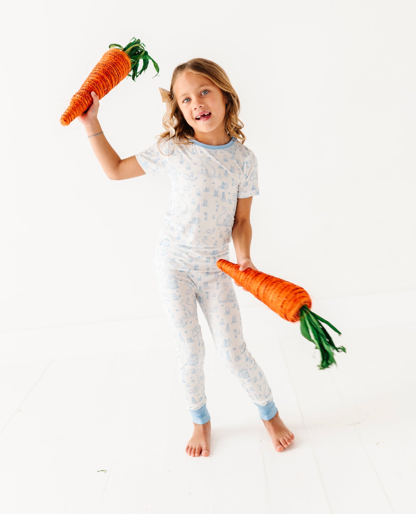 Child wearing a light blue and white Easter pajama set holding two toy carrots on a white background