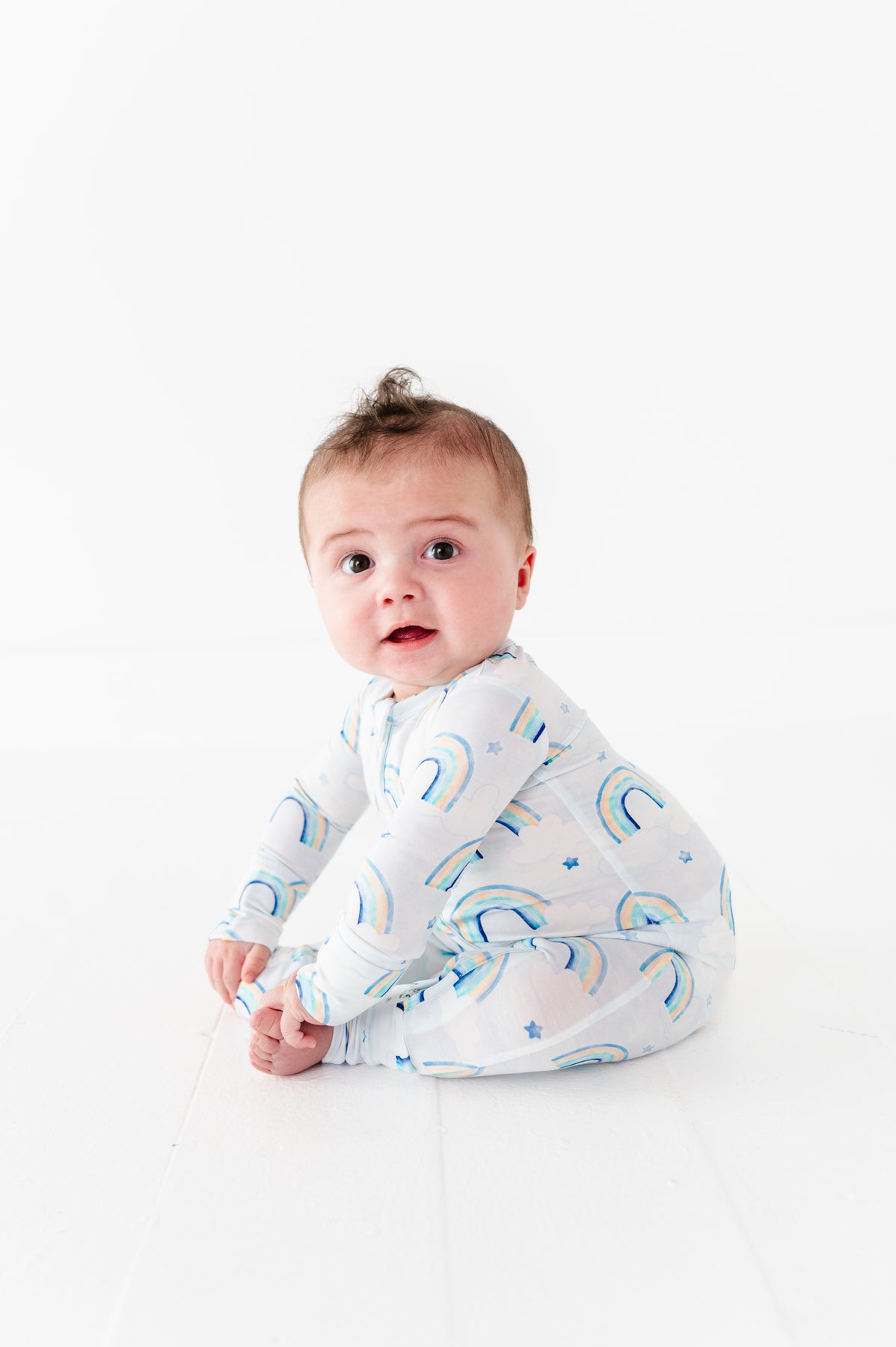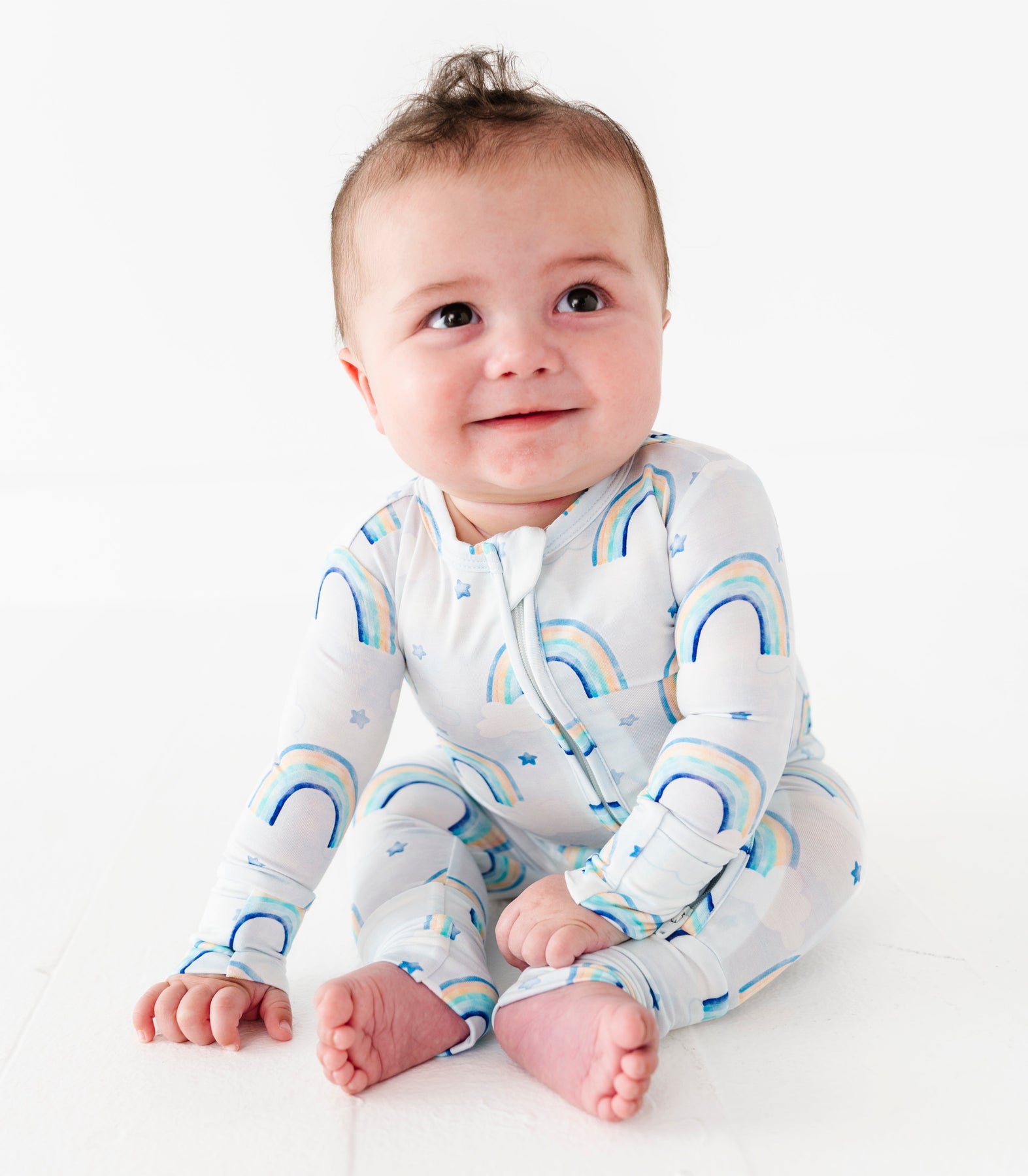 Baby wearing a bamboo zip romper with watercolor rainbow pattern on a white background
