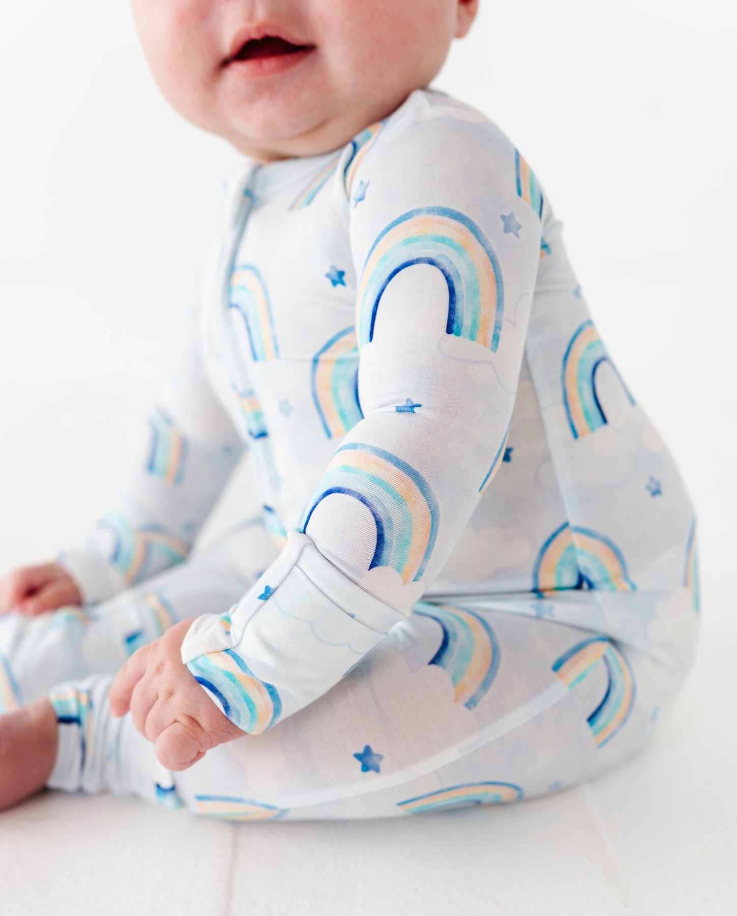 Baby wearing a bamboo zip romper with blue watercolor rainbow patterns on a white background