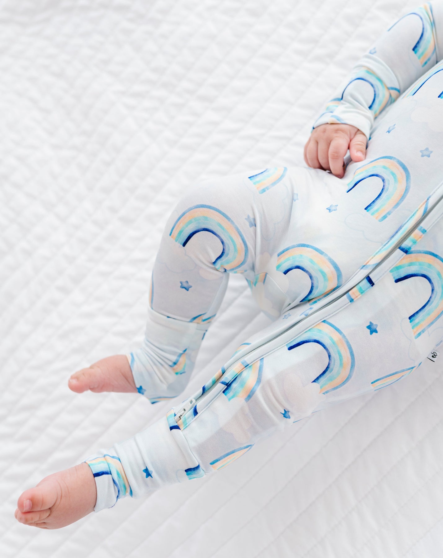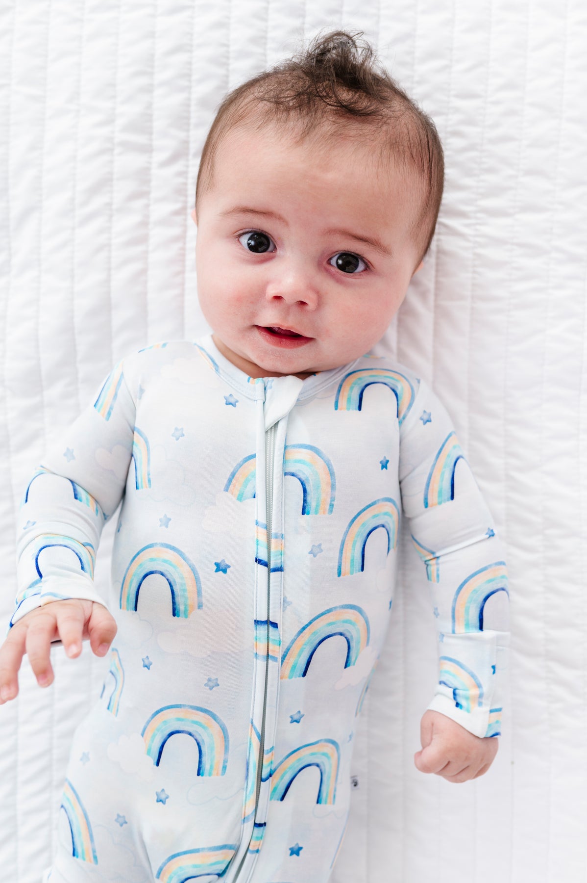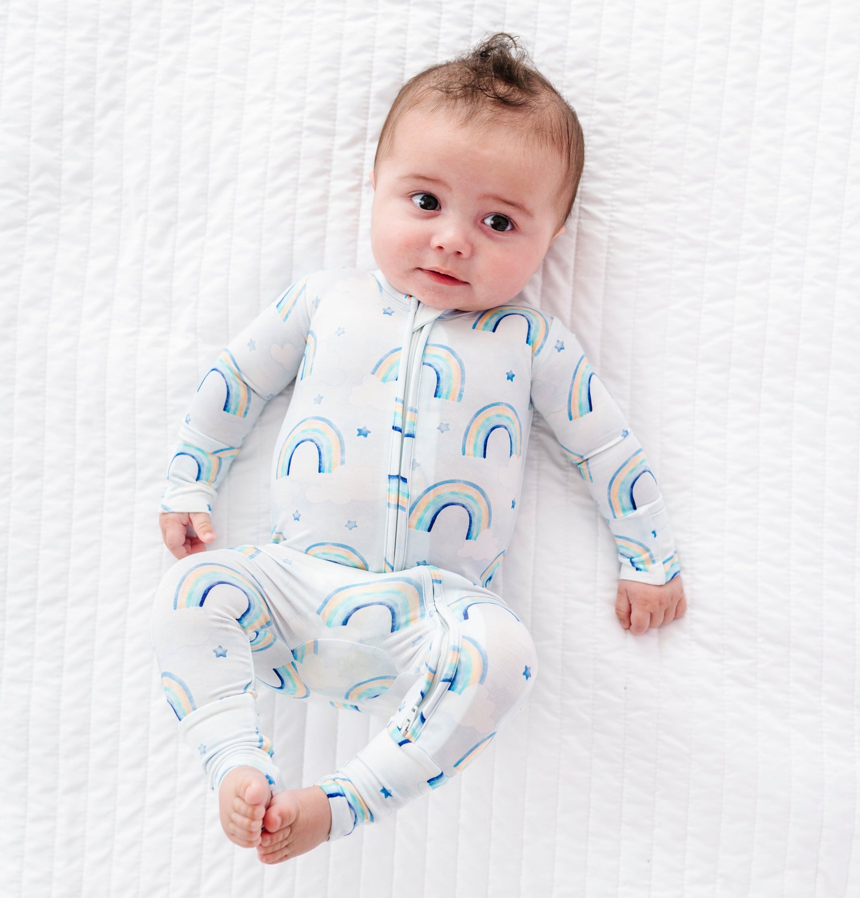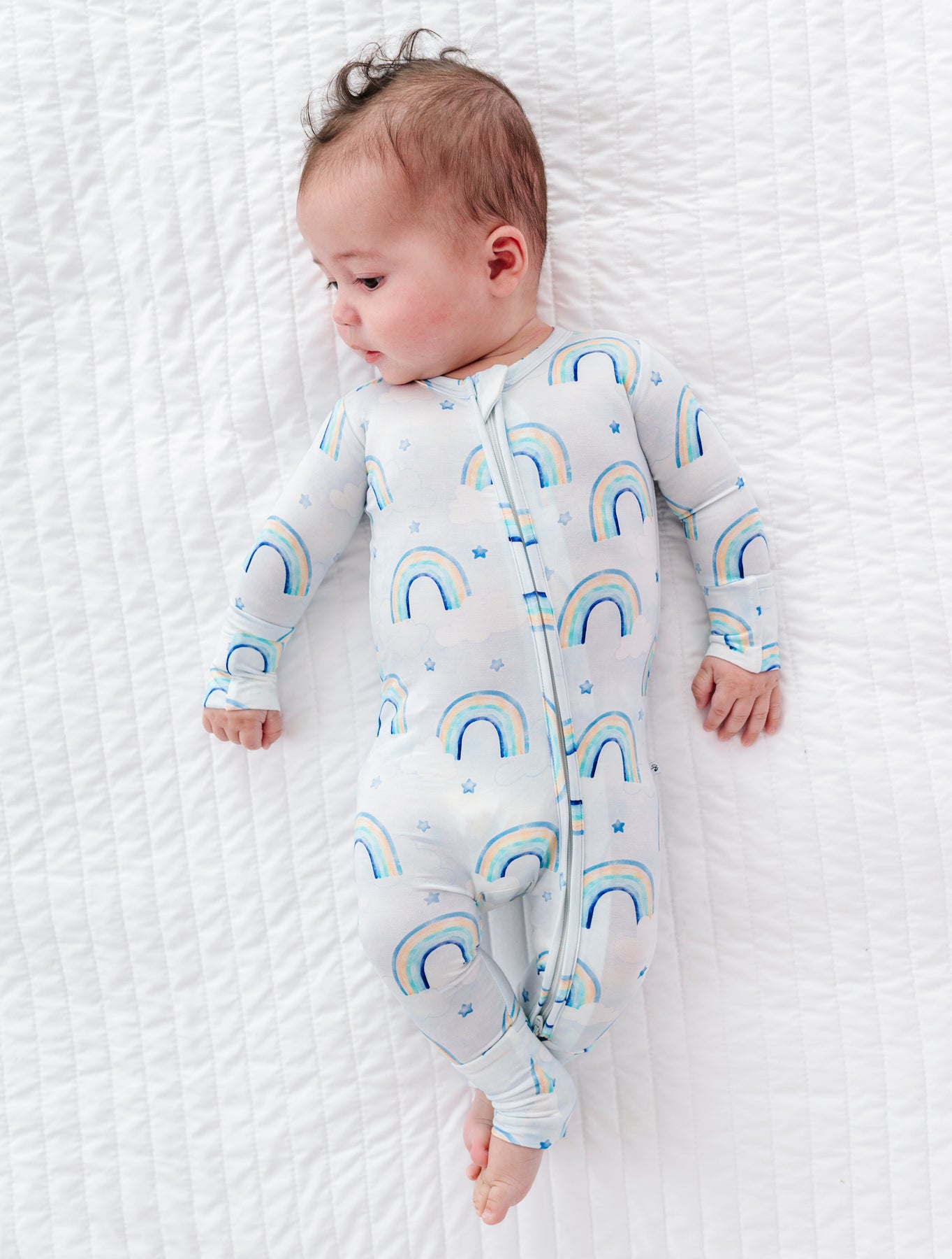 Baby lying on a white textured surface wearing a bamboo convertible romper with blue rainbow patterns.