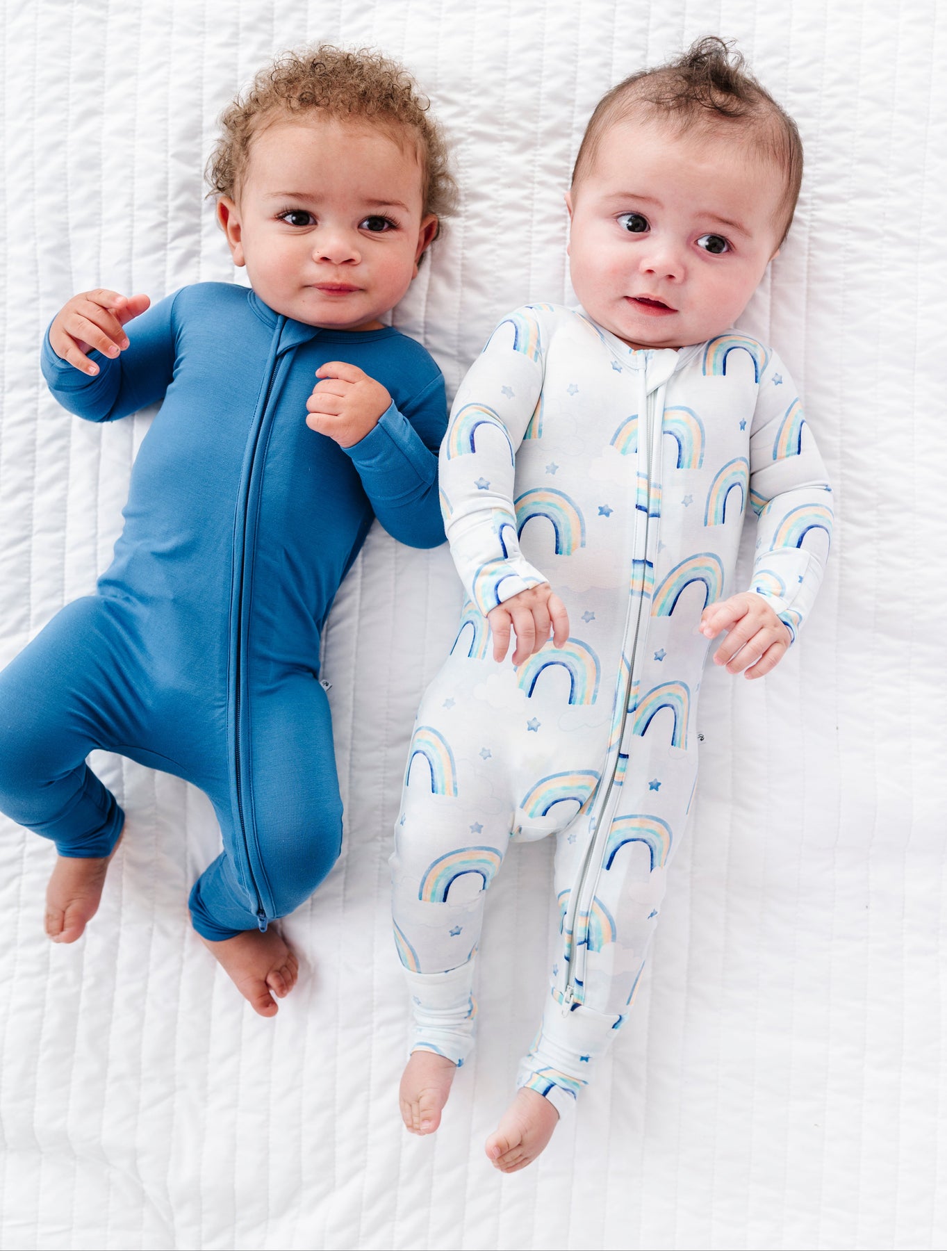Two babies wearing bamboo zip rompers on a white textured surface