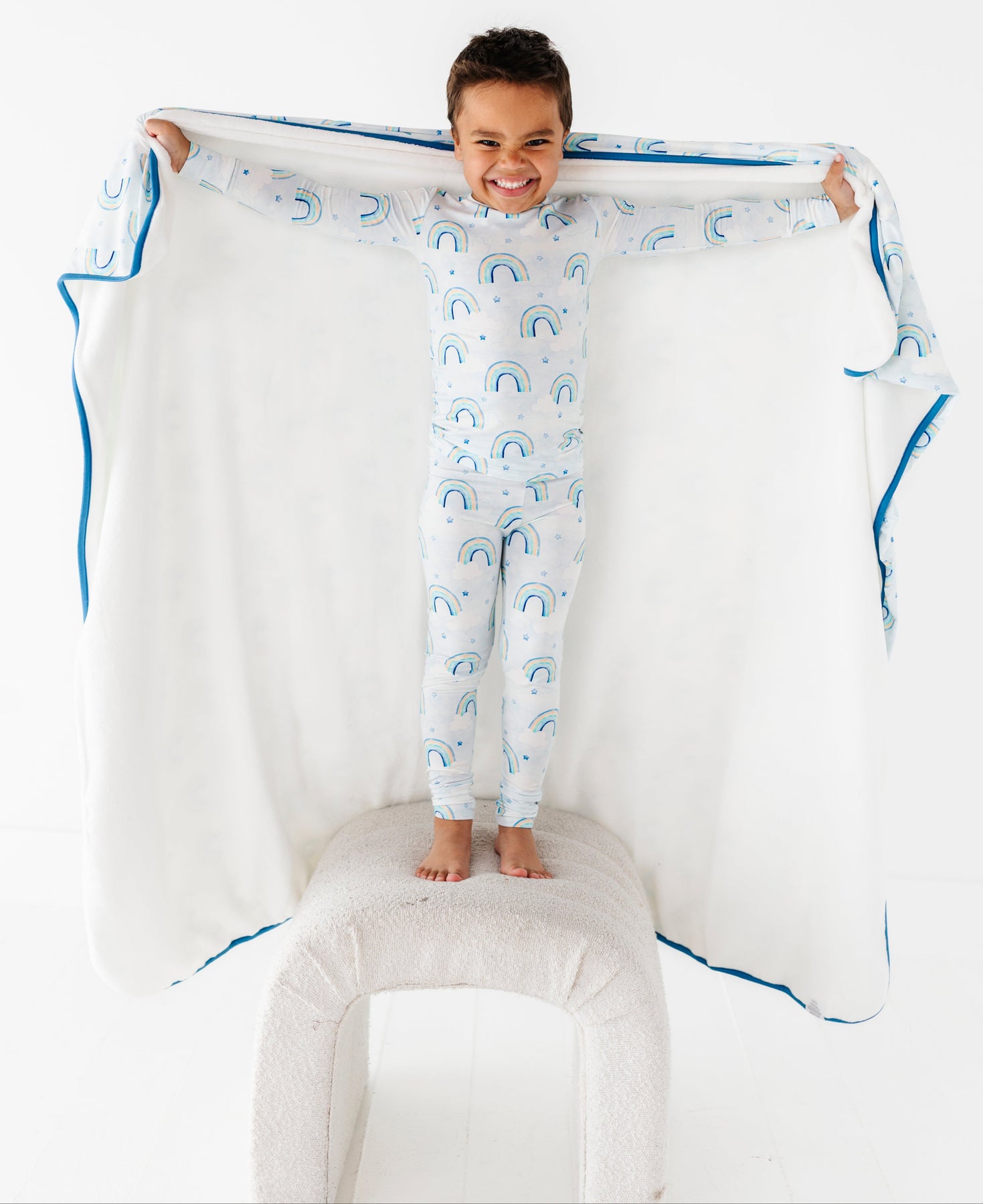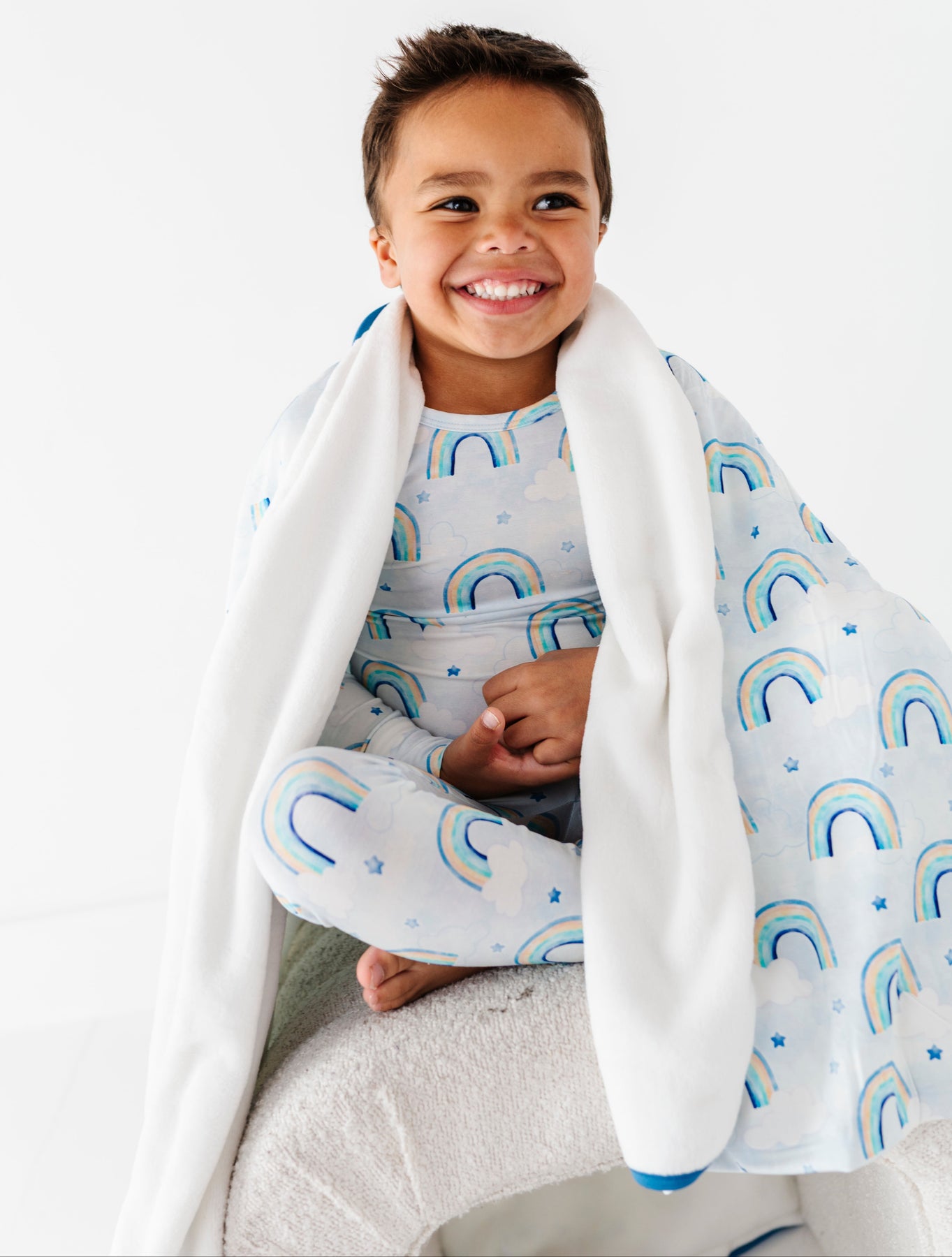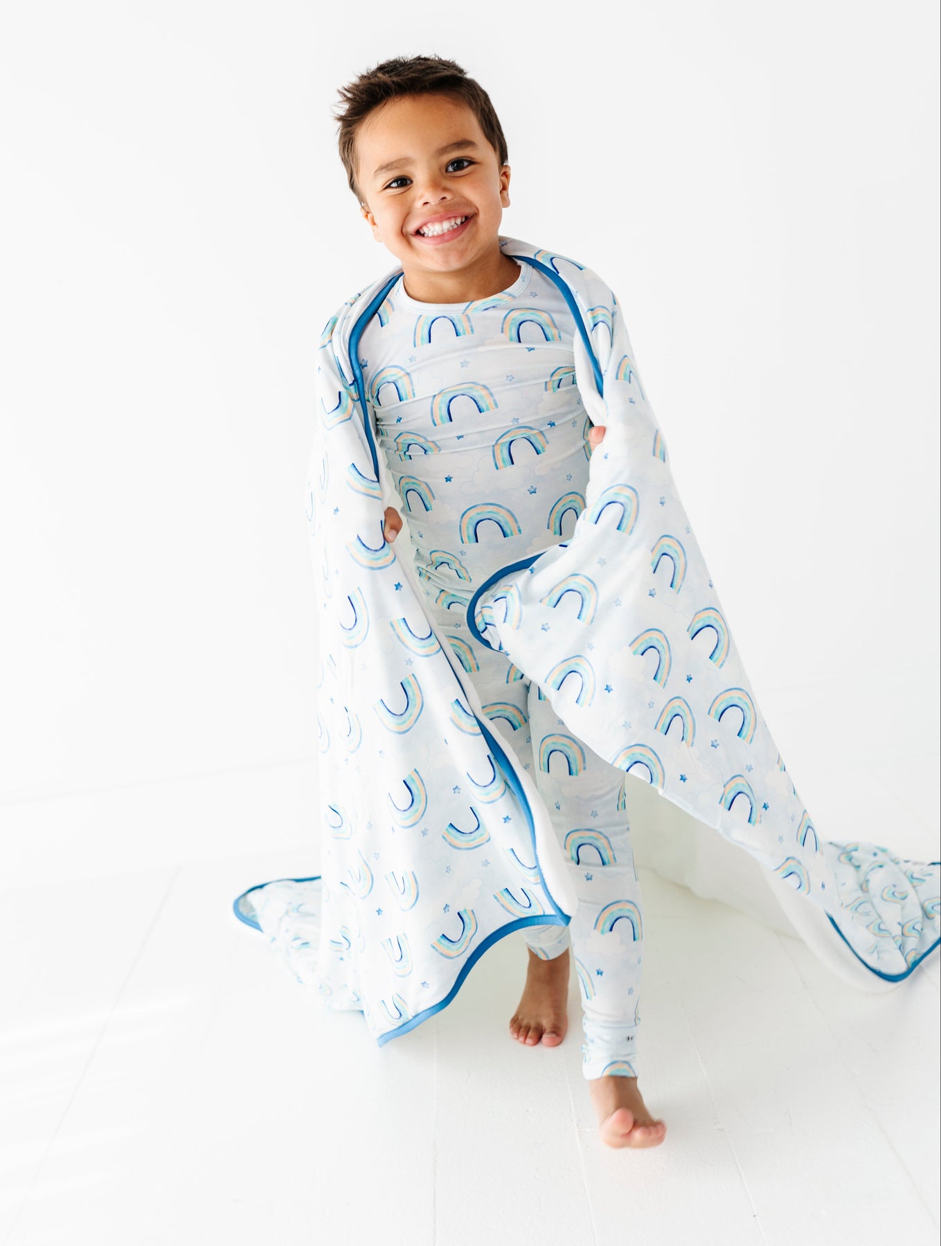 Child in bamboo pajamas with watercolor rainbow pattern holding a matching bamboo blanket with blue trim on a white background