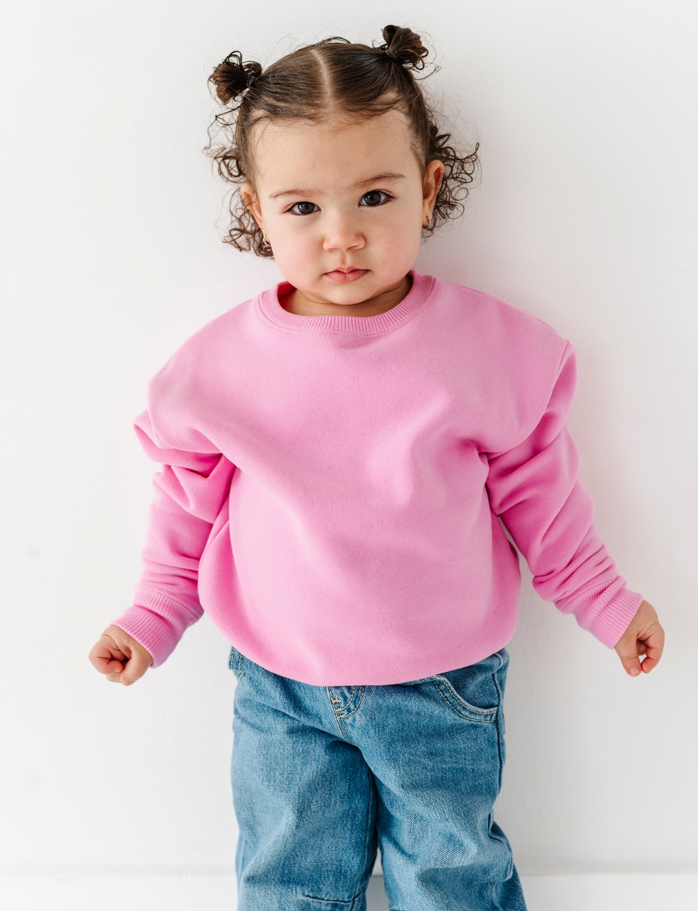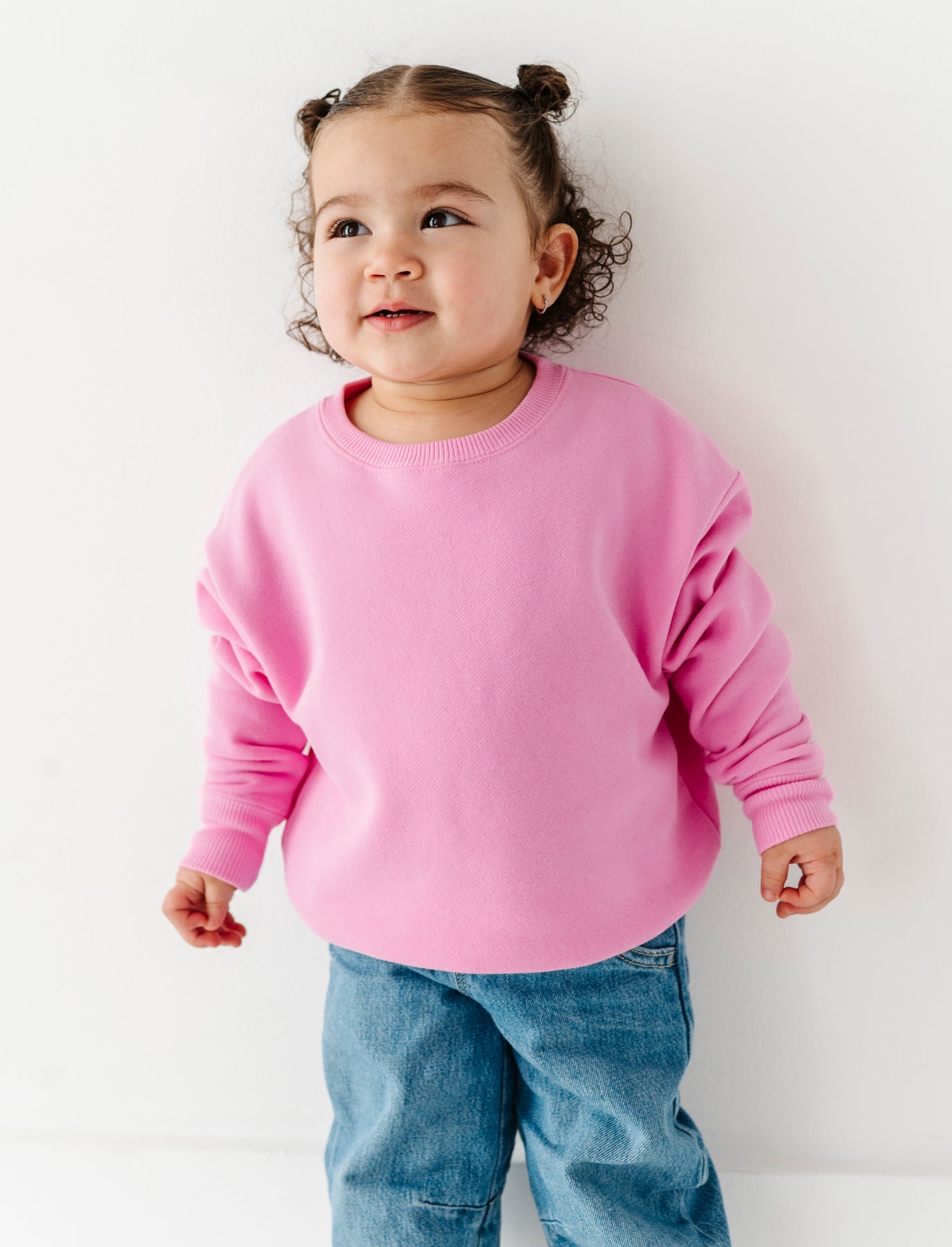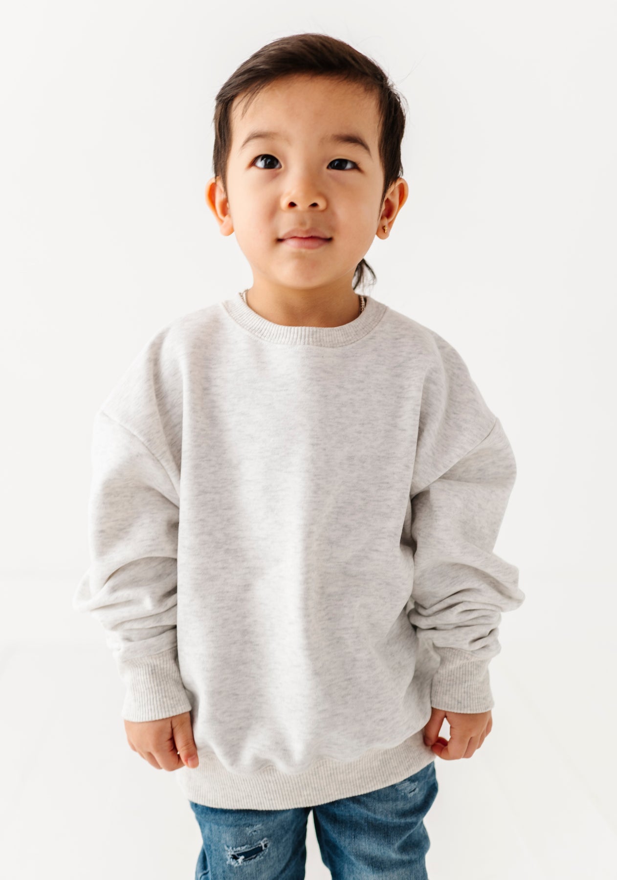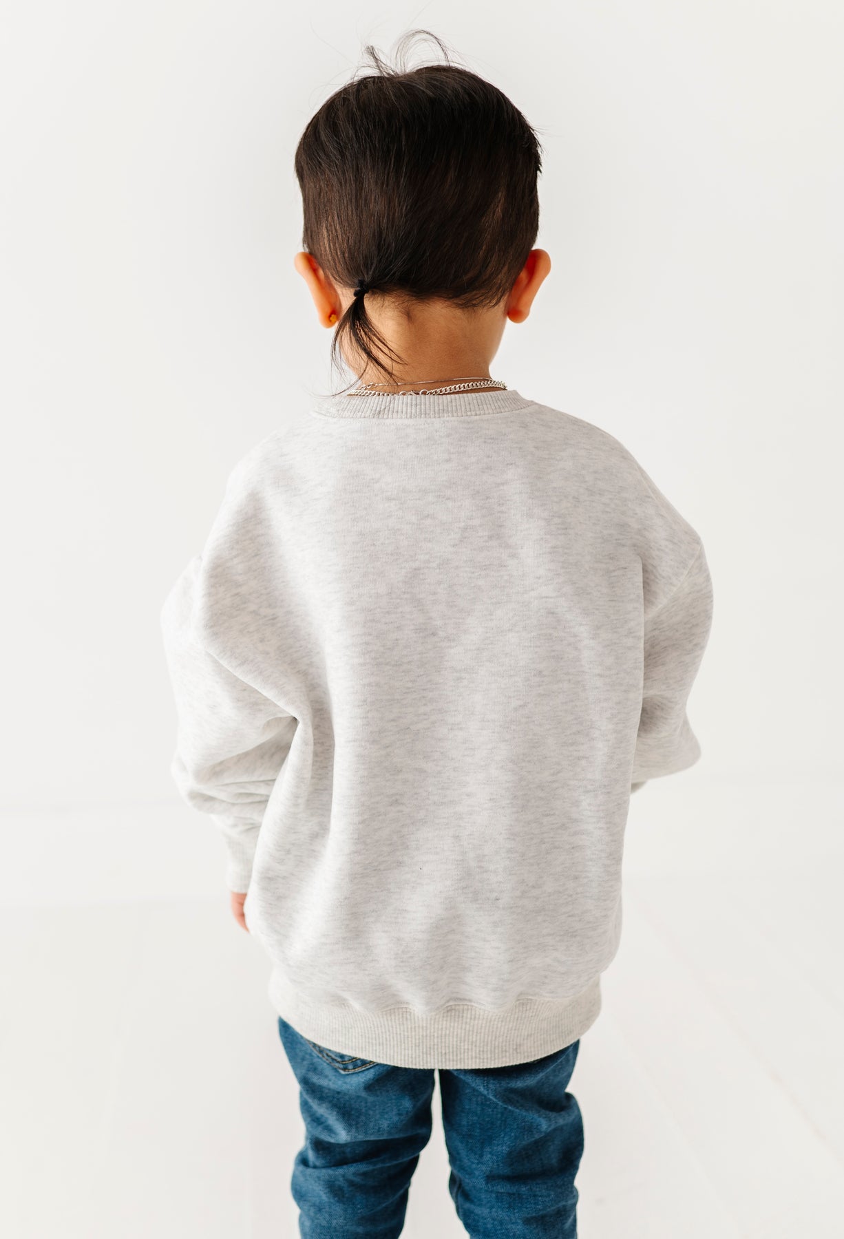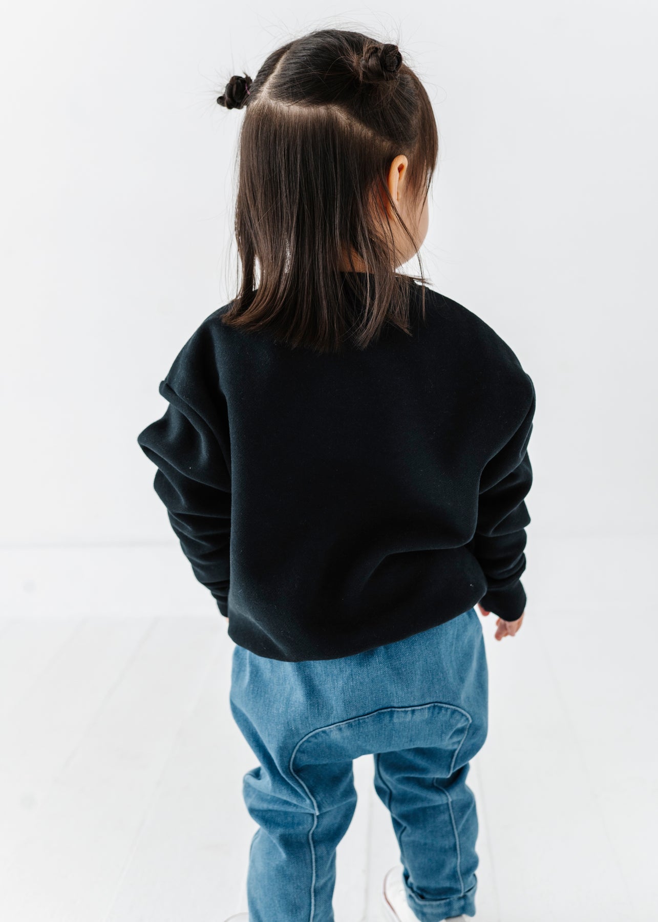 Made from a cozy cotton-poly terry blend with a soft fleece interior, this crewneck is perfect for cooler days, school outfits, playdates, and laid-back weekends. The relaxed fit allows for easy movement, while ribbed cuffs and hem keep the look polished and comfortable. It’s an easy grab-and-go piece that still feels special.