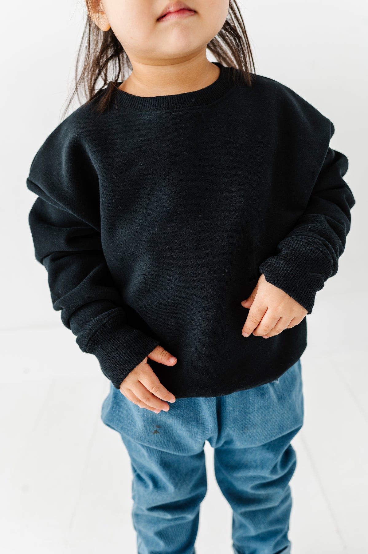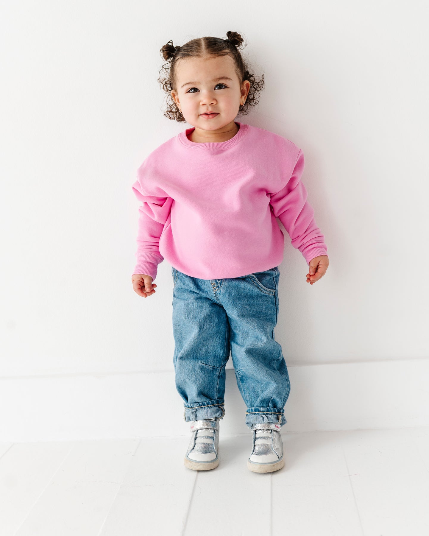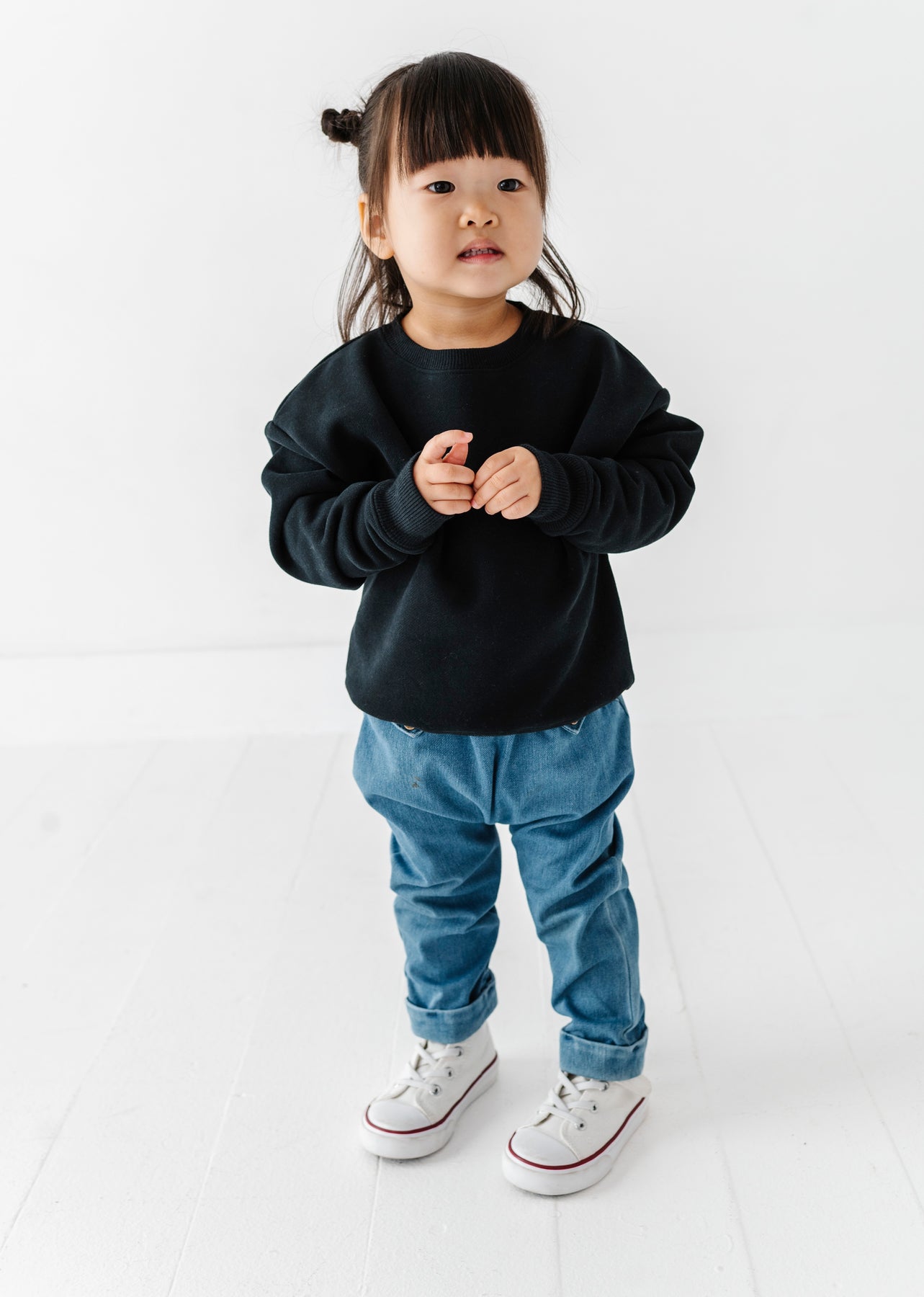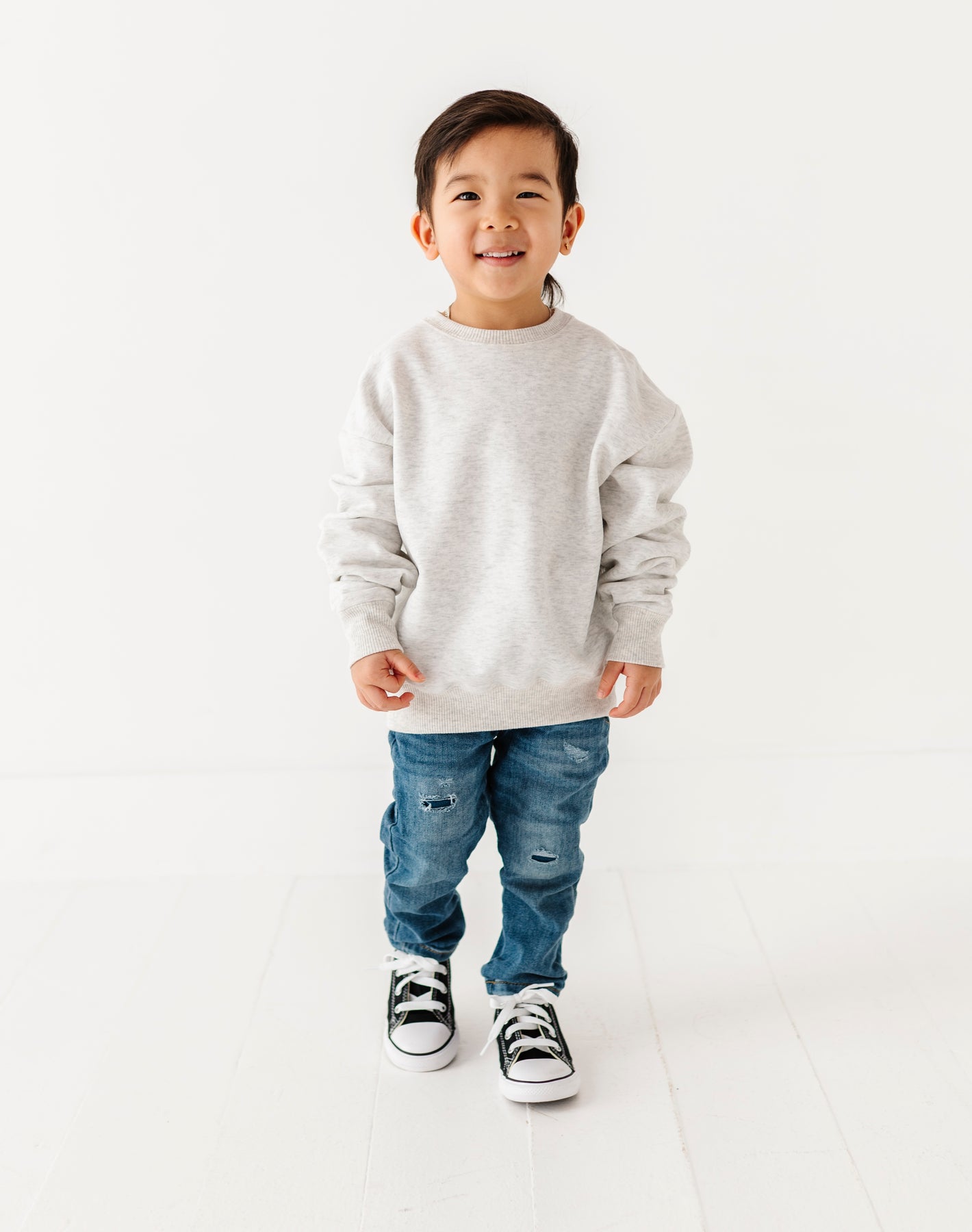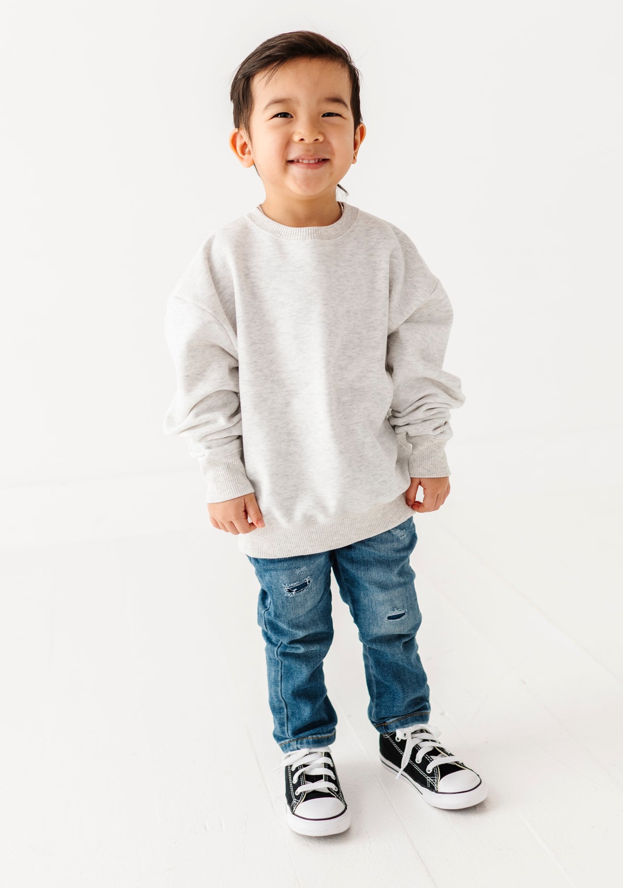 Made from a cozy cotton-poly terry blend with a soft fleece interior, this crewneck is perfect for cooler days, school outfits, playdates, and laid-back weekends. The relaxed fit allows for easy movement, while ribbed cuffs and hem keep the look polished and comfortable. It’s an easy grab-and-go piece that still feels special.