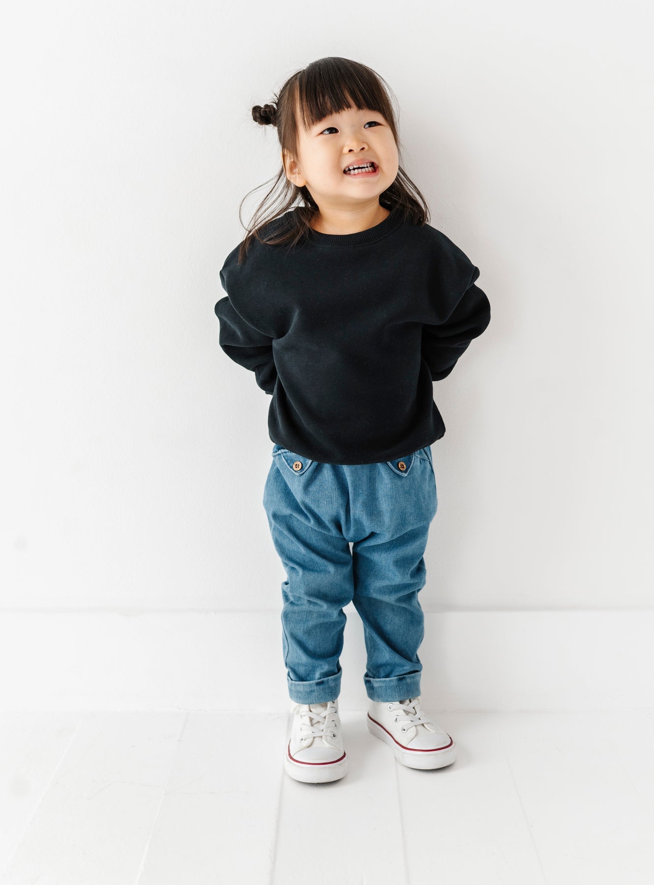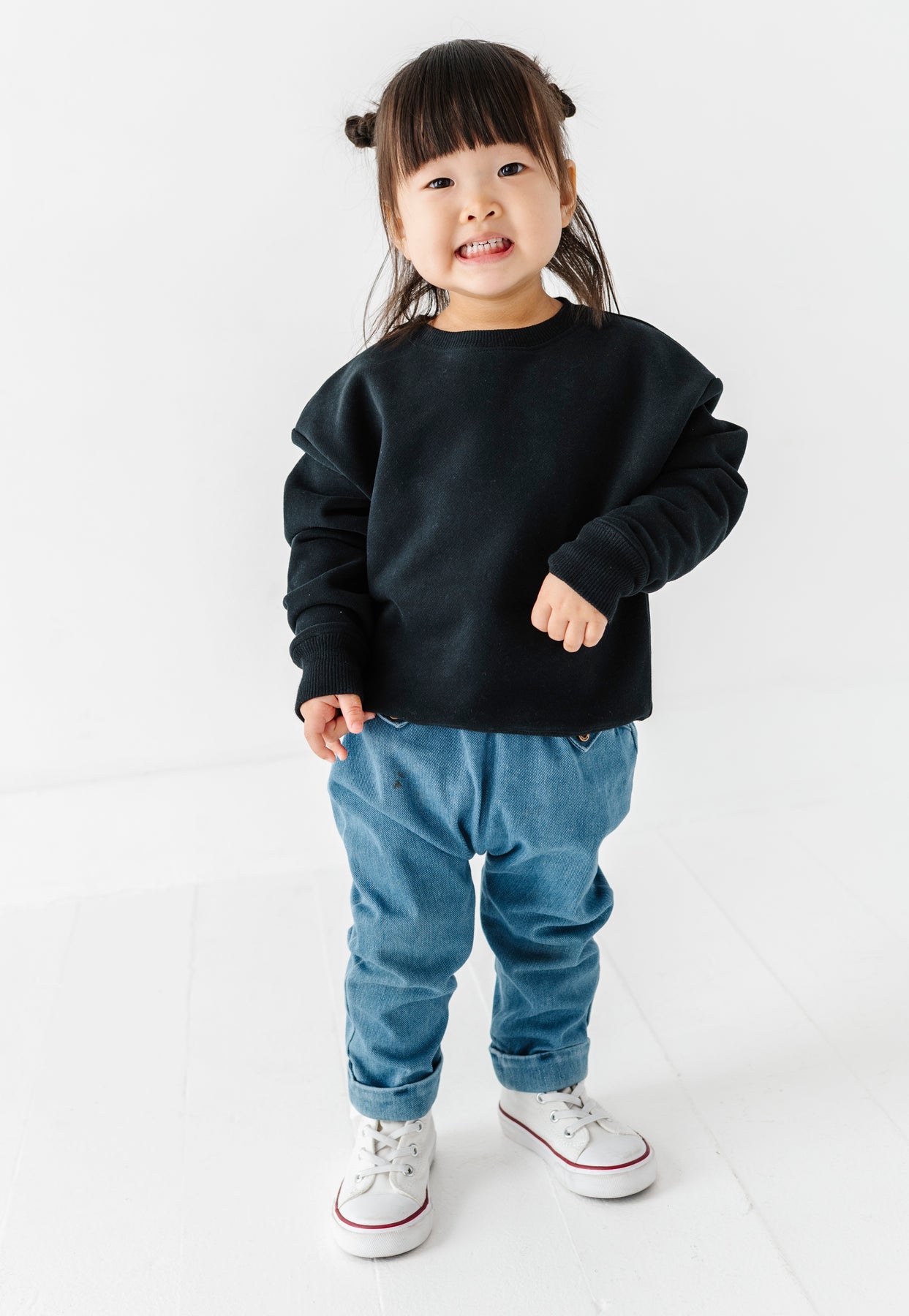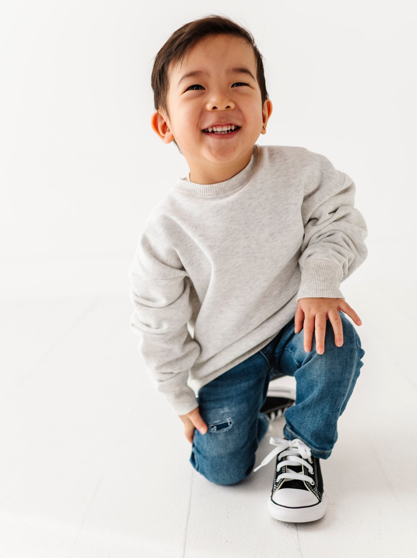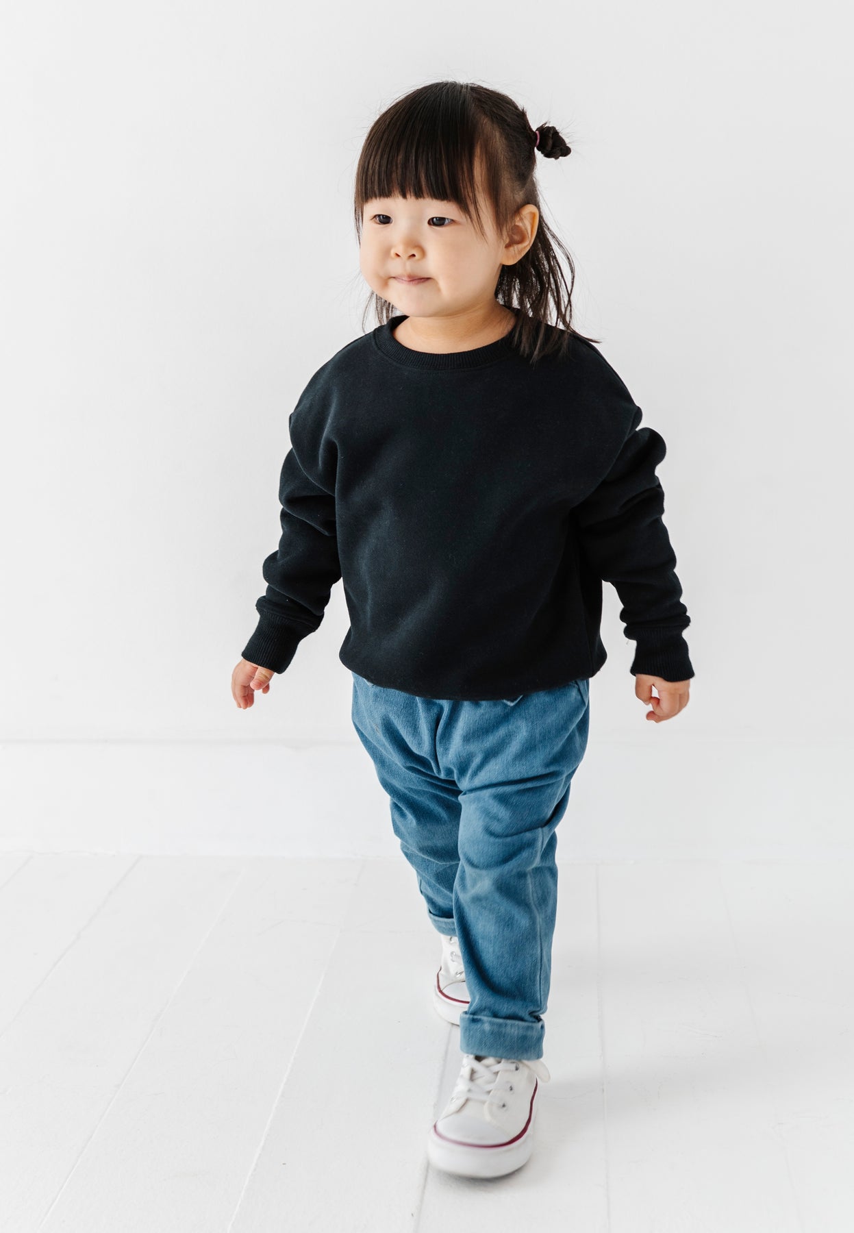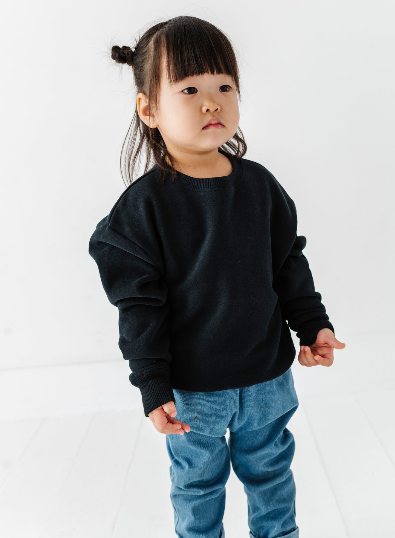 Made from a cozy cotton-poly terry blend with a soft fleece interior, this crewneck is perfect for cooler days, school outfits, playdates, and laid-back weekends. The relaxed fit allows for easy movement, while ribbed cuffs and hem keep the look polished and comfortable. It’s an easy grab-and-go piece that still feels special.