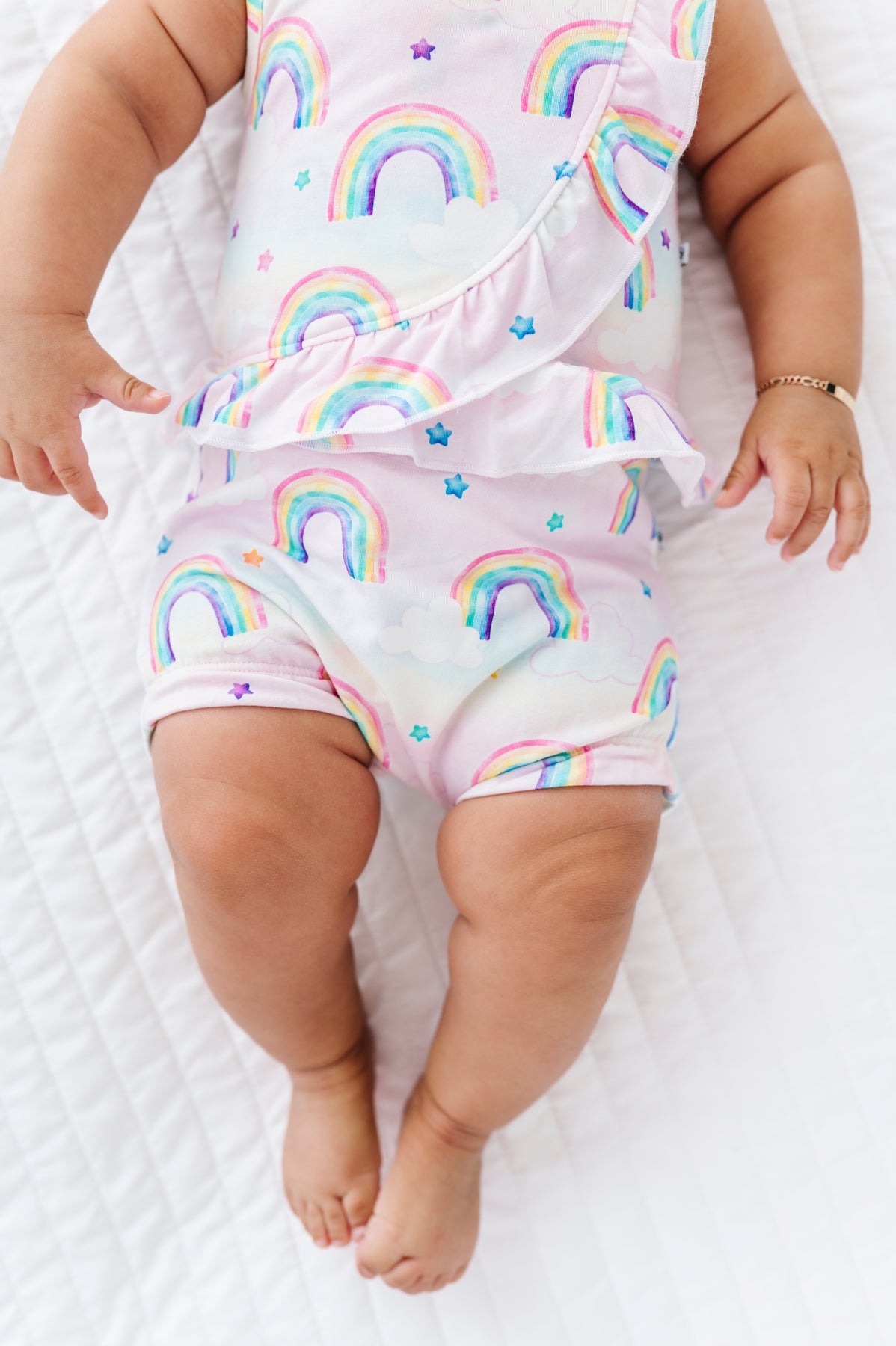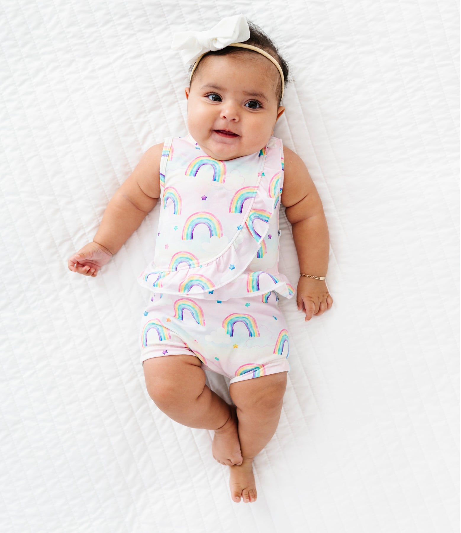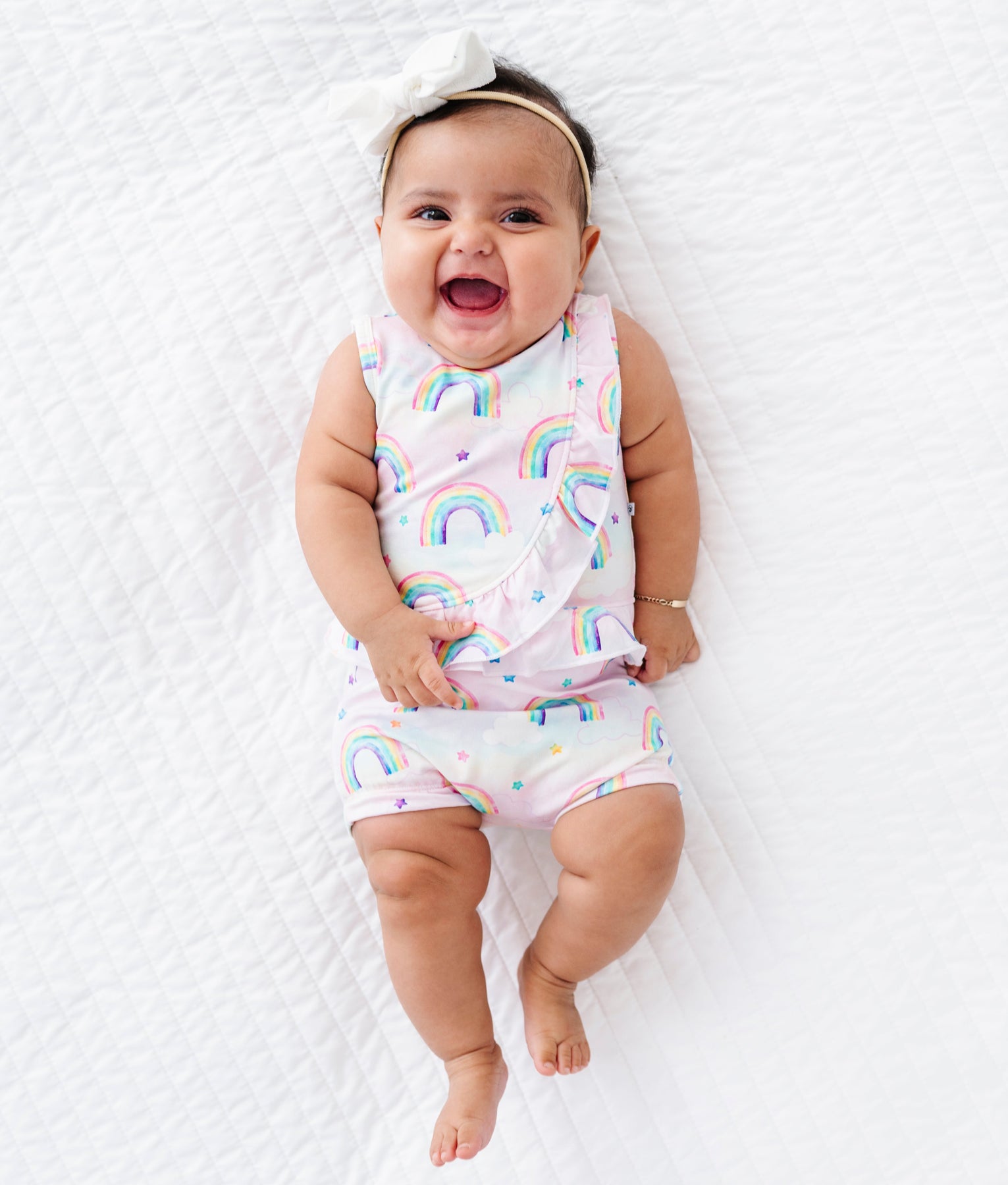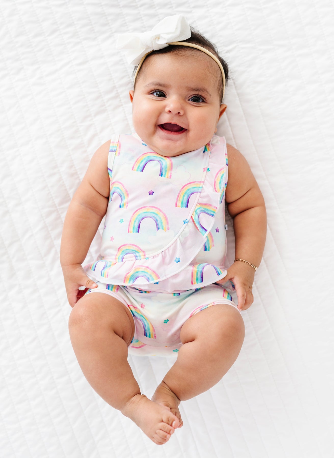 Baby wearing a bamboo cotton peplum top and bloomers set with watercolor rainbow patterns on a white blanket