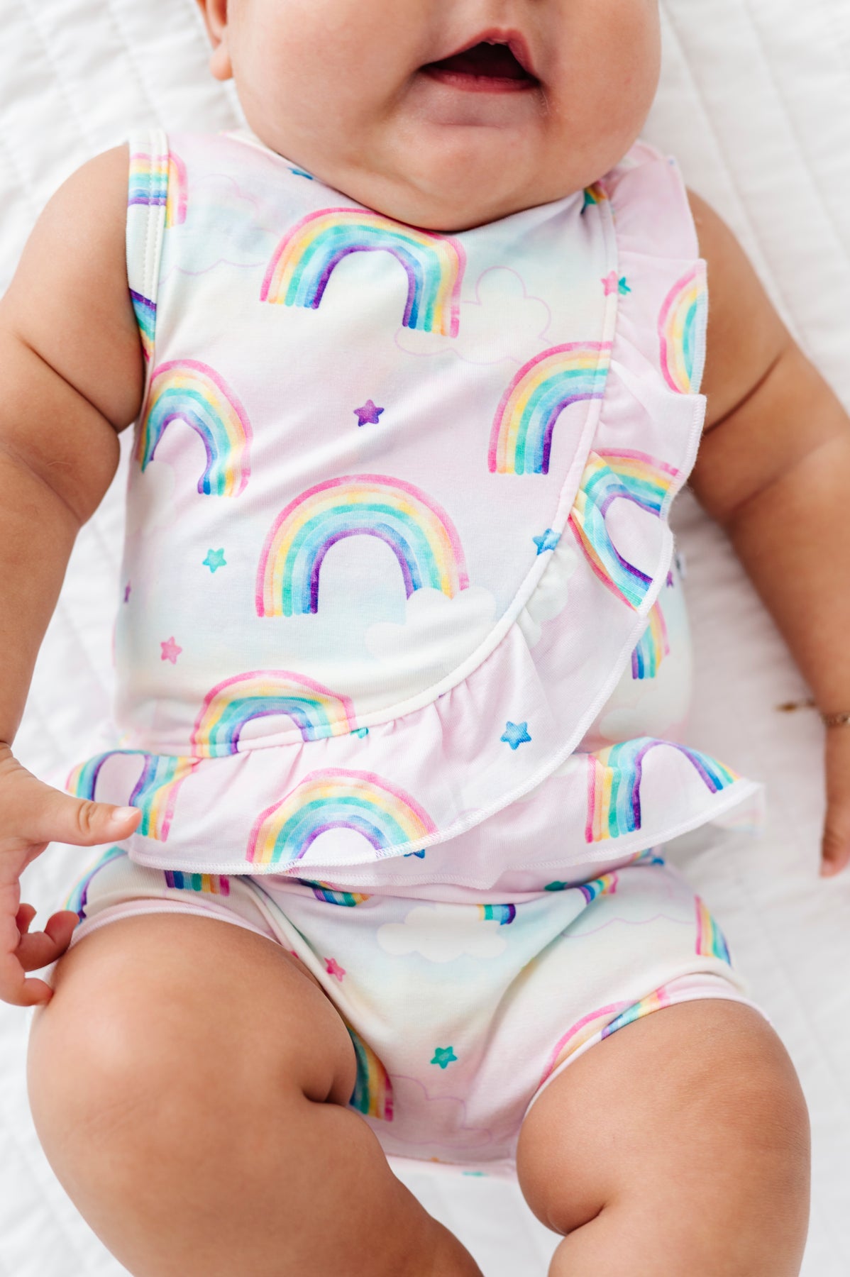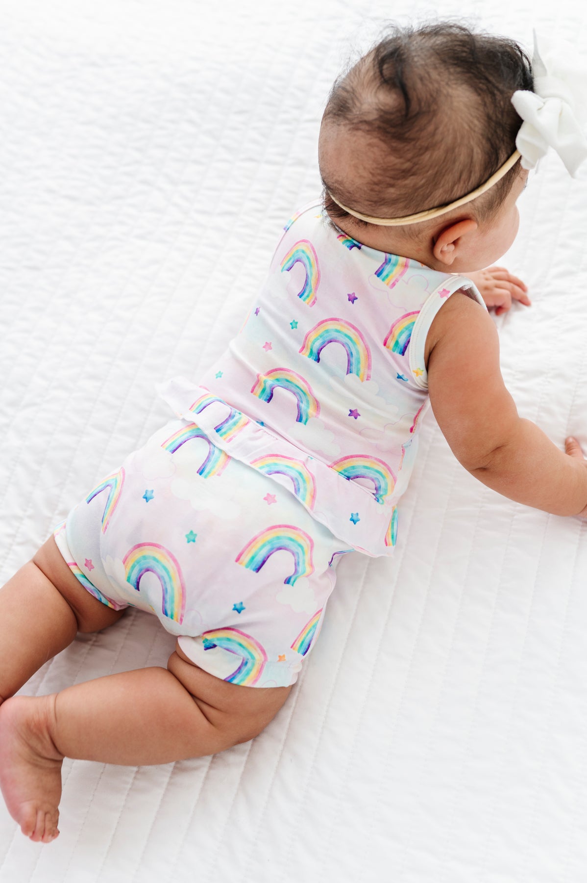 Baby wearing a sleeveless bamboo cotton peplum top and bloomers with watercolor rainbow patterns on a plain background