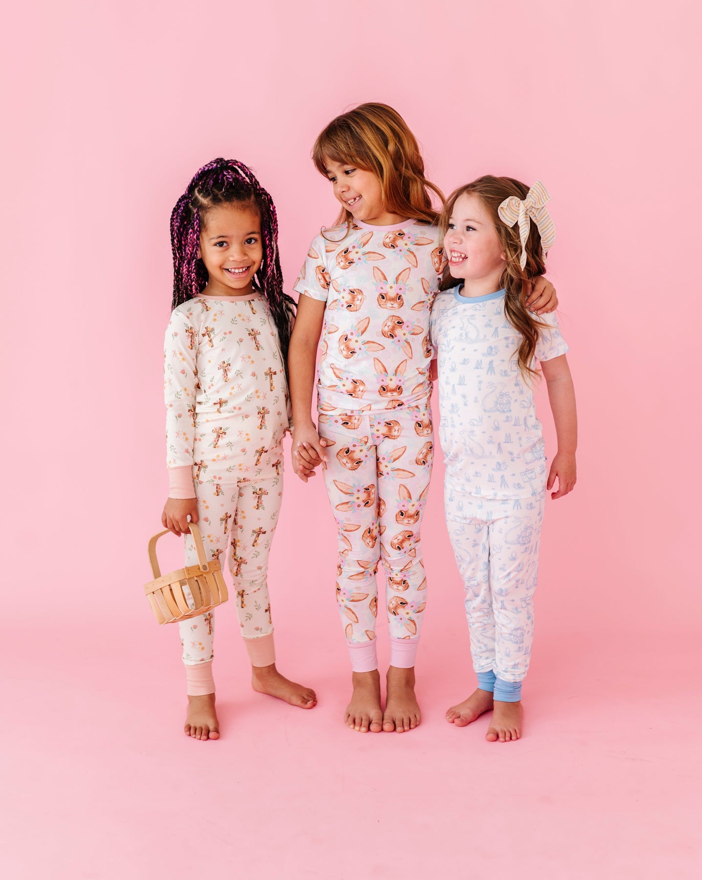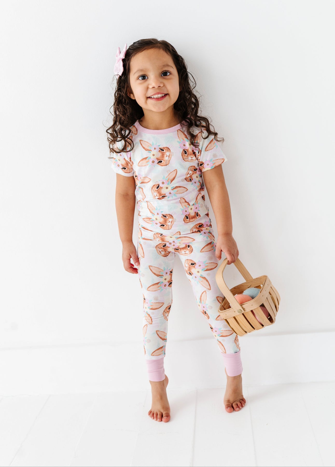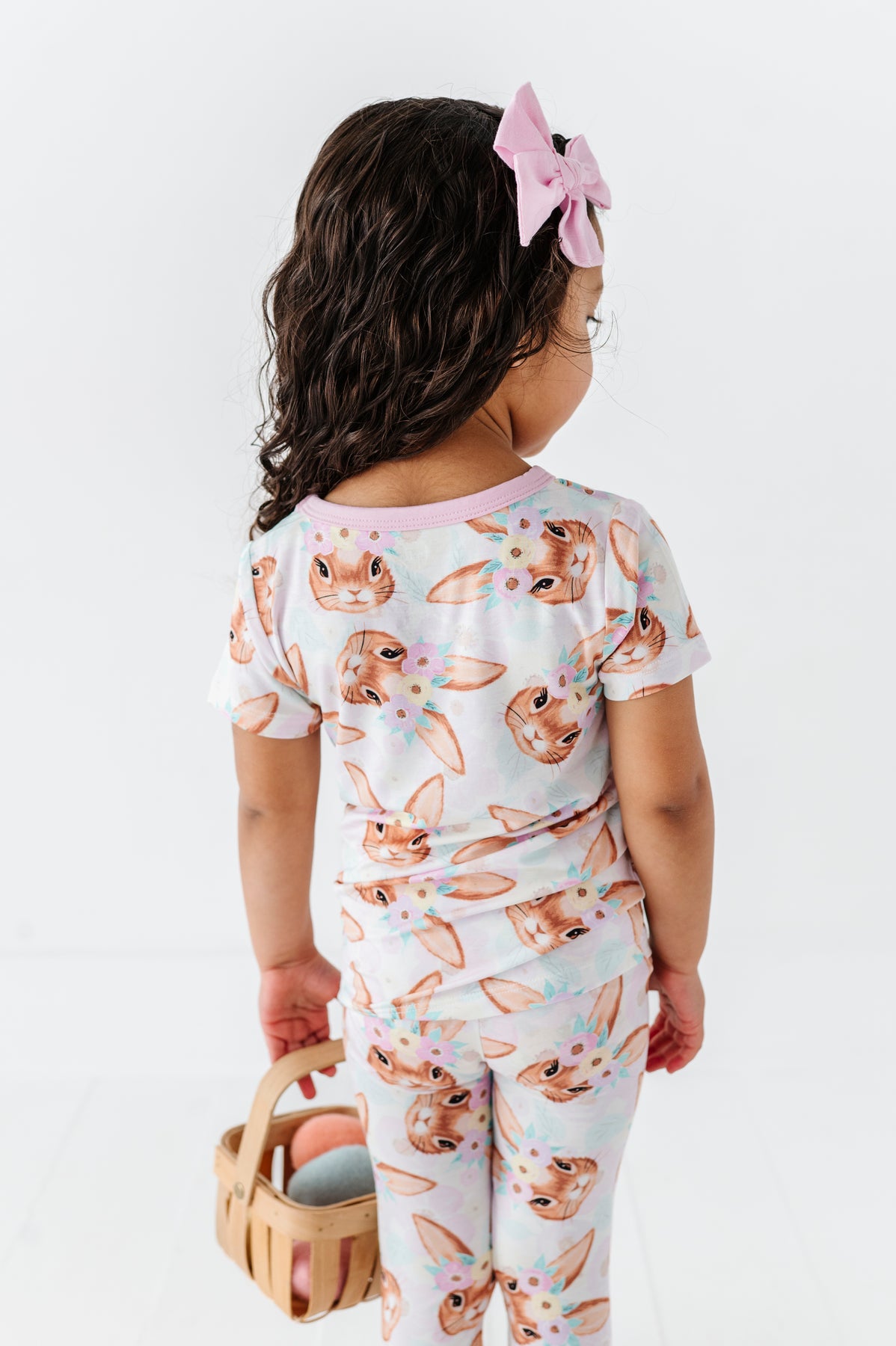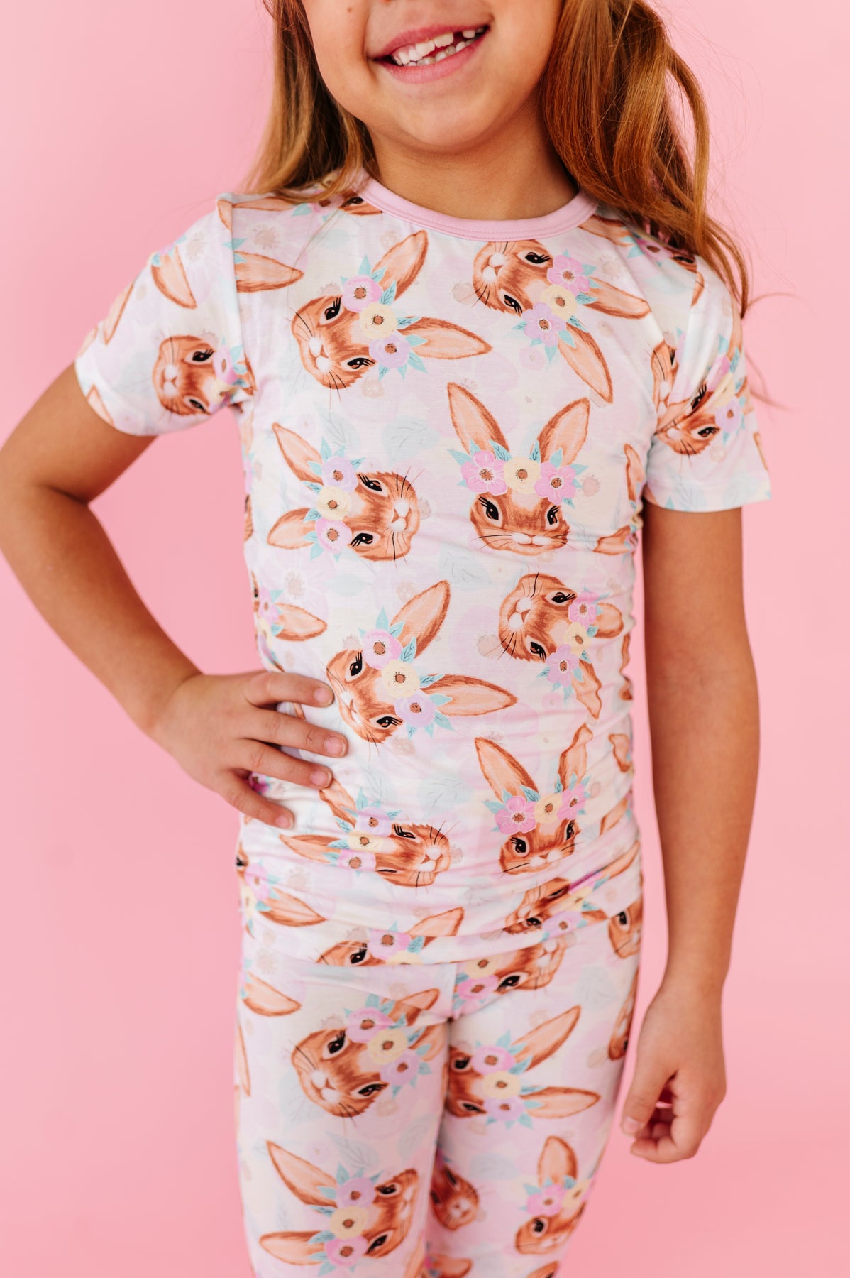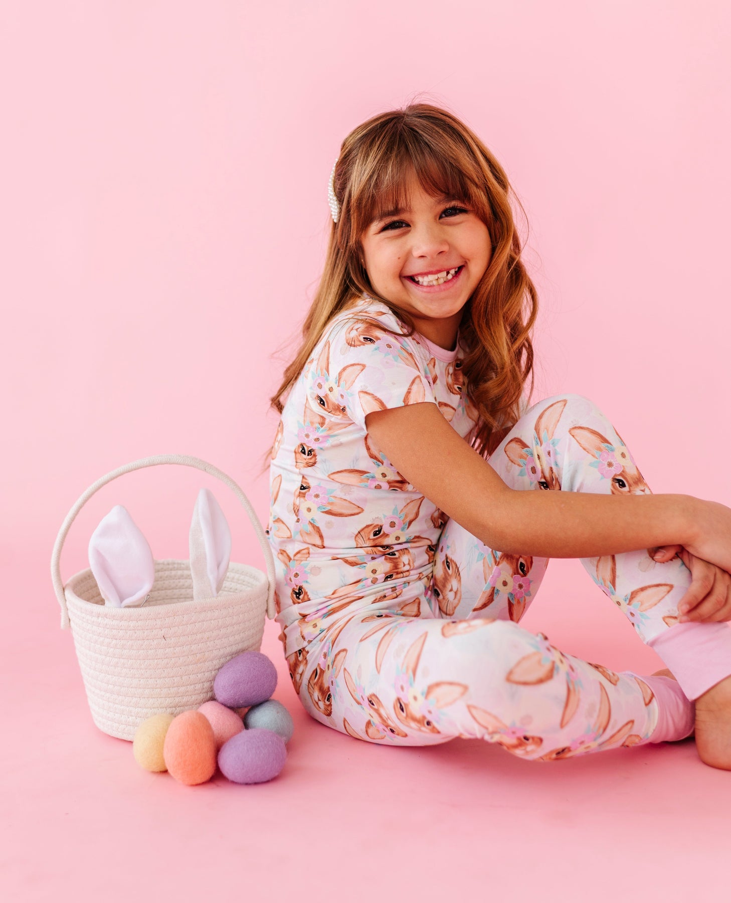 Young girl wearing a floral  and bunny pajama set on a pink background