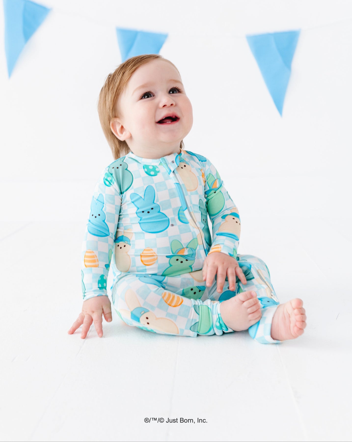 Baby wearing a blue romper with PEEPS® pattern against a white background