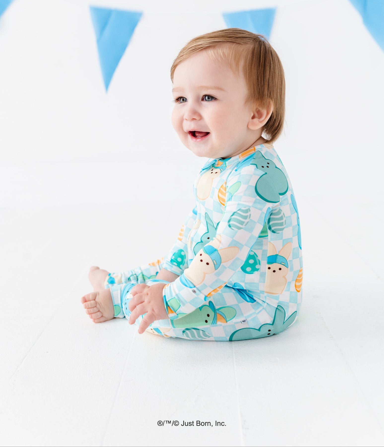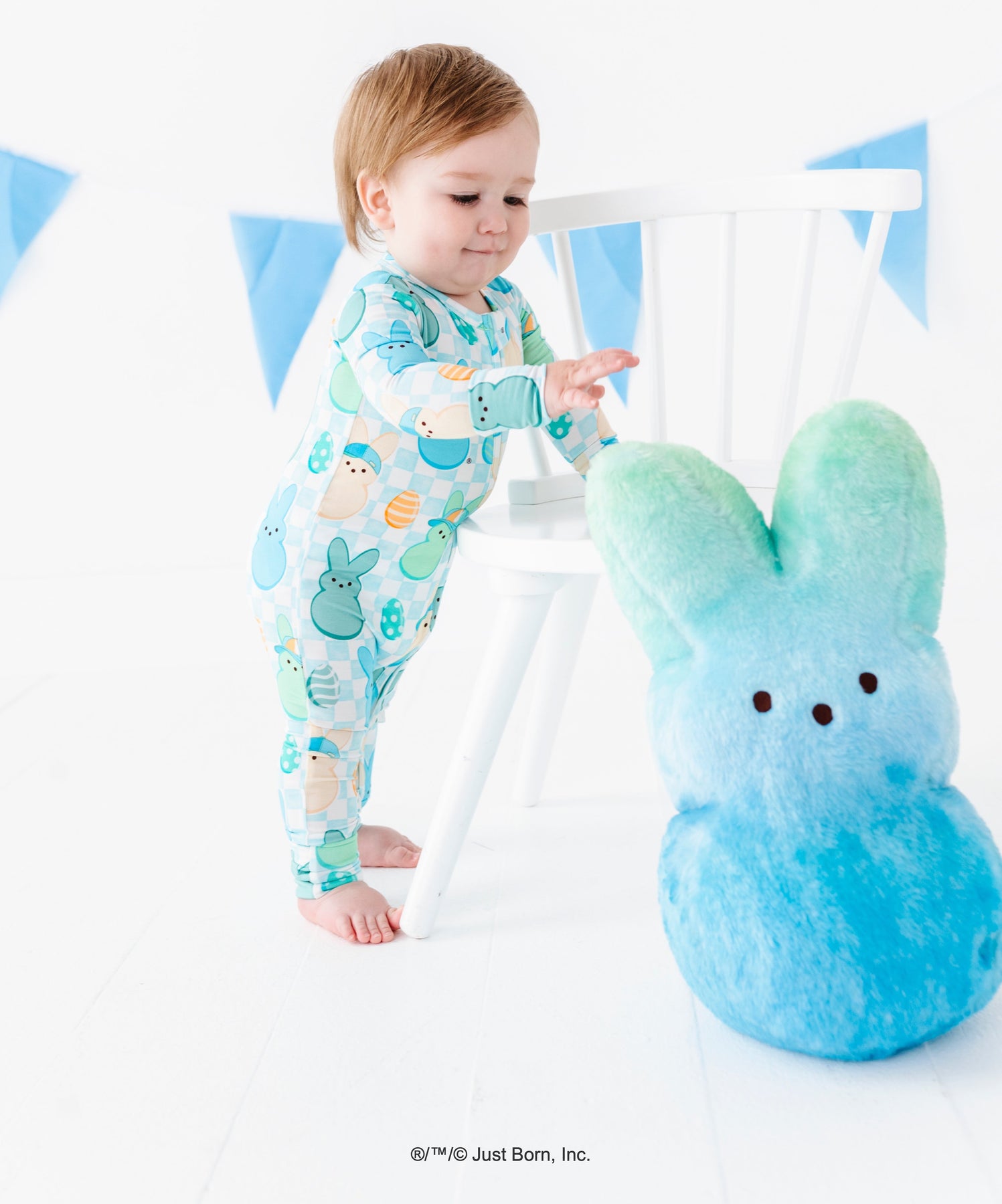Baby in a colorful onesie interacting with a blue bunny PEEPS® plush toy on a white background