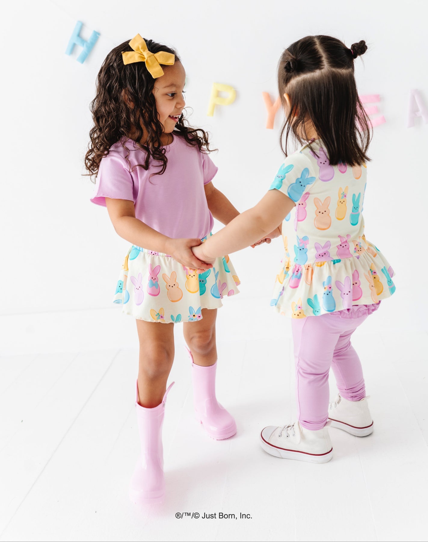 Two young girls wearing colorful Peeps-themed outfits on a white background