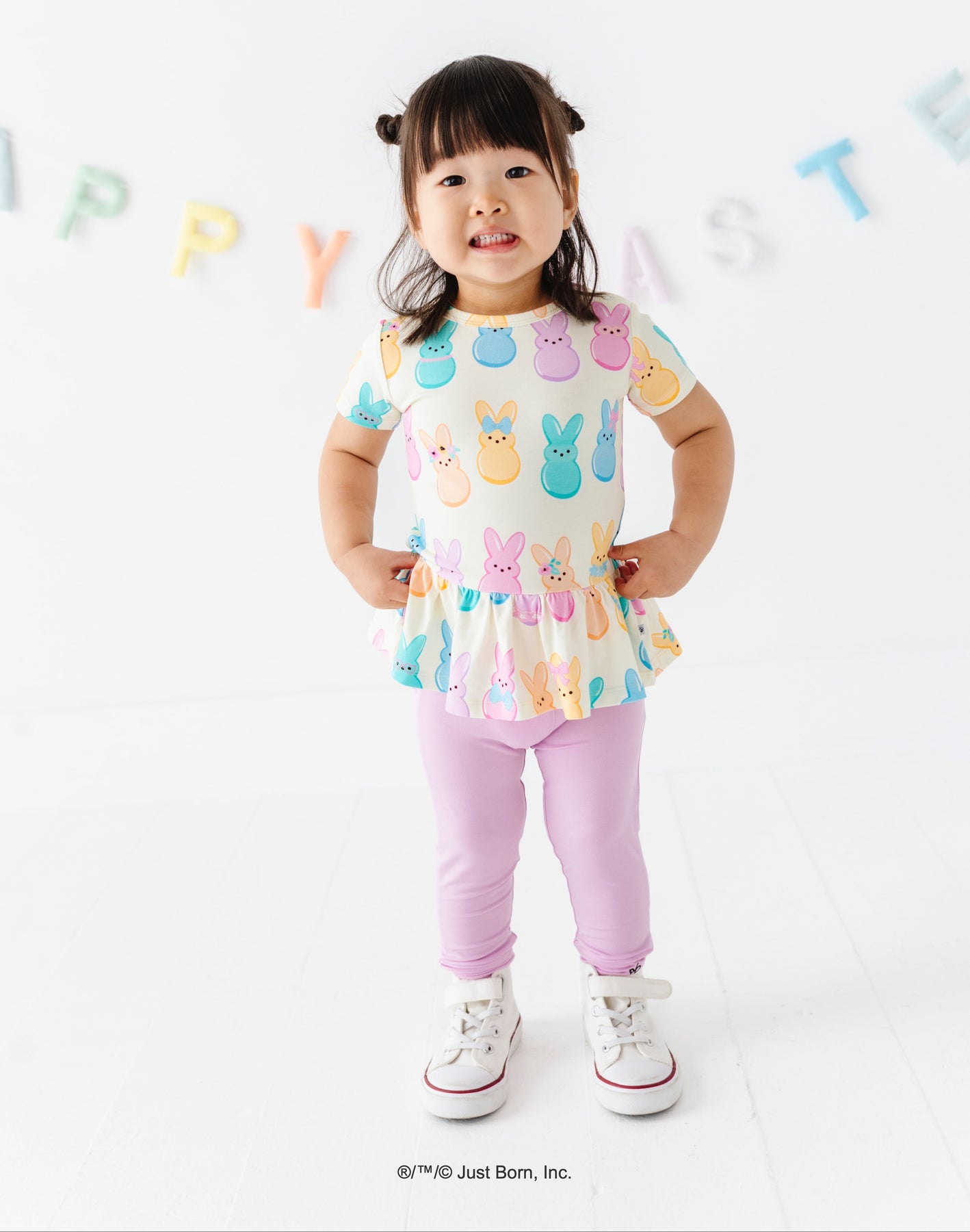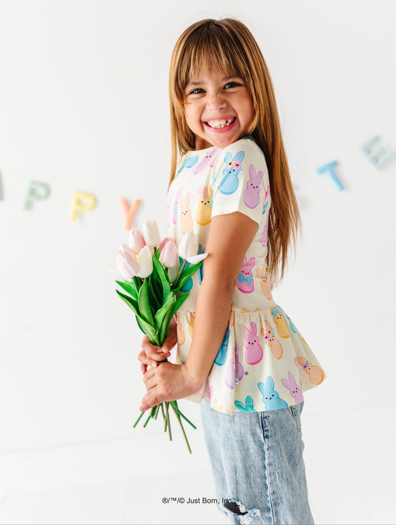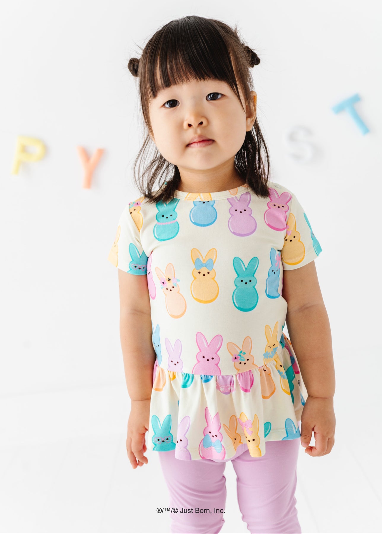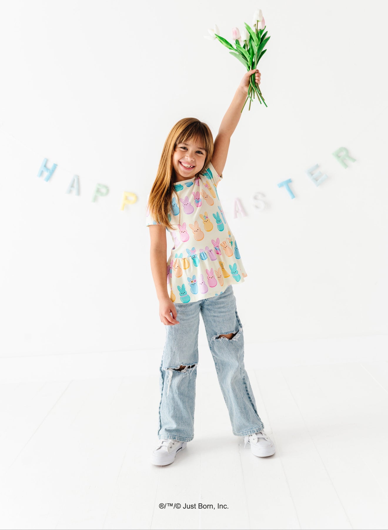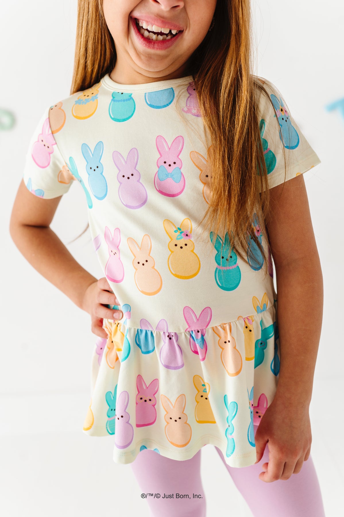 Young girl wearing a top with colorful  PEEPS® bunny print on a white background
