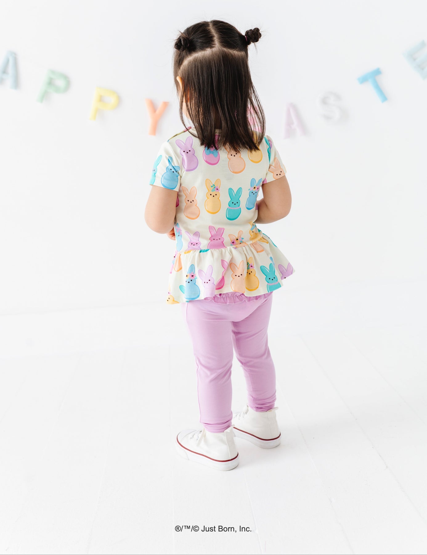 Child wearing a colorful PEEPS®  bunny-themed outfit with a white background