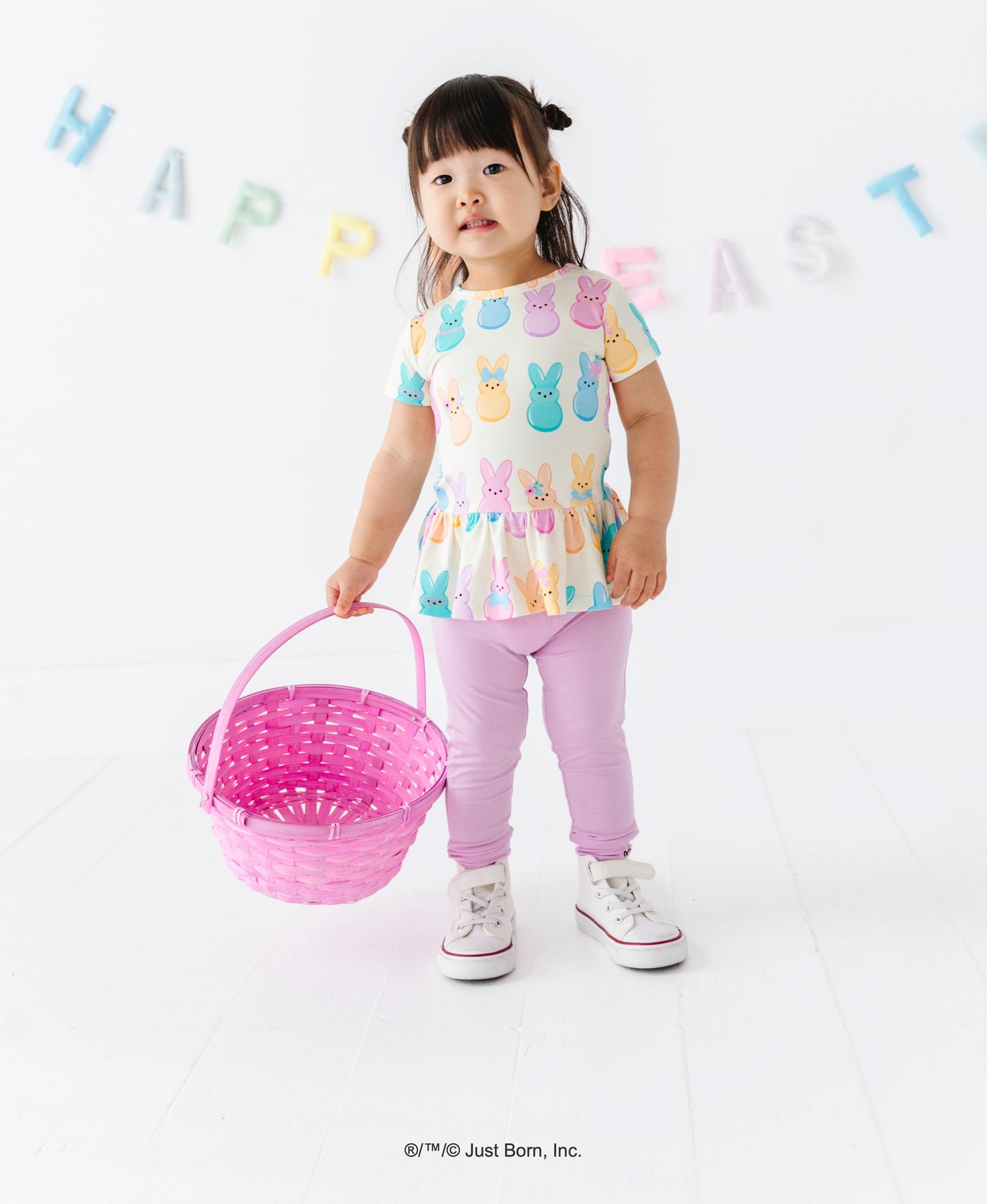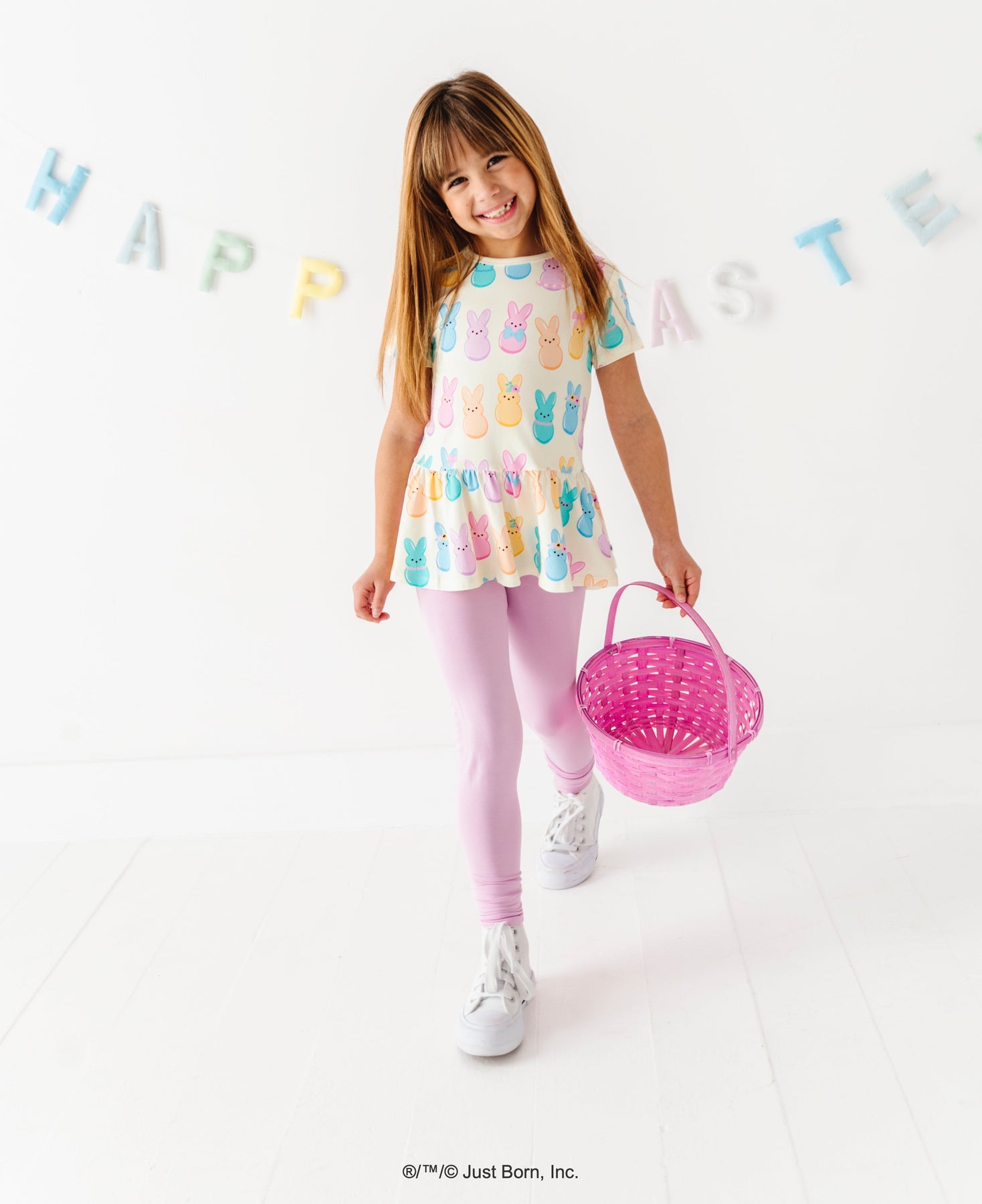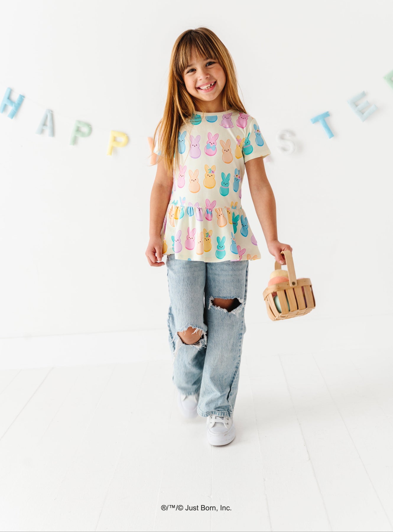 Child wearing a colorful shirt with PEEPS®  bunny designs, holding a pink Easter basket, on a white background with &
