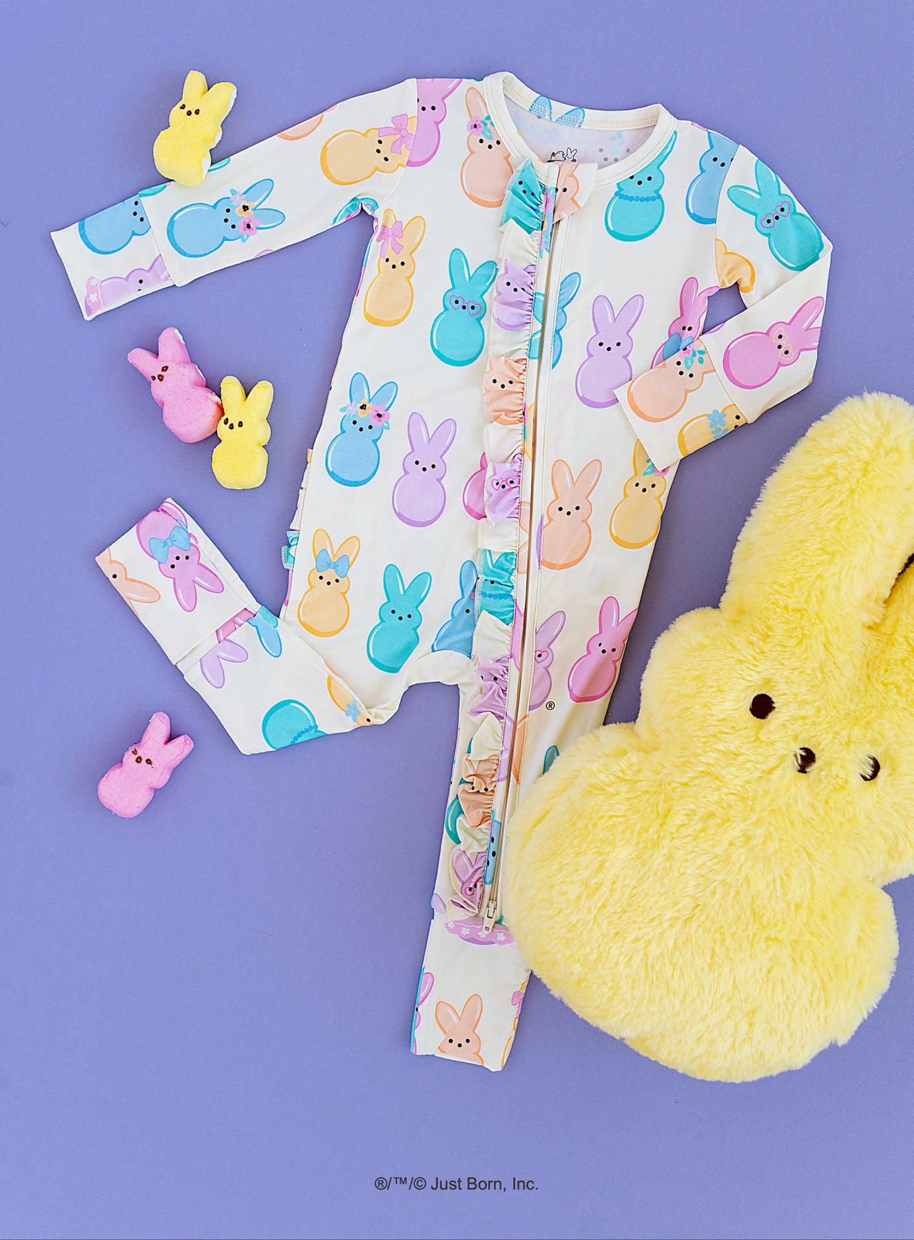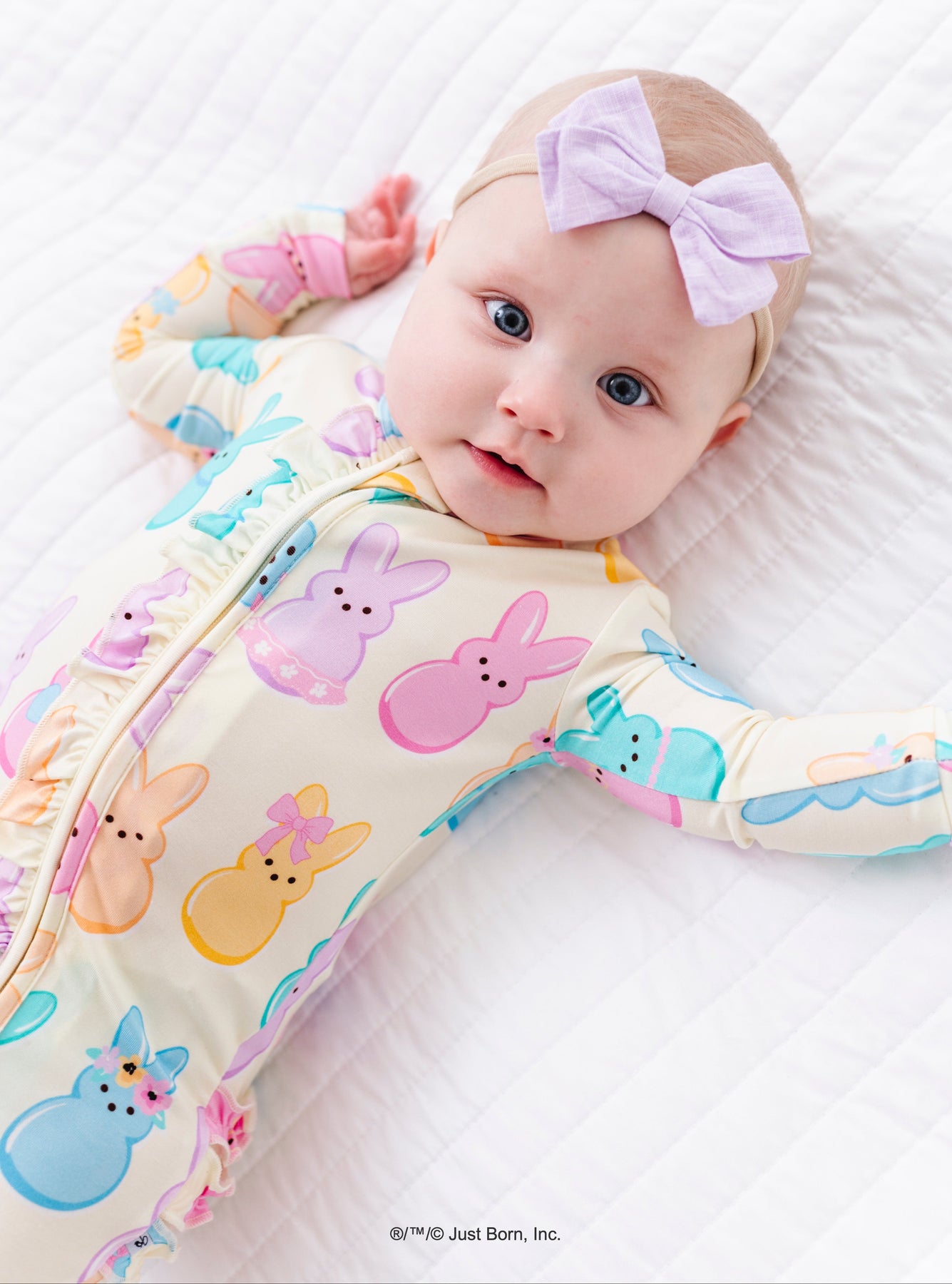 Baby in colorful PEEPS® bunny-themed romper on a white sheet