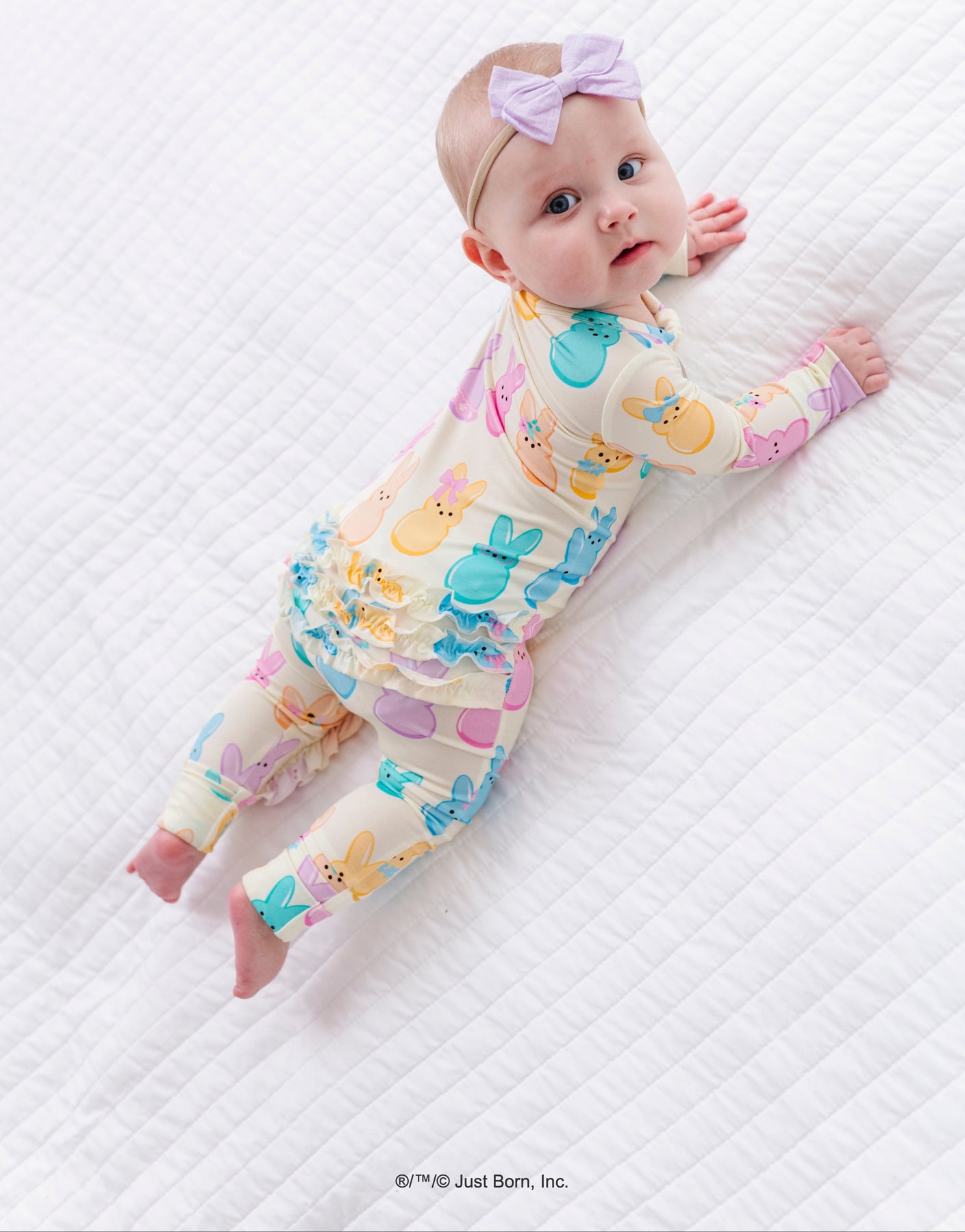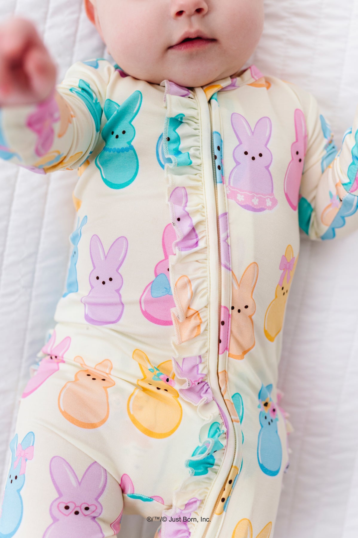 Baby wearing a colorful romper with PEEPS® pattern on a white quilted surface.