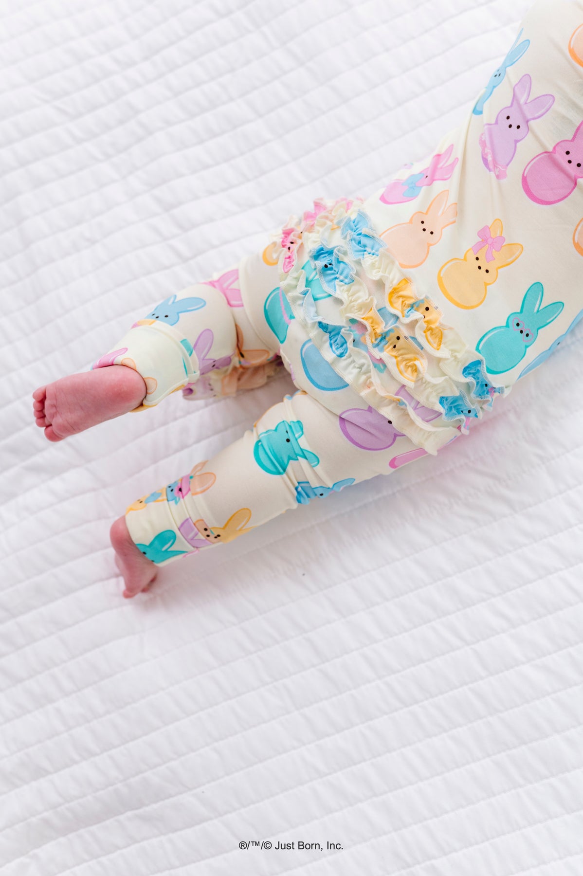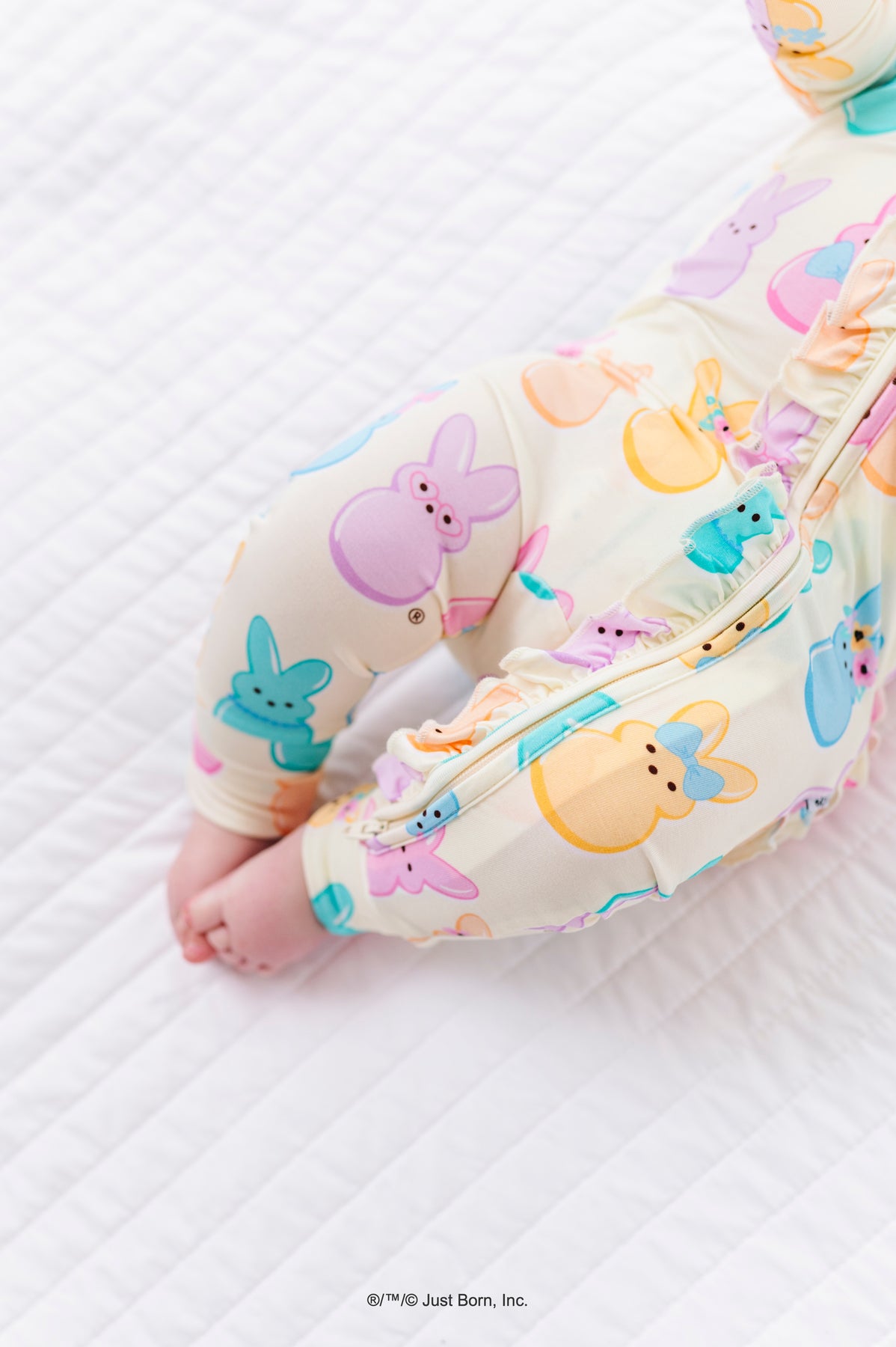 Baby legs wearing colorful romper with PEEPS® design on a white quilted surface.