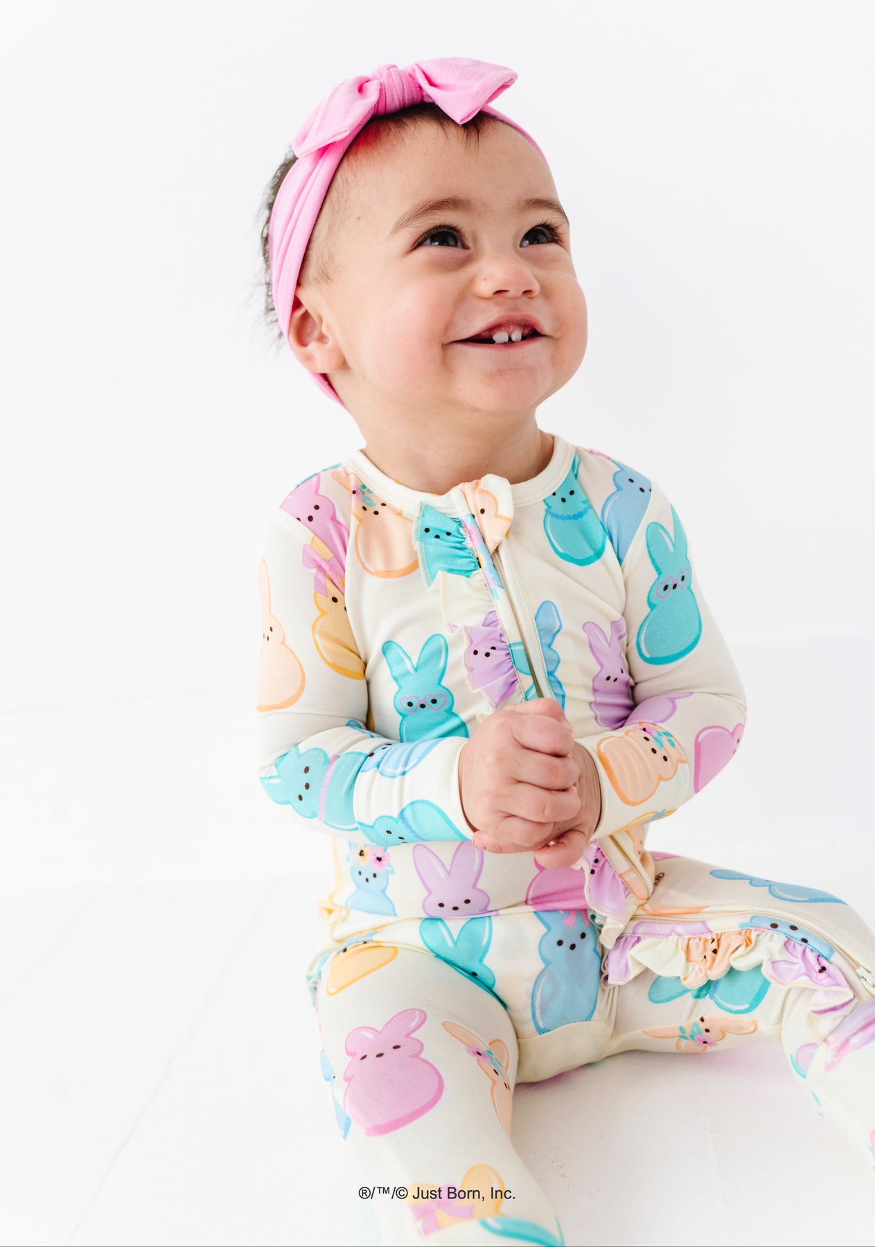 Baby wearing a colorful romper with PEEPS® bunny pattern and a headband on a white background