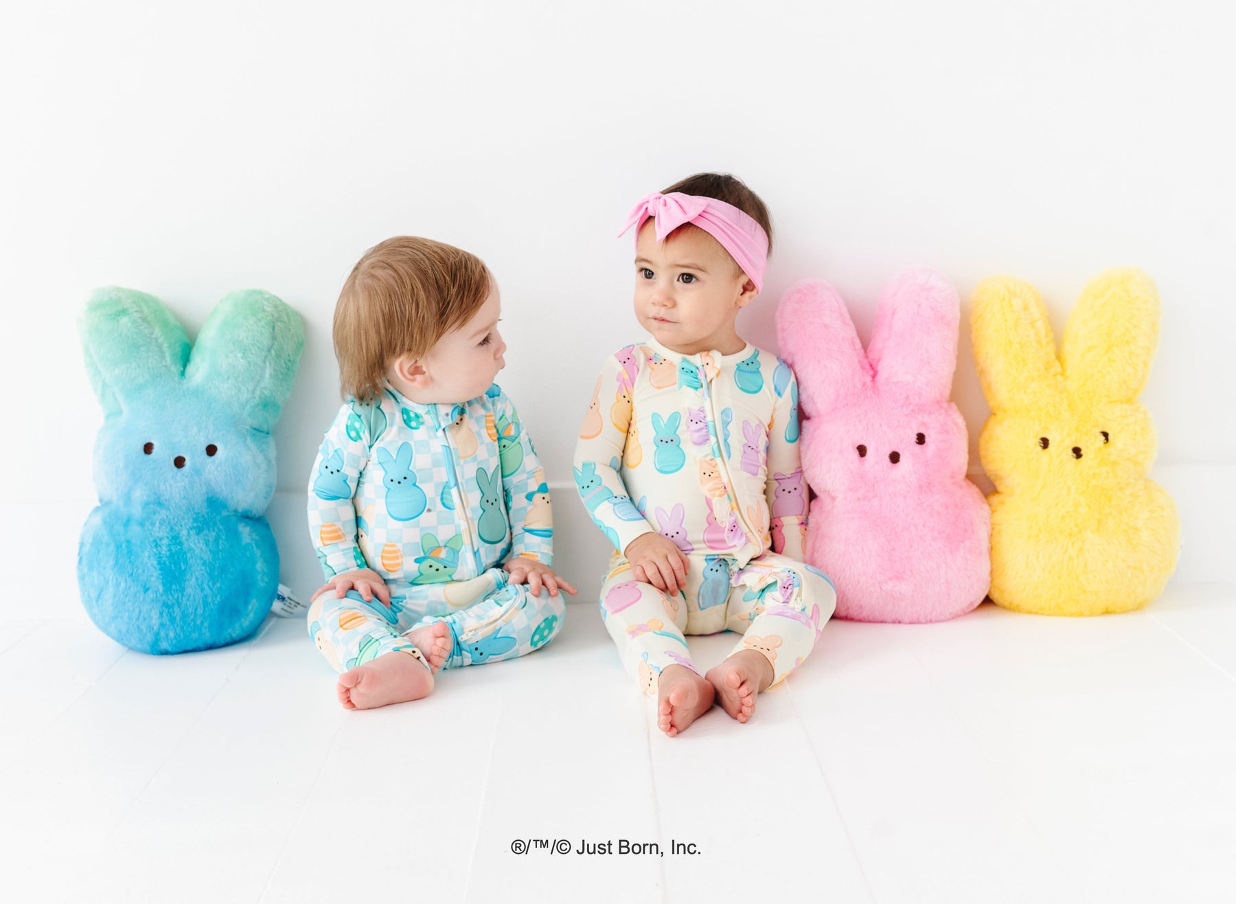 Two children in pajamas sitting between colorful Peeps plush toys on a white background