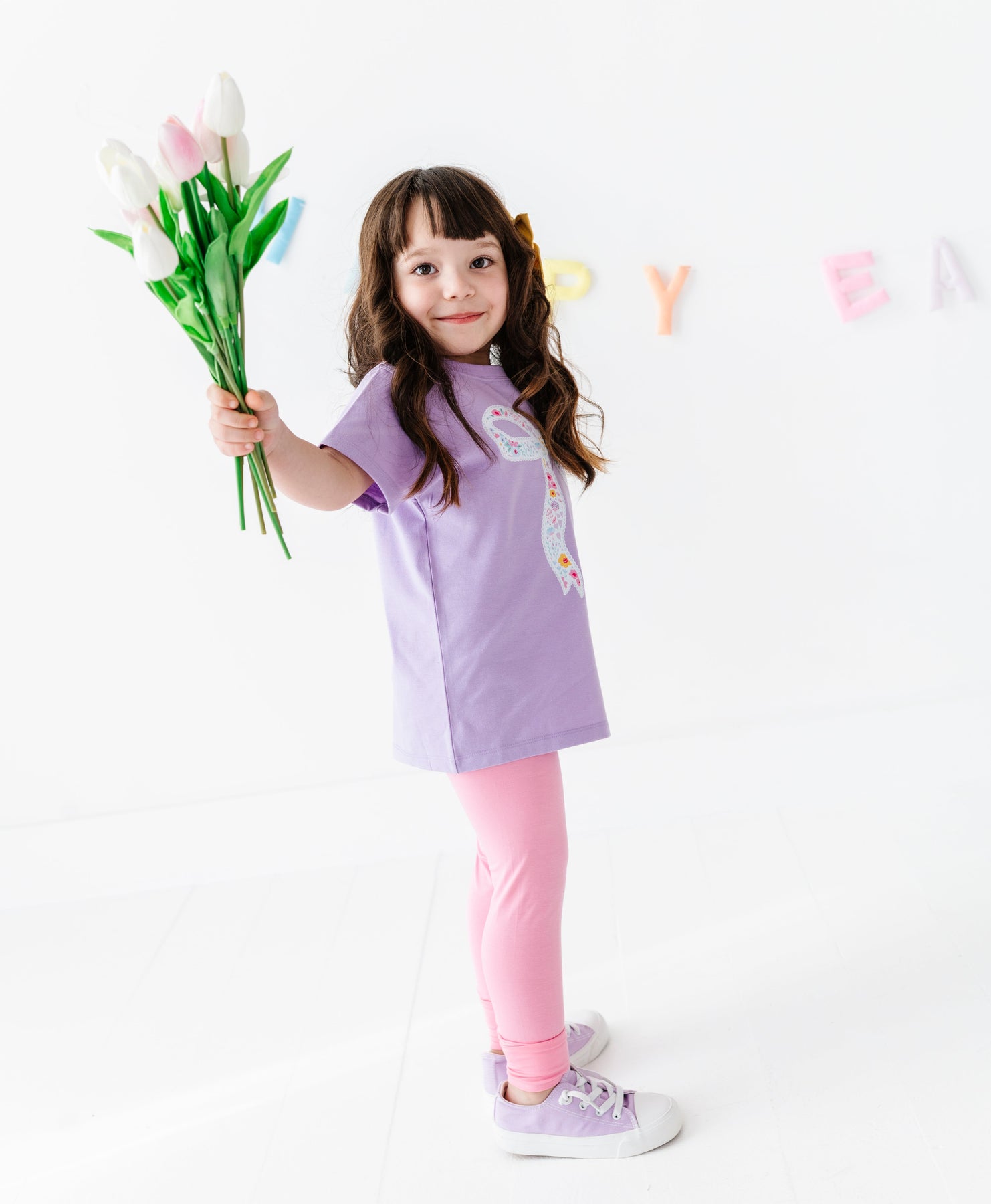 Child wearing a purple shirt with a bow design, holding tulips against a white background with colorful letters.