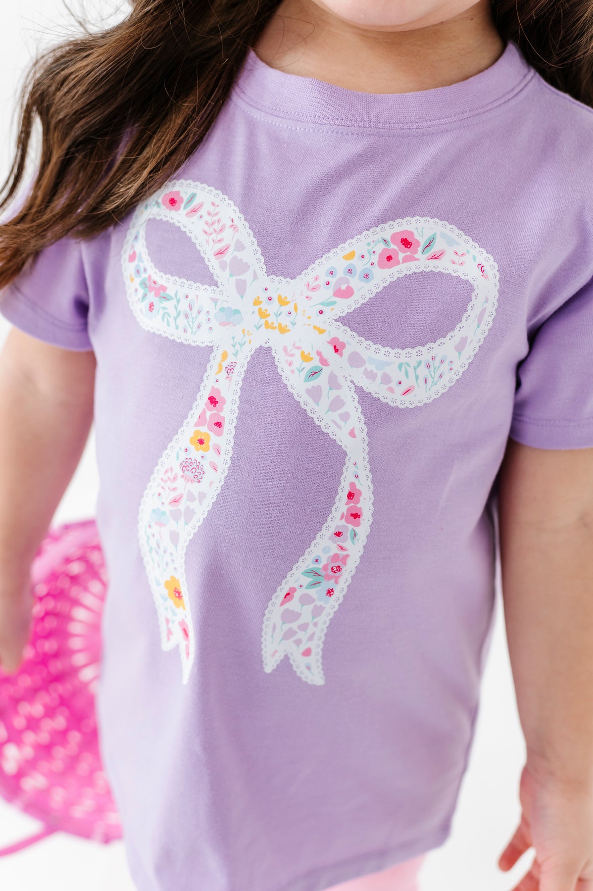 Child wearing a purple shirt with a floral bow design on a white background