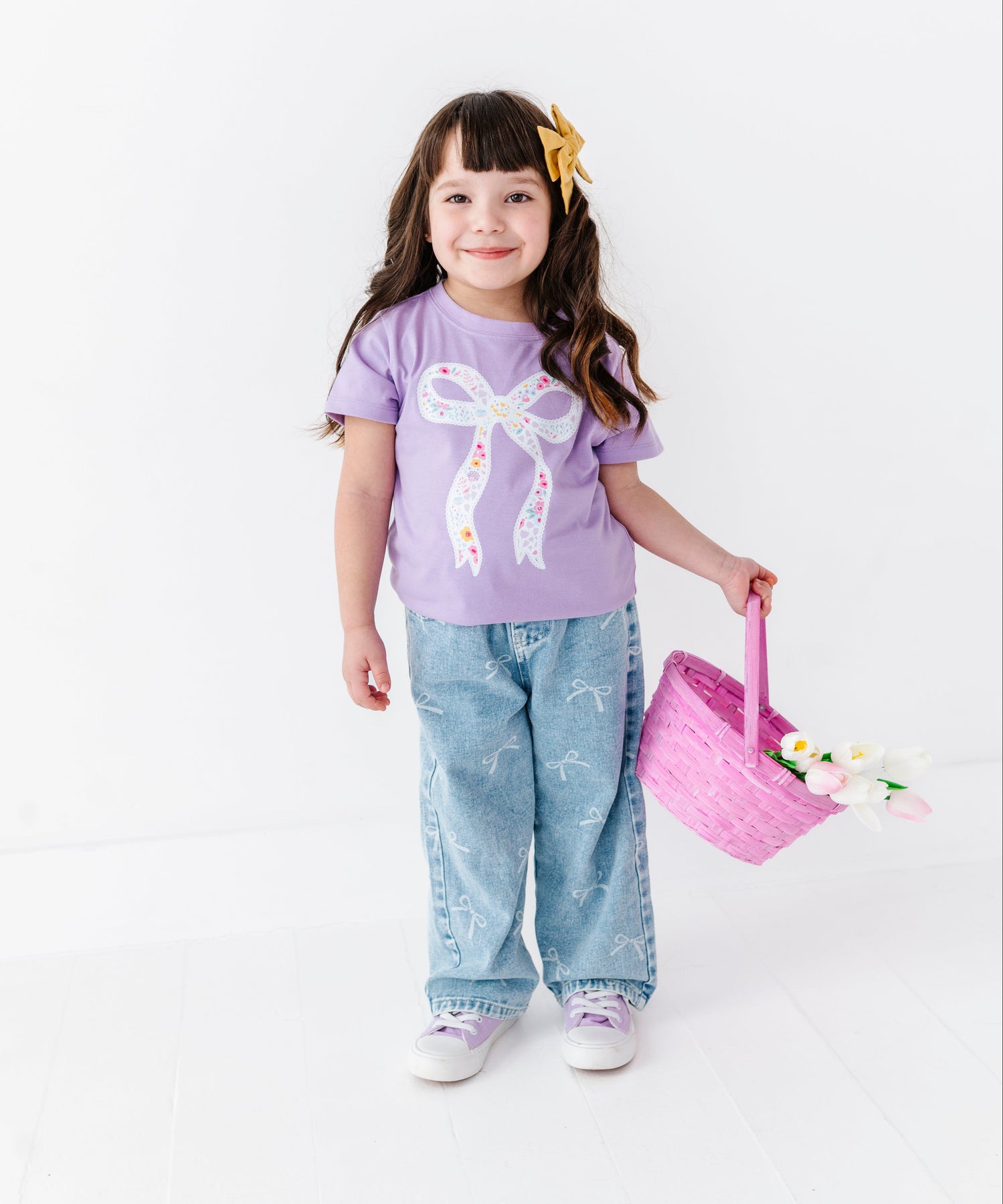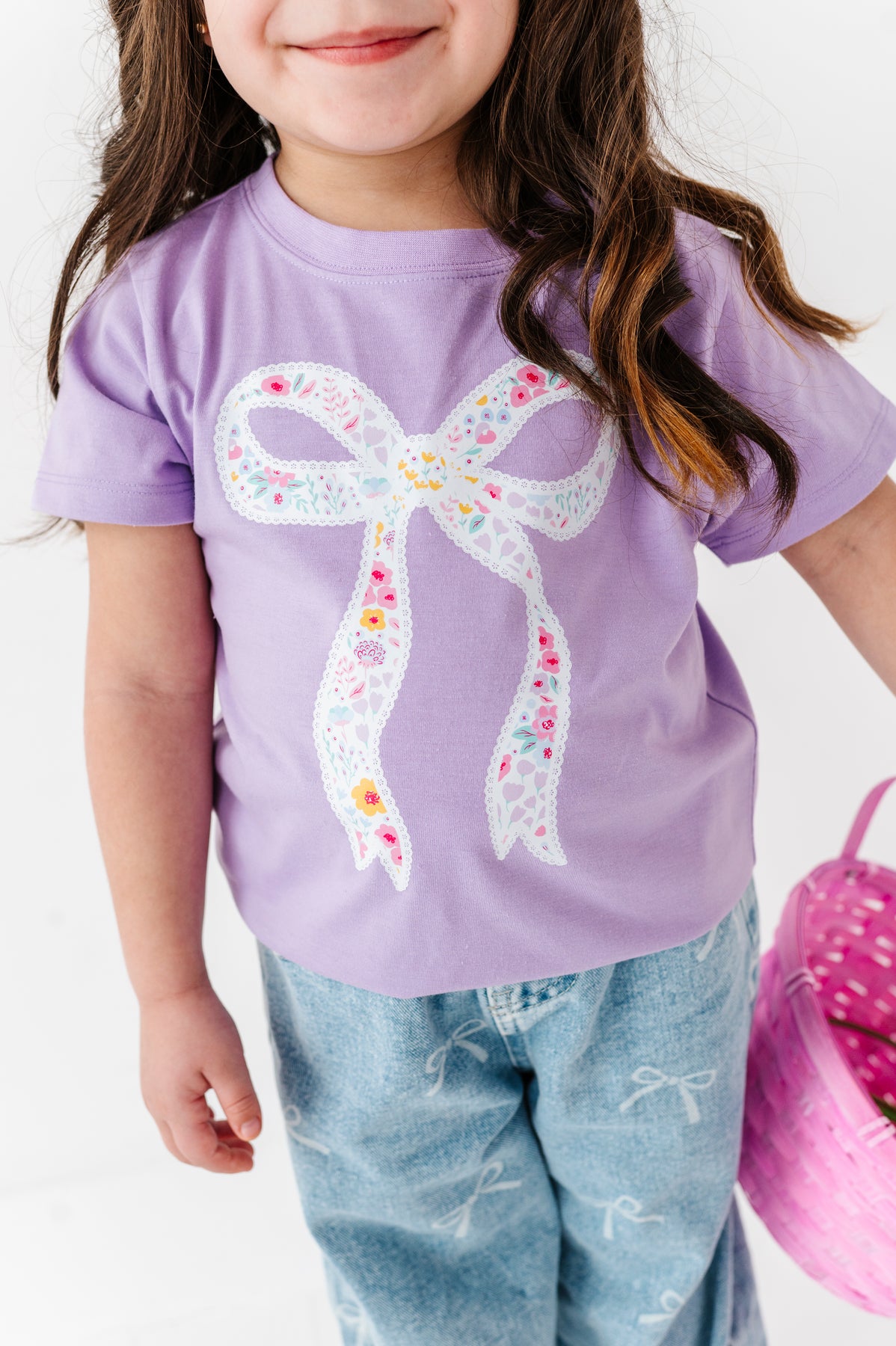 Child wearing a purple shirt with a bow design and holding a pink basket on a white background