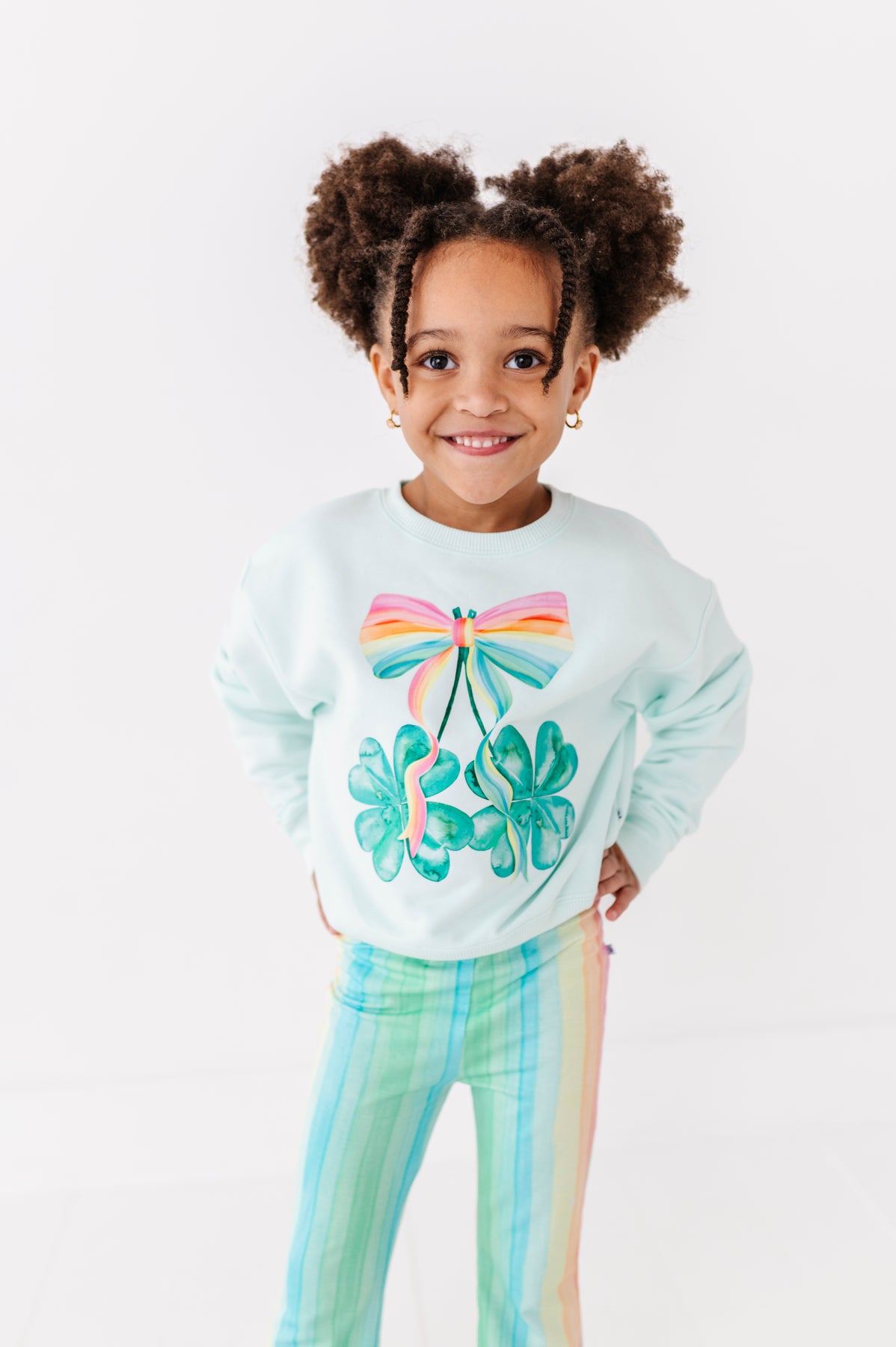 Child wearing mint shamrock sweatshirt and rainbow stripe bamboo cotton pants, posing playfully in a white studio setting.