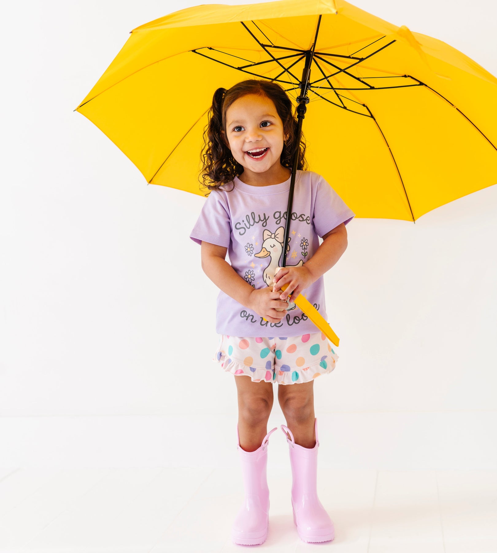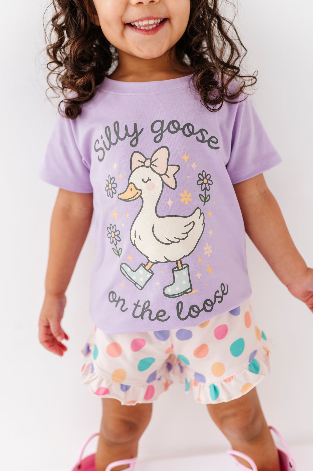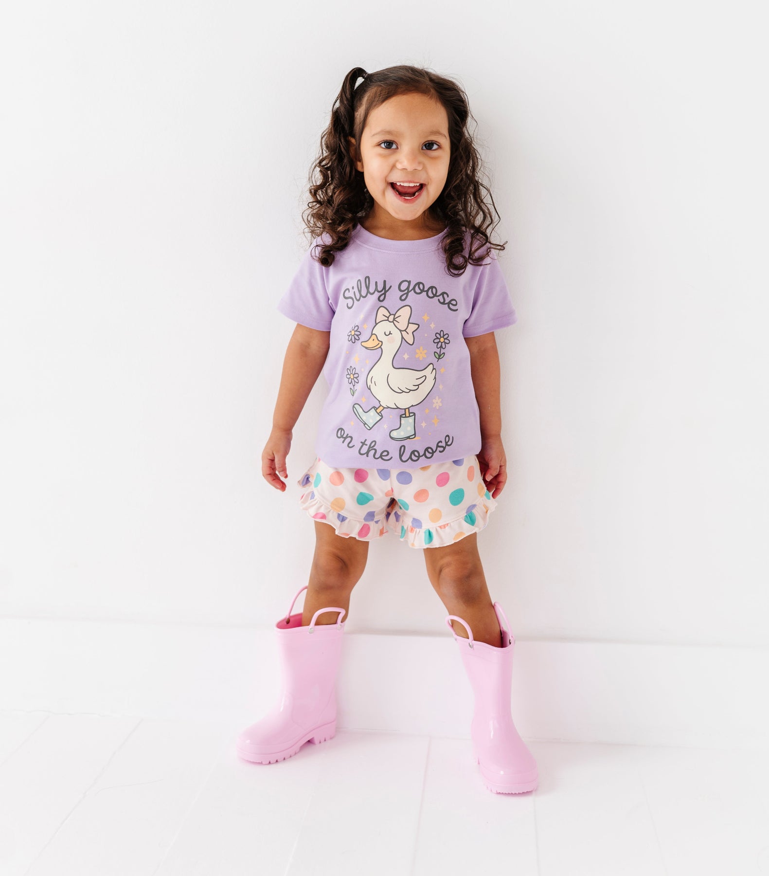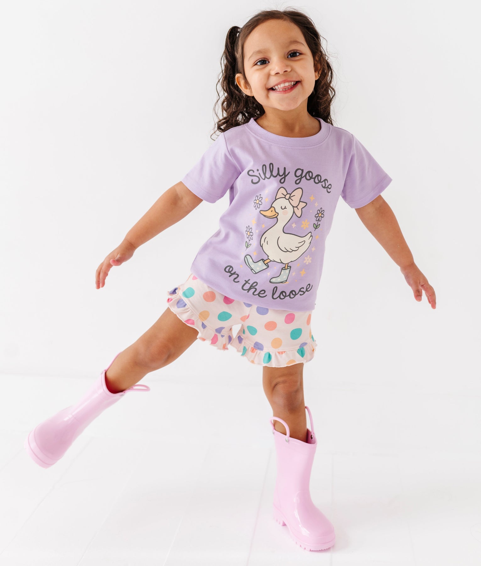 Child wearing a purple shirt with a cartoon goose and silly goose on the loose text, polka dot shorts, and pink rain boots on a white background