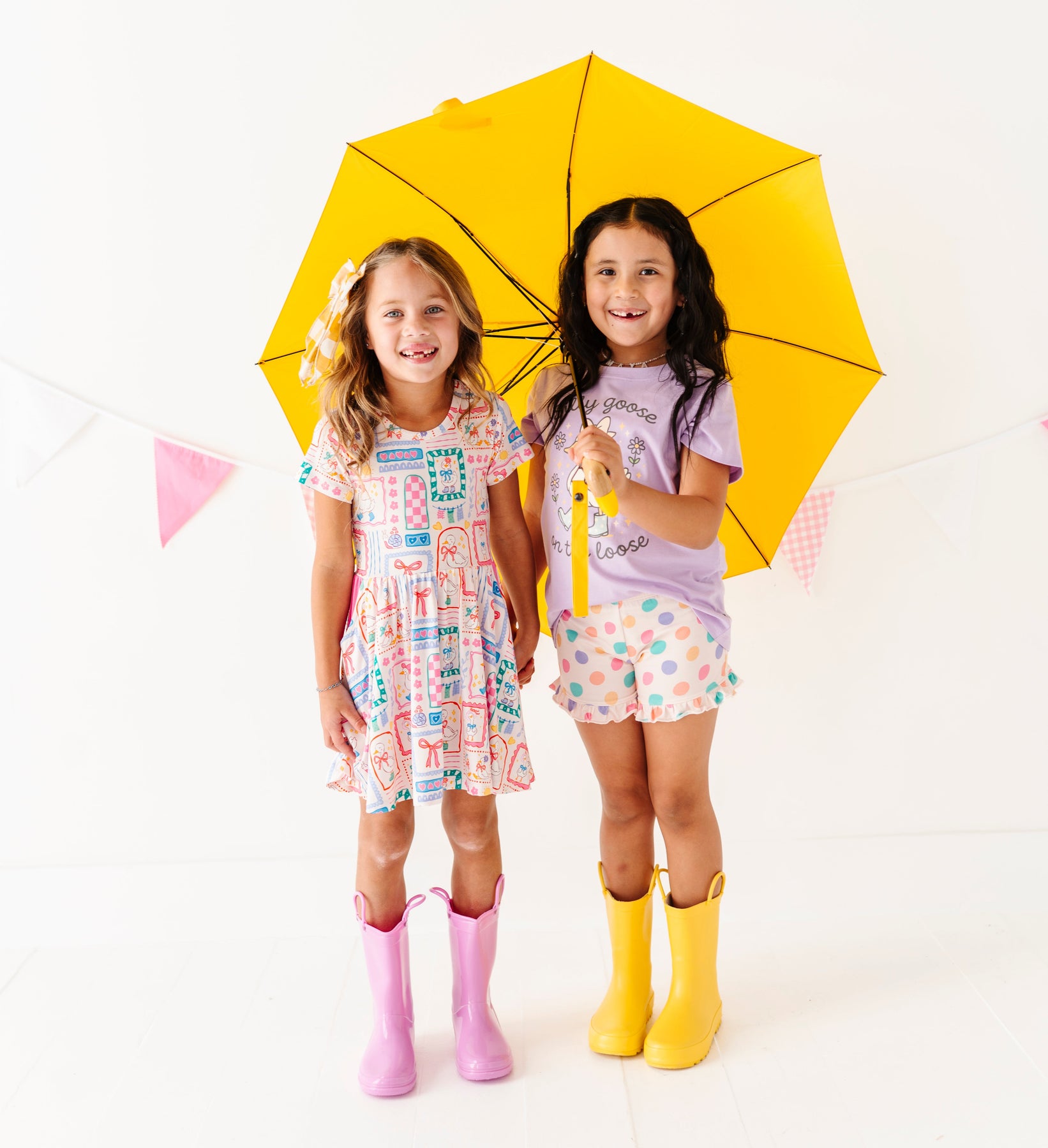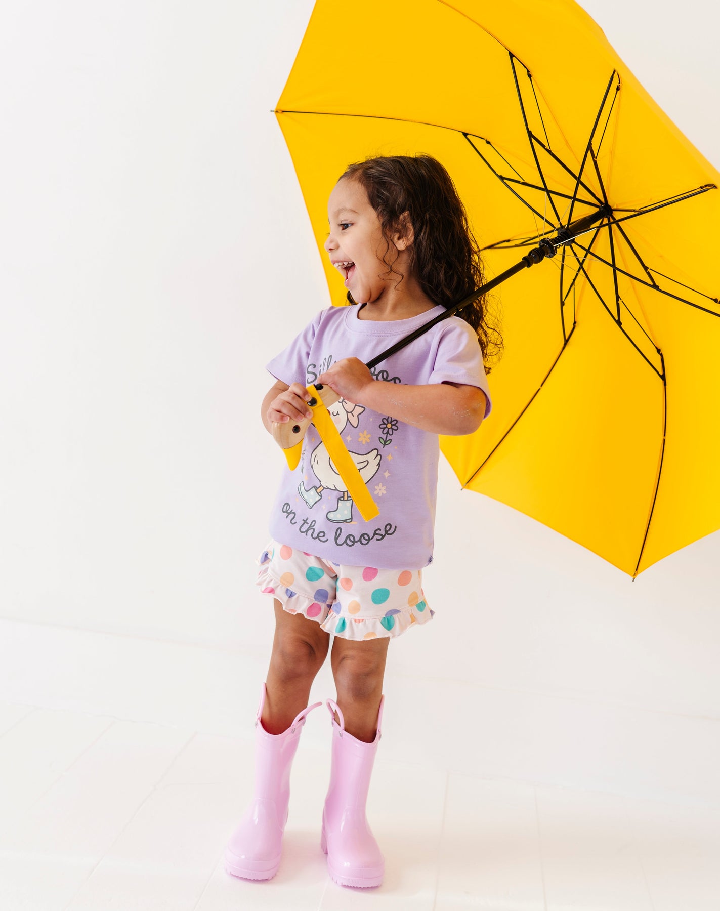 Child wearing a purple t-shirt with a goose design, polka dot shorts, and yellow rain boots on a white background.