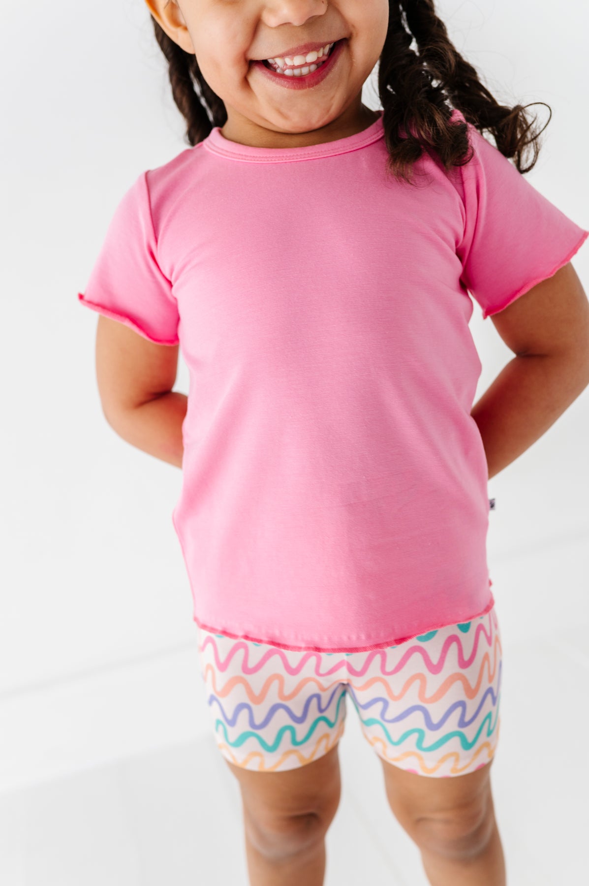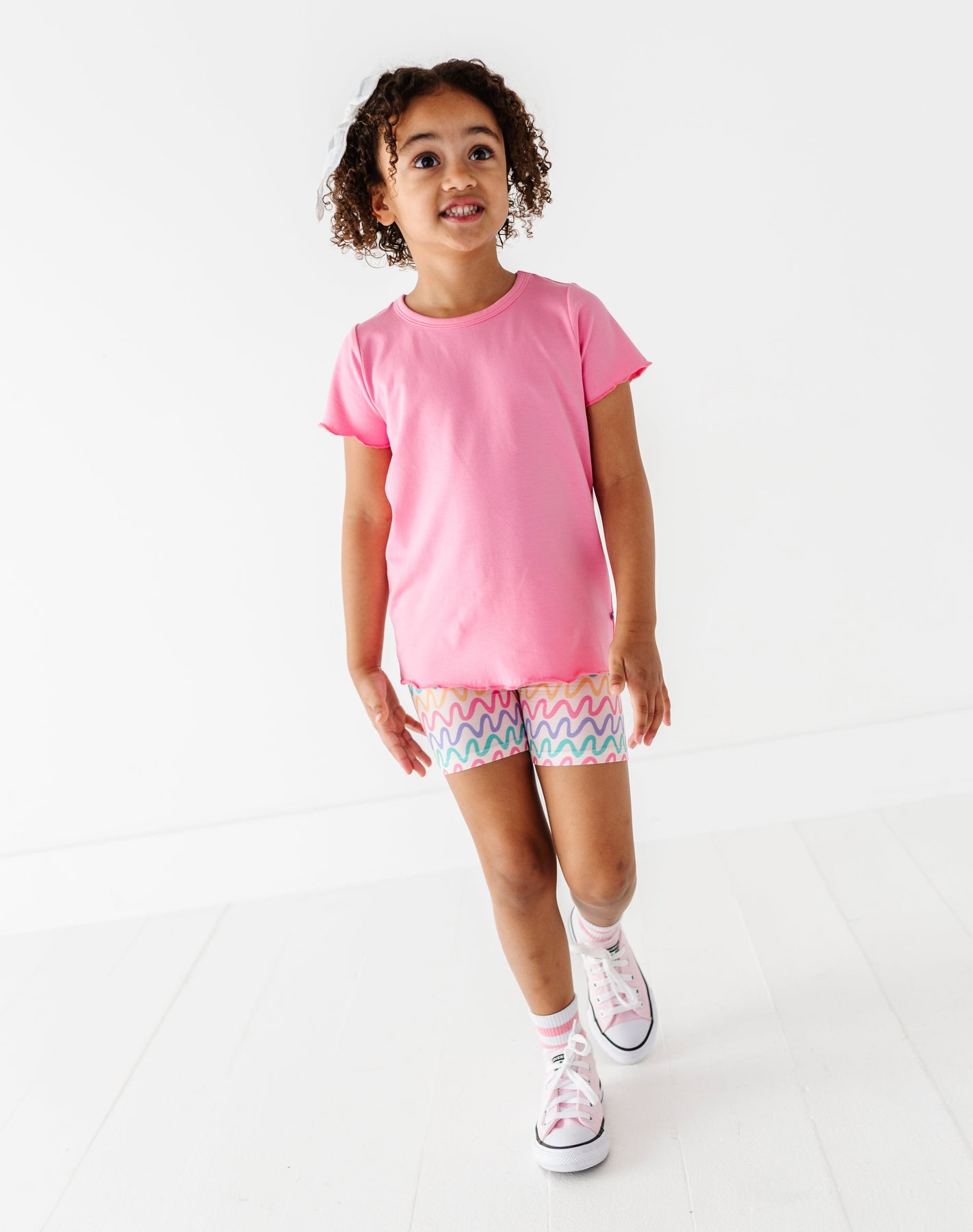 Child wearing a pink shirt and colorful wavy shorts on a white background