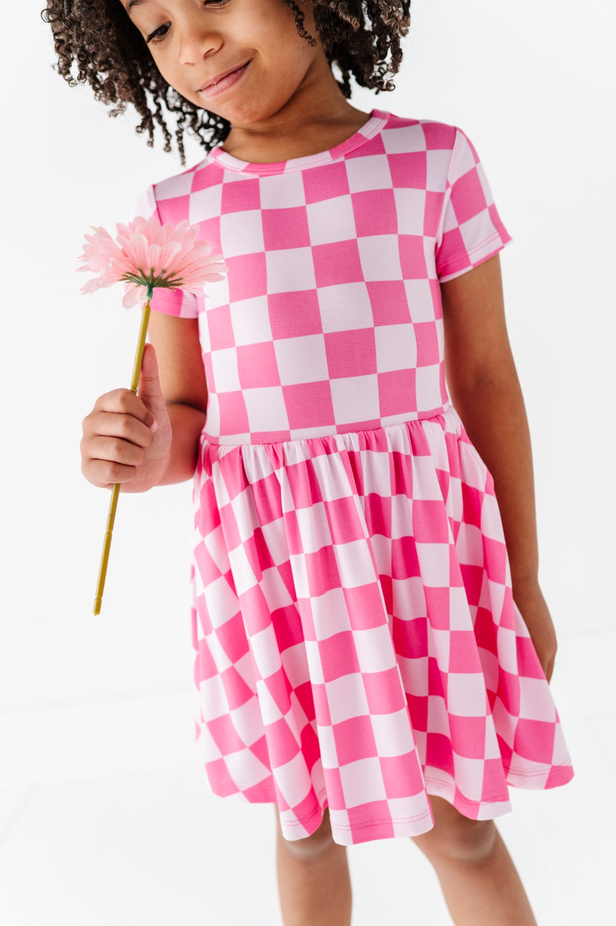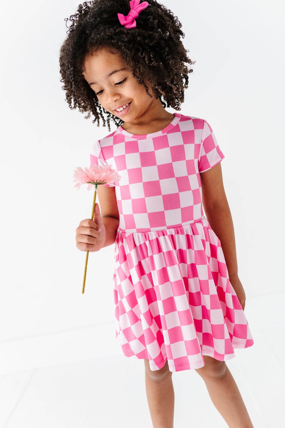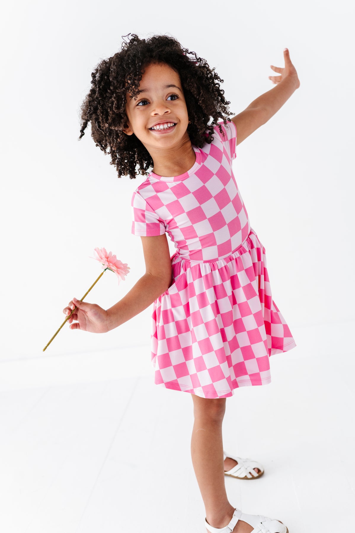 This pink checkered bamboo twirl dress is everything a little girl's wardrobe needs right now. The full flowy skirt is made for spinning and the soft short sleeves keep her comfortable all day long. Crafted from ultra soft breathable bamboo fabric that is gentle on sensitive skin, it is the perfect dress for playdates, parties, and every sweet moment in between.