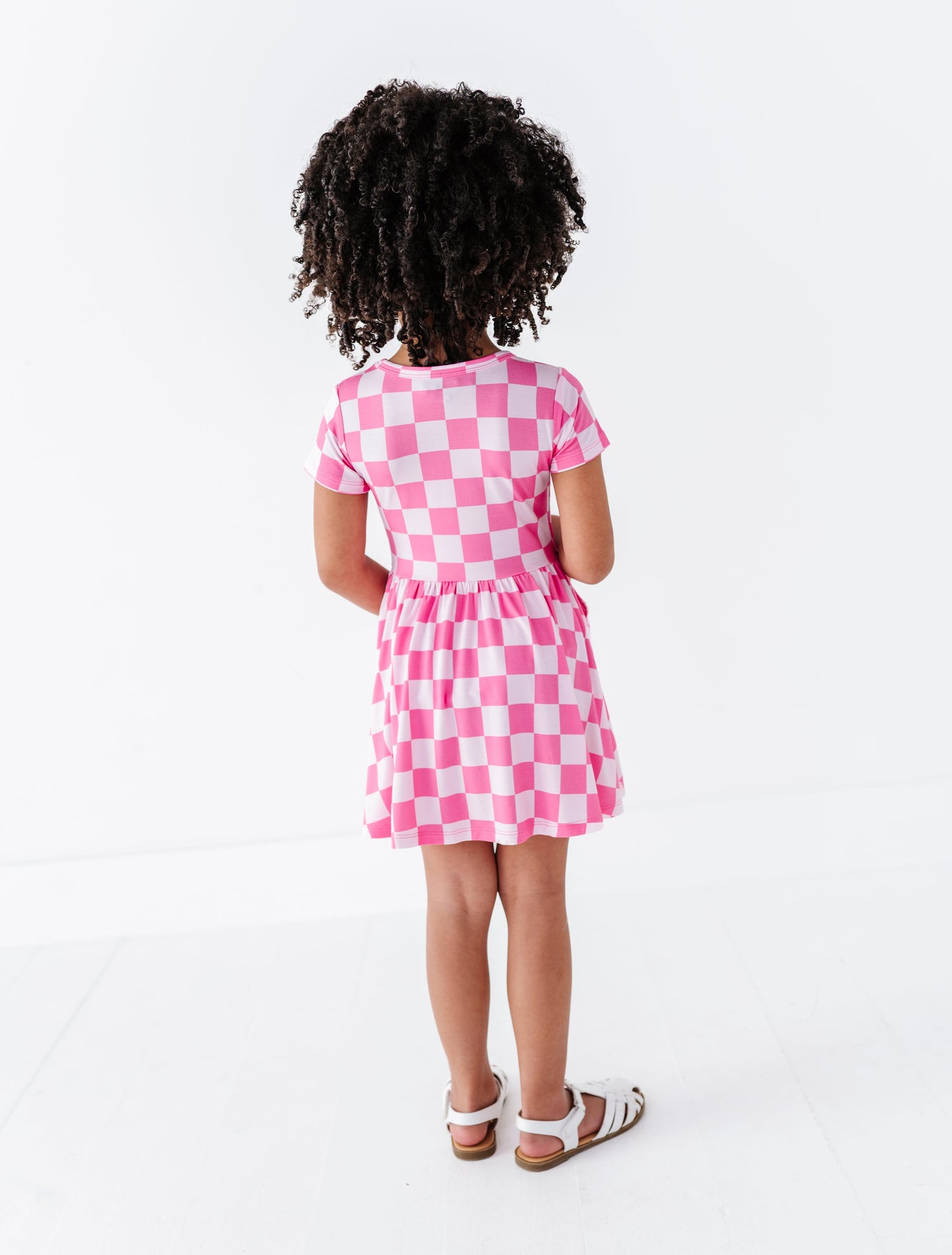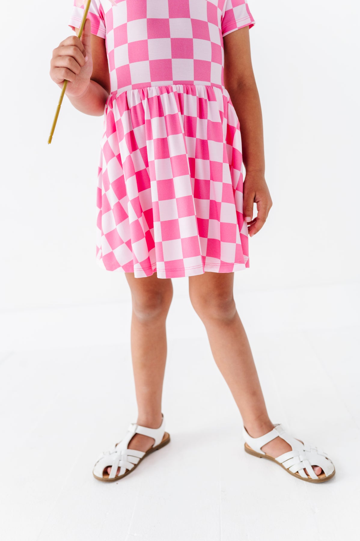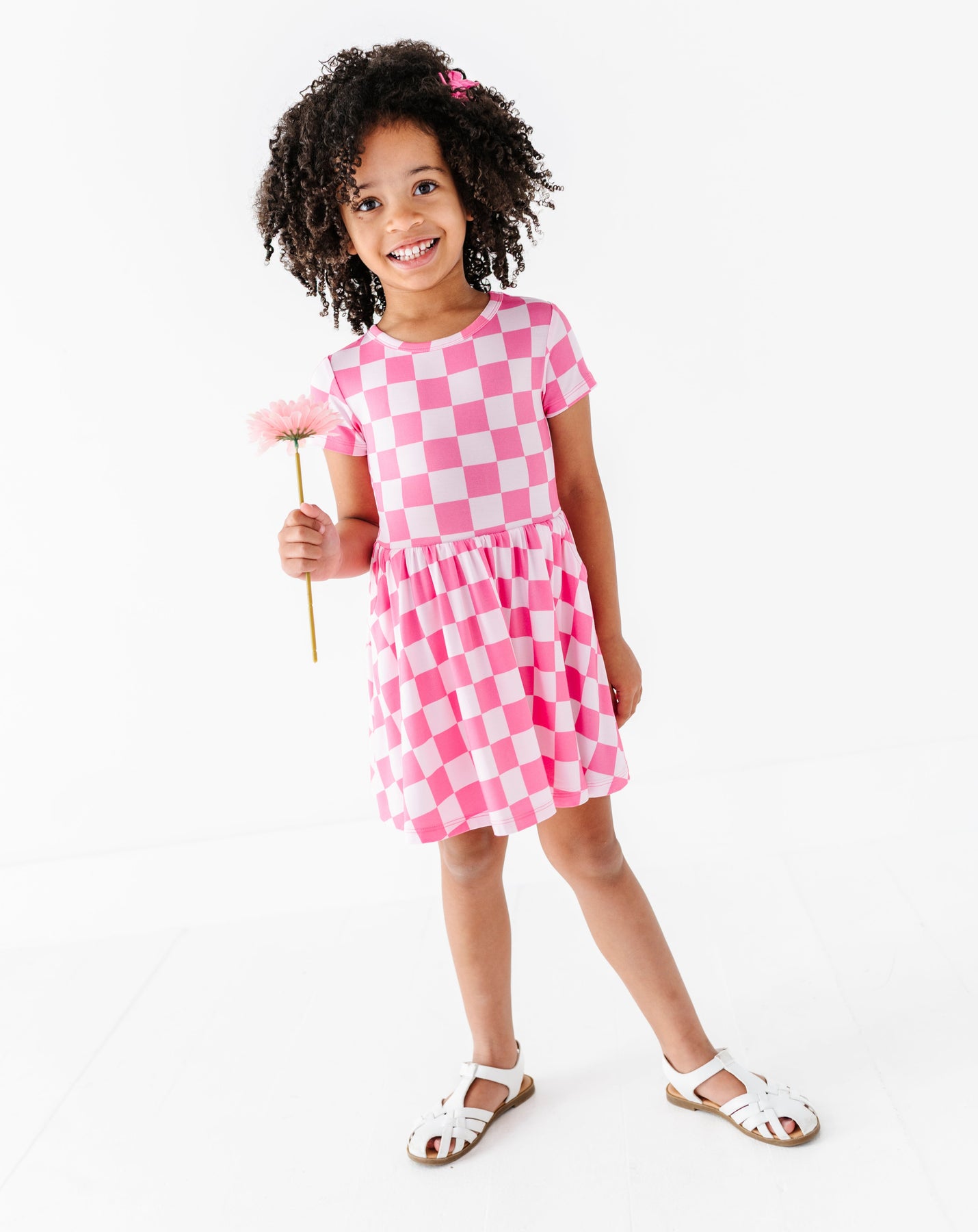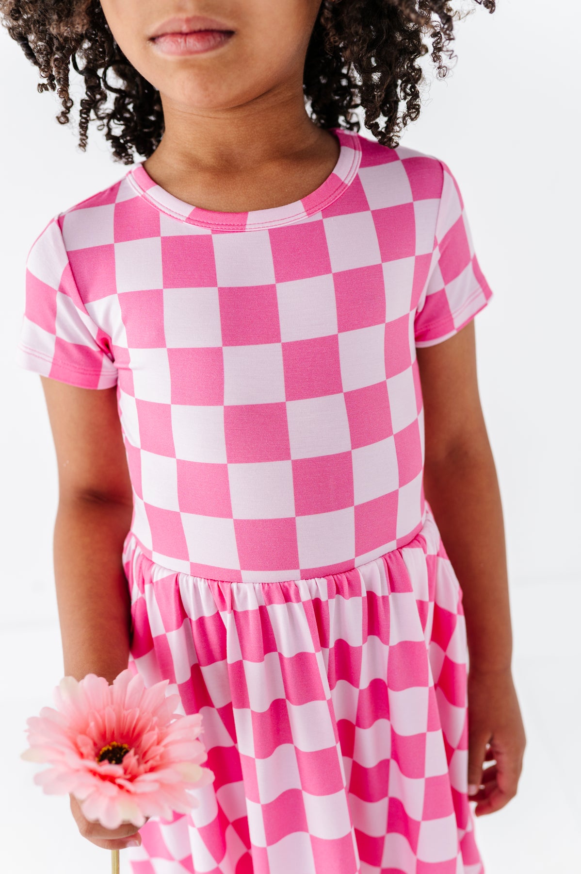 This pink checkered bamboo twirl dress is everything a little girl's wardrobe needs right now. The full flowy skirt is made for spinning and the soft short sleeves keep her comfortable all day long. Crafted from ultra soft breathable bamboo fabric that is gentle on sensitive skin, it is the perfect dress for playdates, parties, and every sweet moment in between.