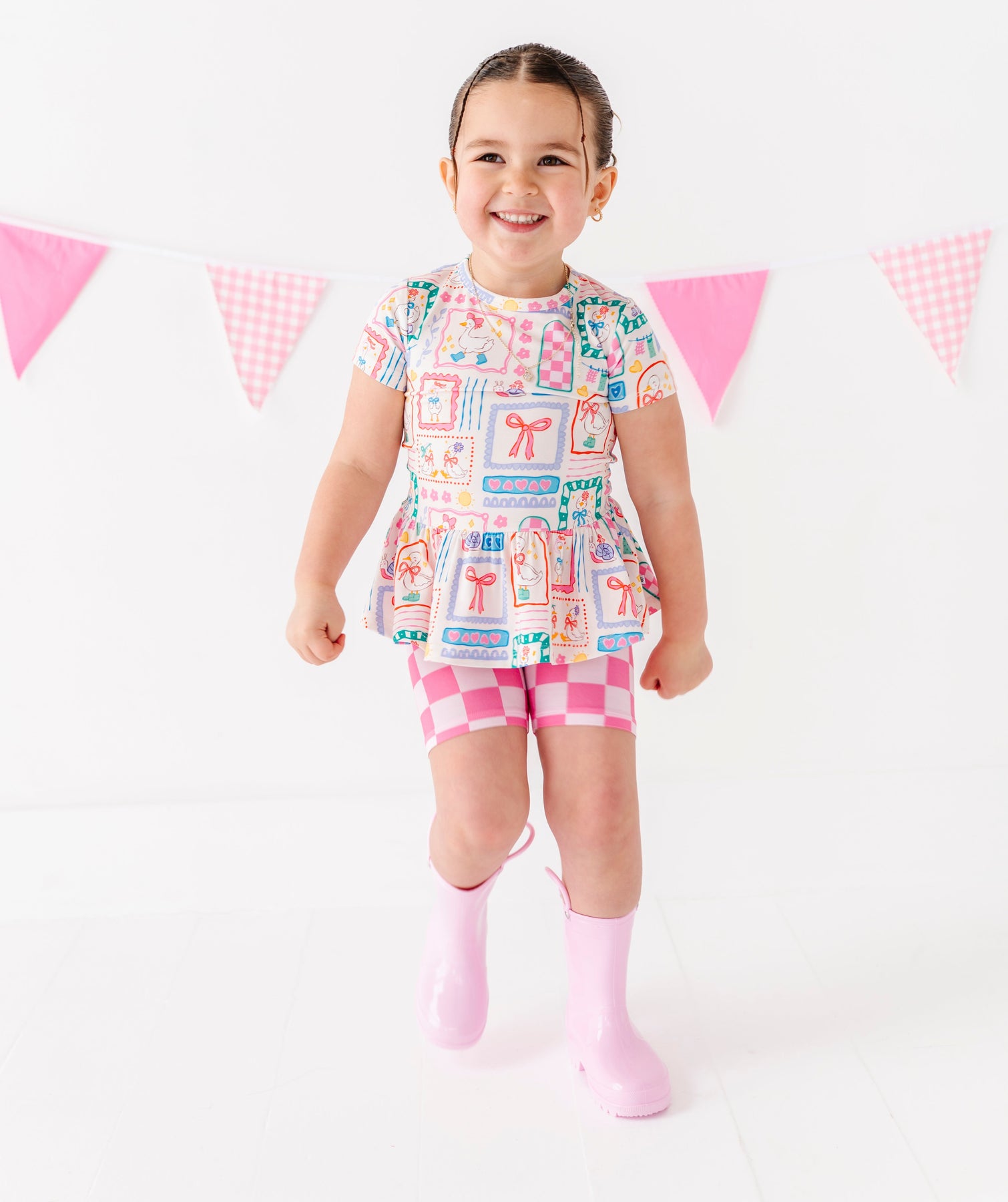 Child wearing a colorful top, pink checkered shorts, and pink rain boots on a white background