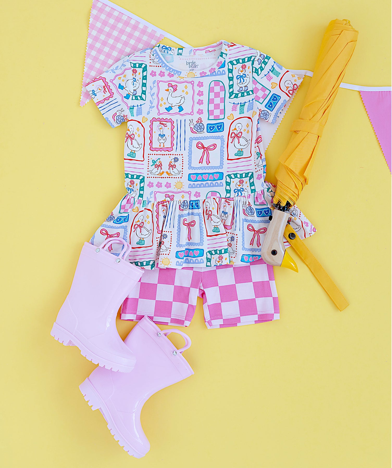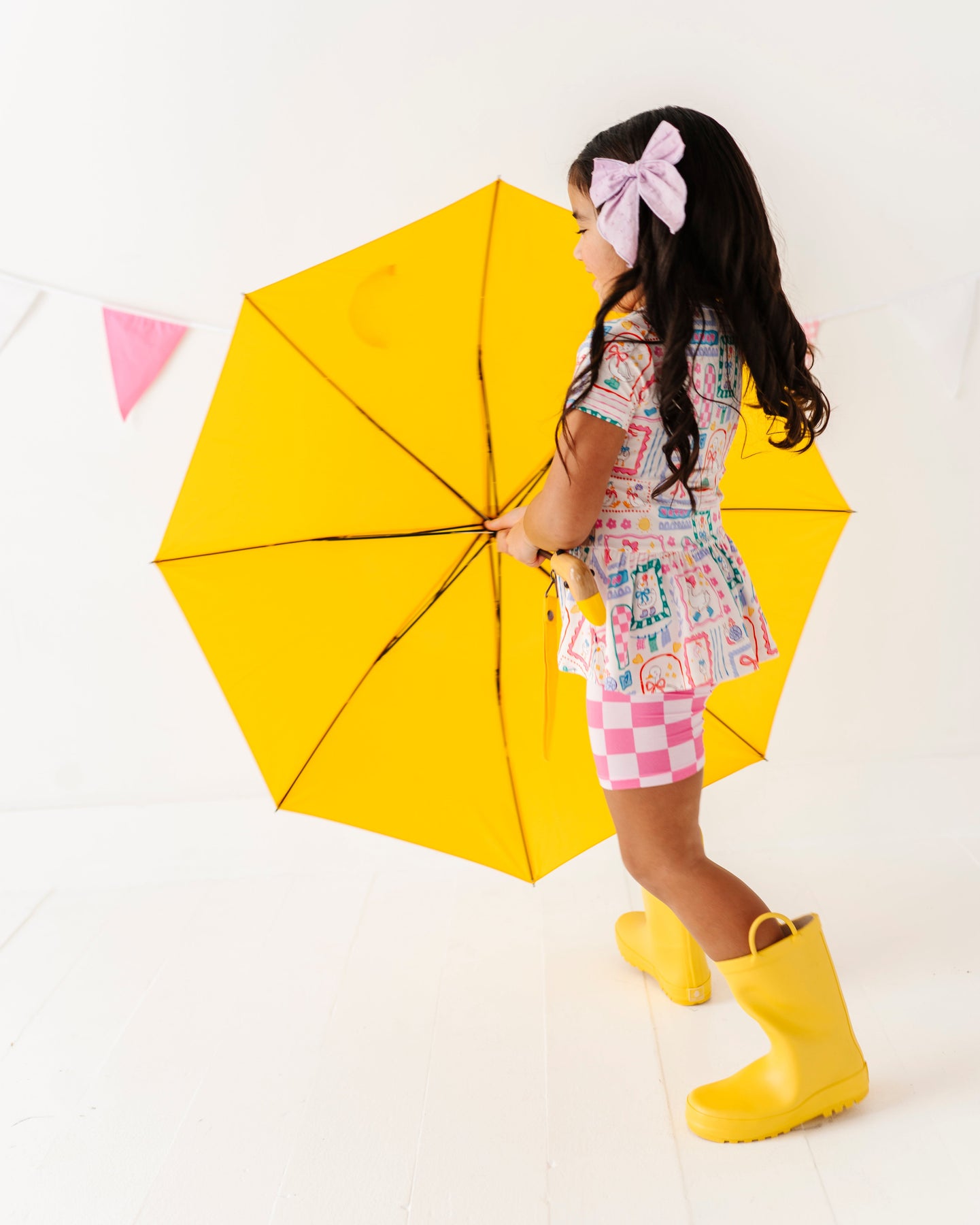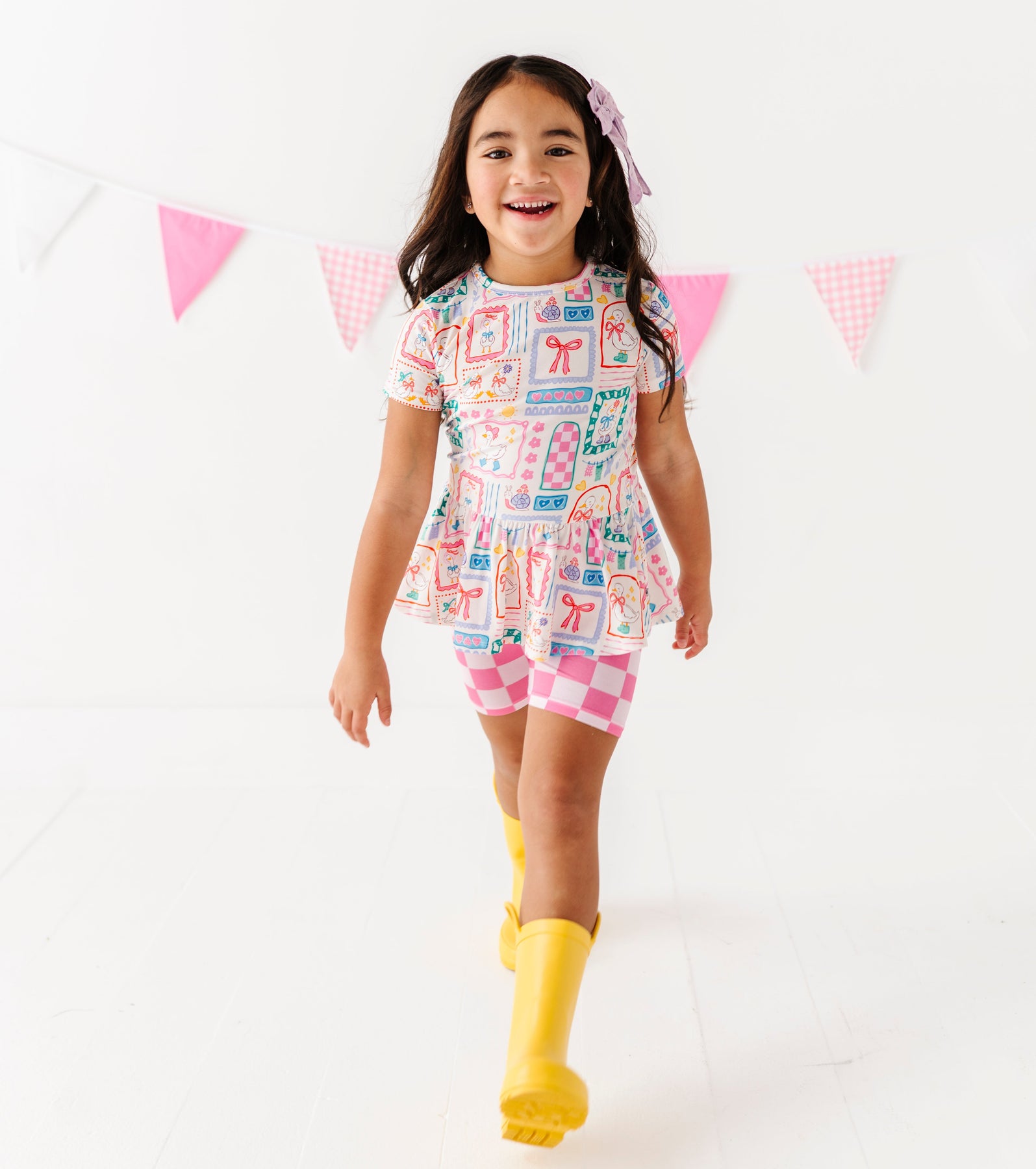 Girl in a peplum top with pink checkered shorts and yellow rain boots on a white background
