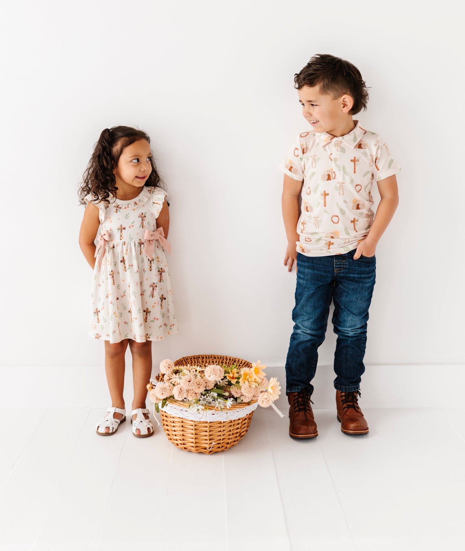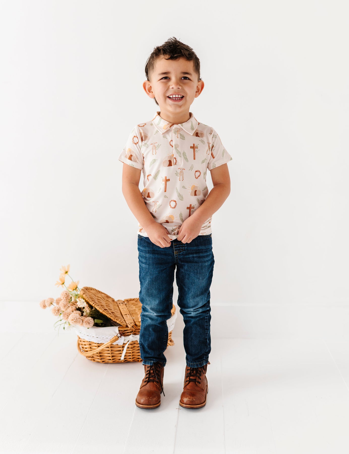 Child wearing a Easter patterned shirt and jeans standing next to a woven basket on a white background