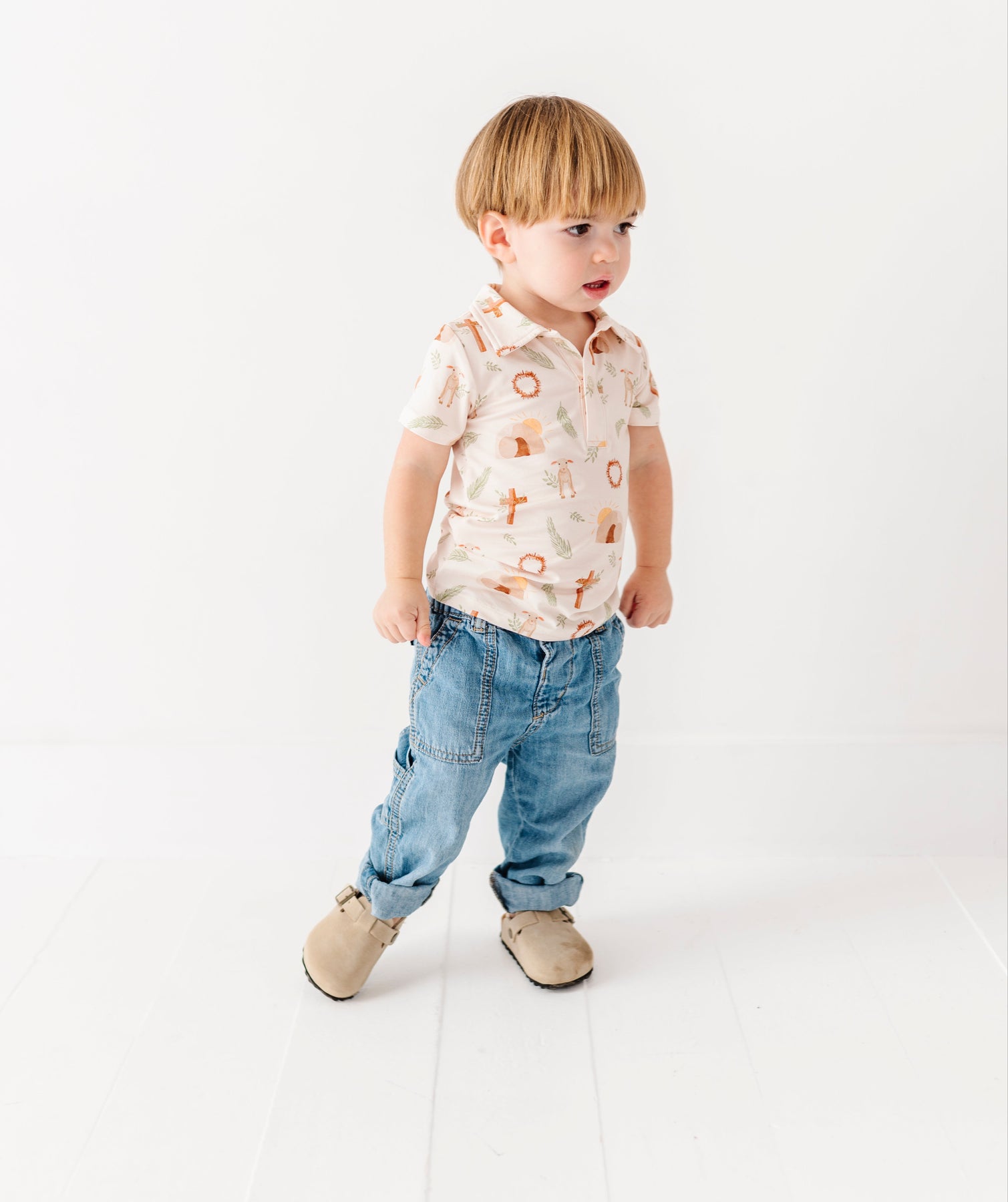 Child wearing a Easter cross patterned shirt and jeans on a white background