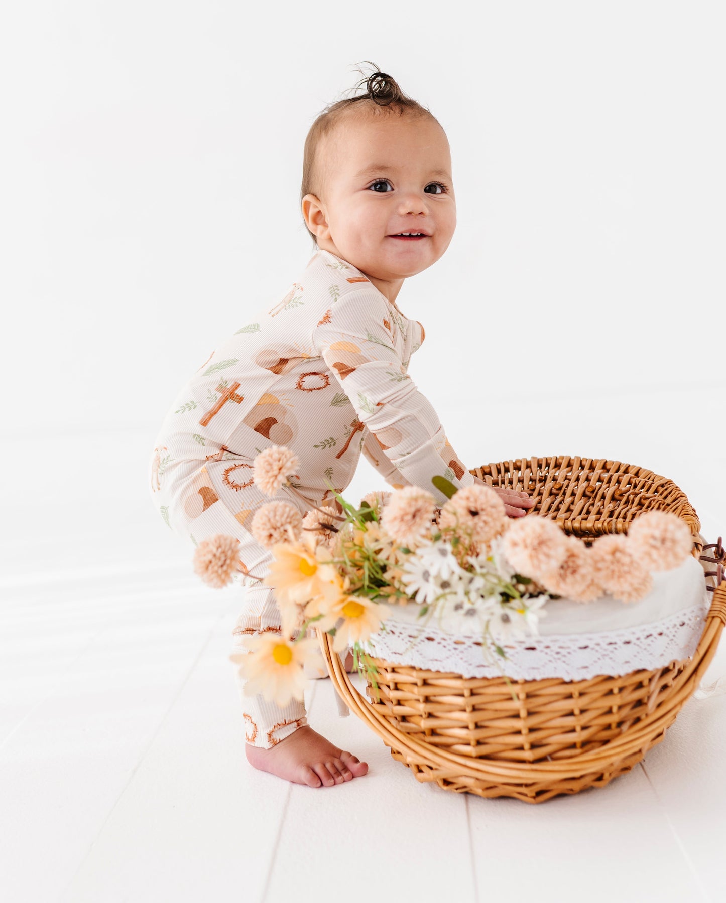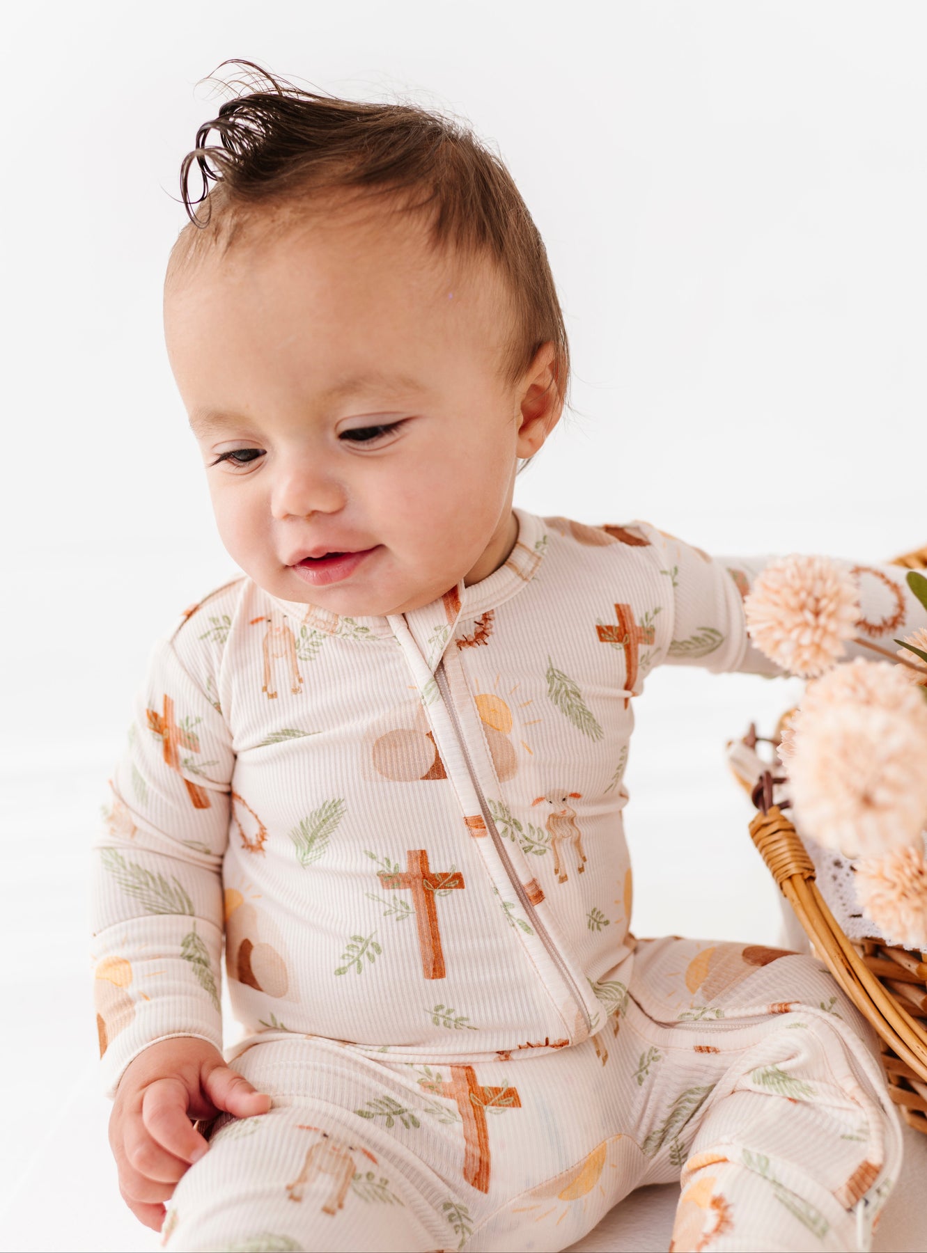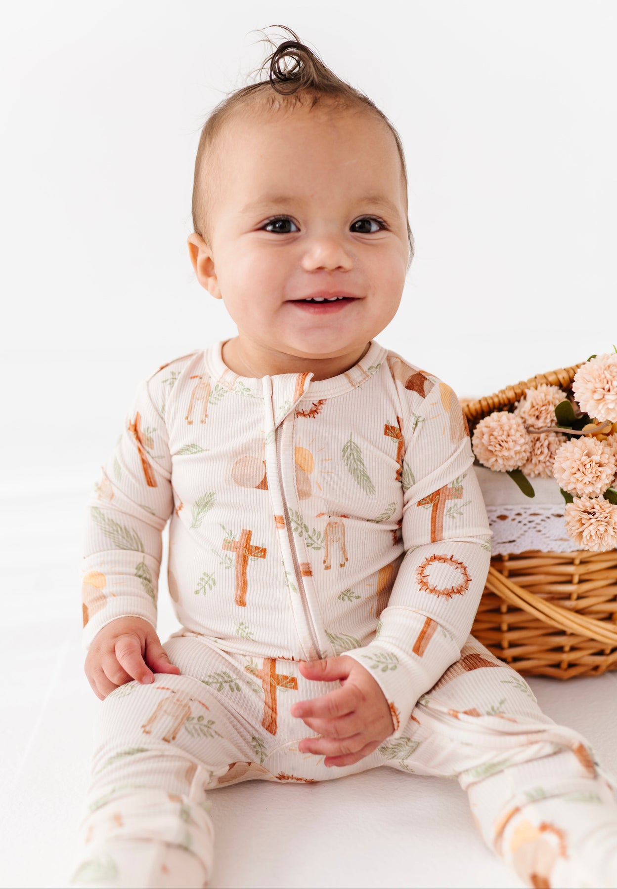 Baby in a patterned romper with brown crosses sitting next to a wicker basket with flowers on a white background