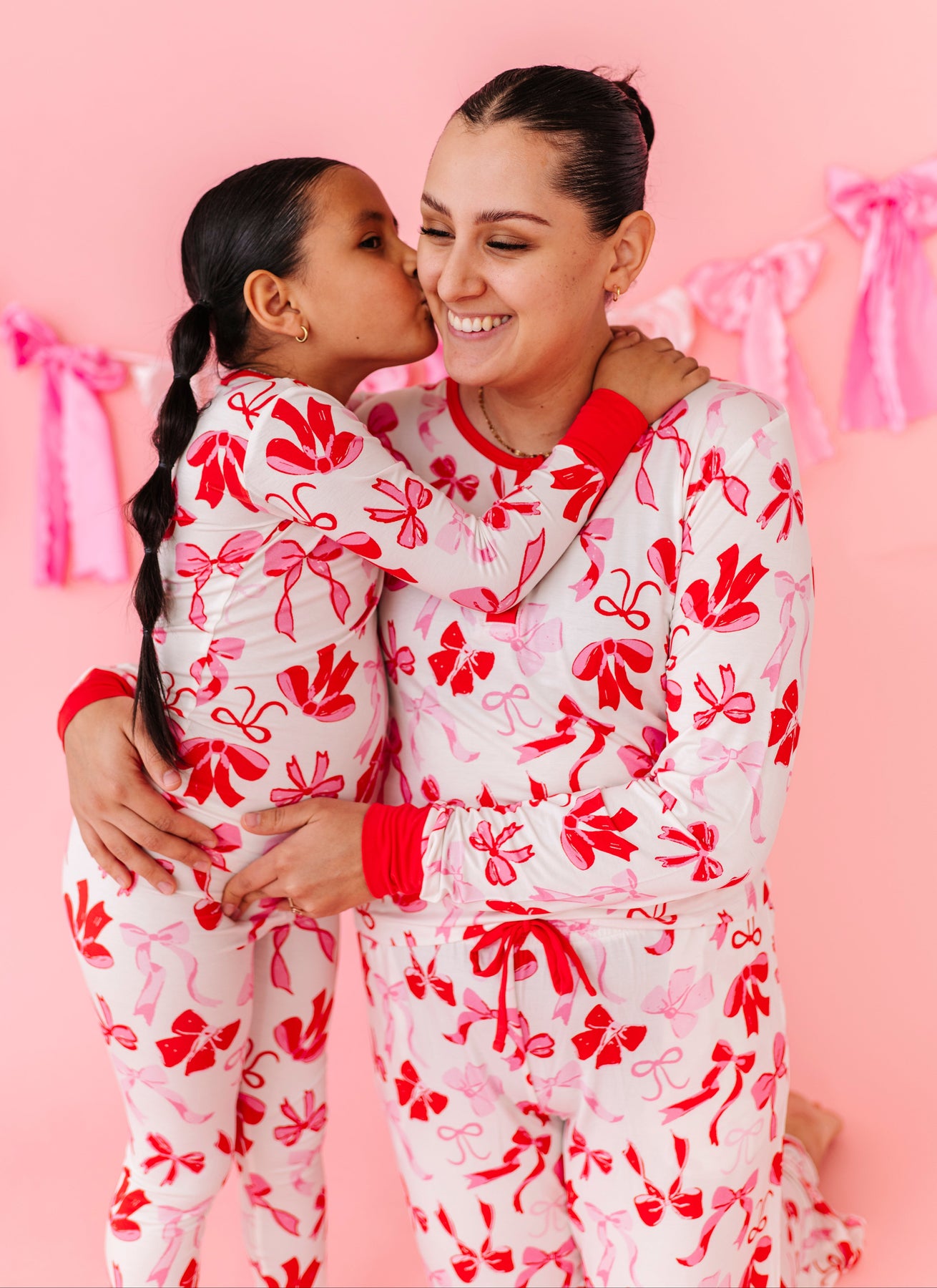 This set is the perfect mix of cozy comfort and pretty-in-pink charm. Featuring an allover bow print in shades of red and pink, this set feels playful, feminine, and made for slowing down. The classic long-sleeve top pairs effortlessly with relaxed-fit pants for a look that’s as cute as it is comfy. Whether you’re curling up on the couch, sipping your morning coffee, or matching with your minis. Made from our signature buttery-soft bamboo viscose blend, it’s breathable, stretchy, and gentle on skin for all-night (and all-day) comfort. Because lounging should feel just as good as it looks.