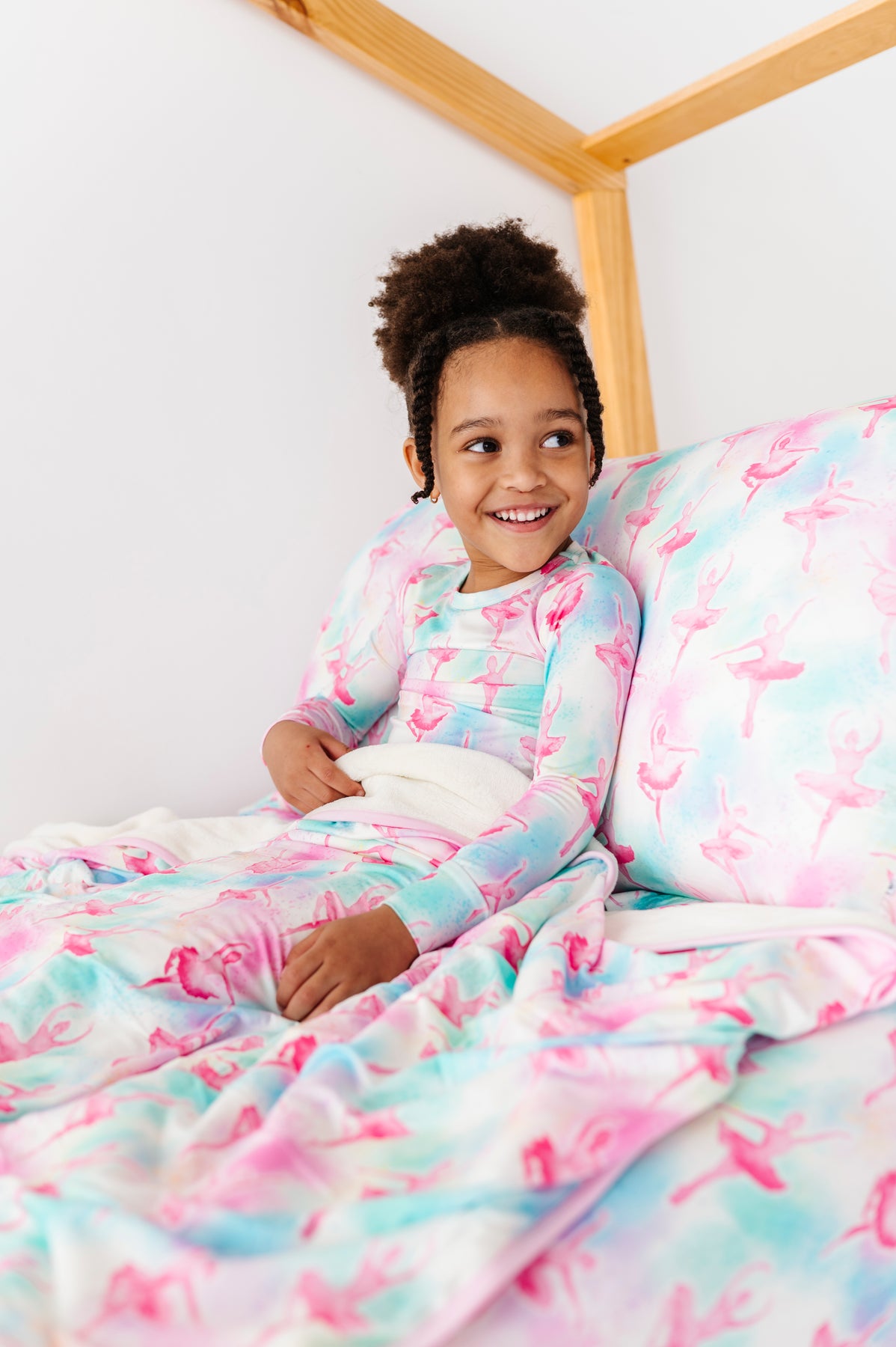 Child wrapped in a watercolor bamboo blanket with ballet pattern on a bed.
