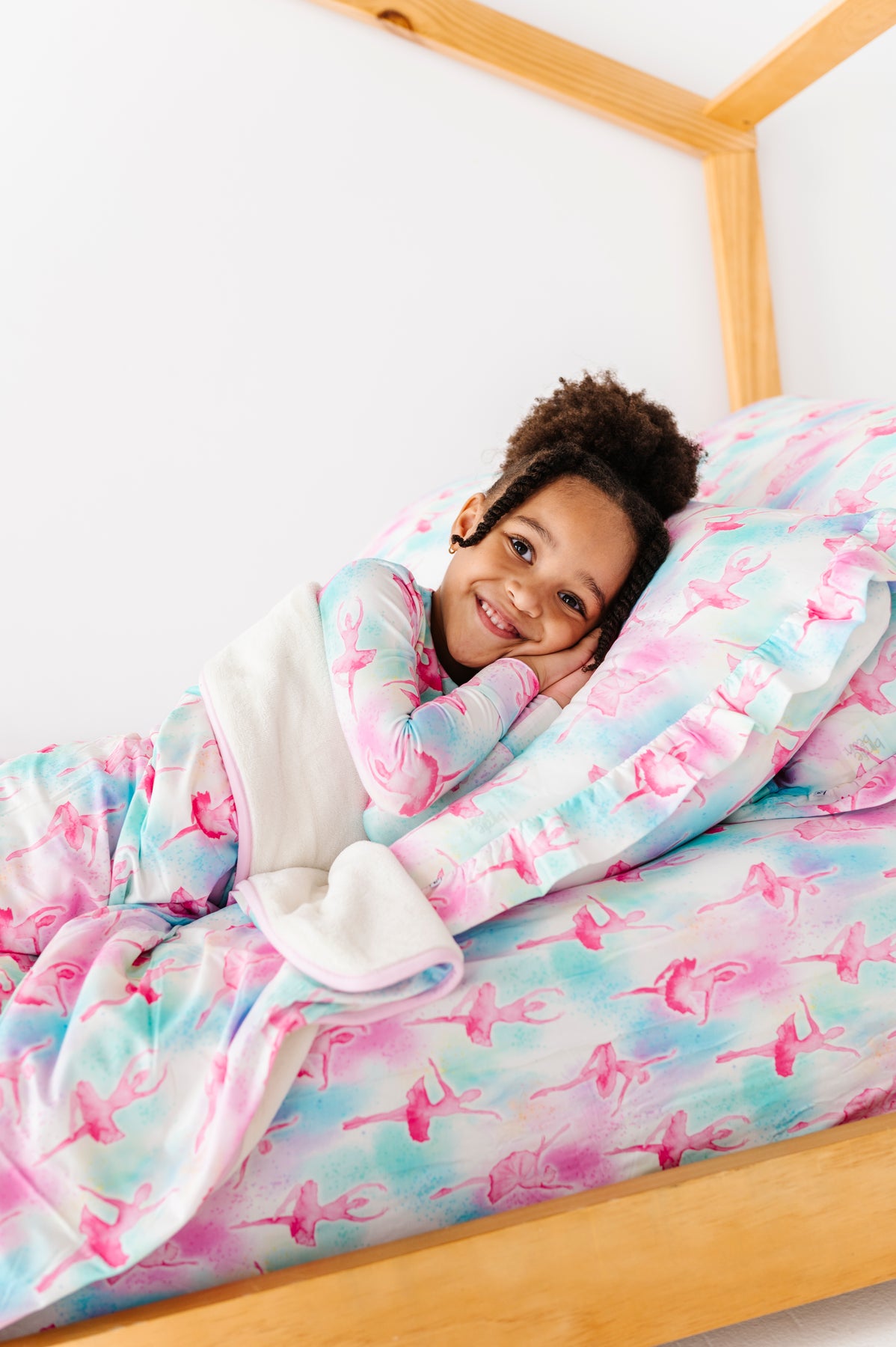 Child lying on a bed with colorful ballet-themed bamboo bedding