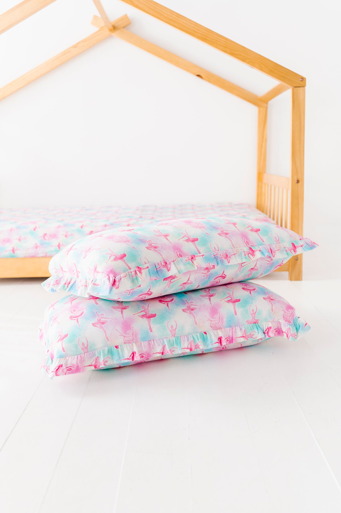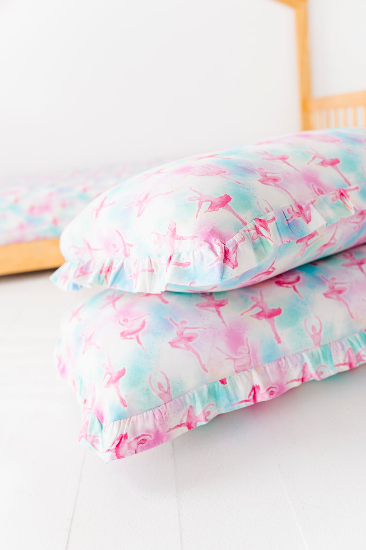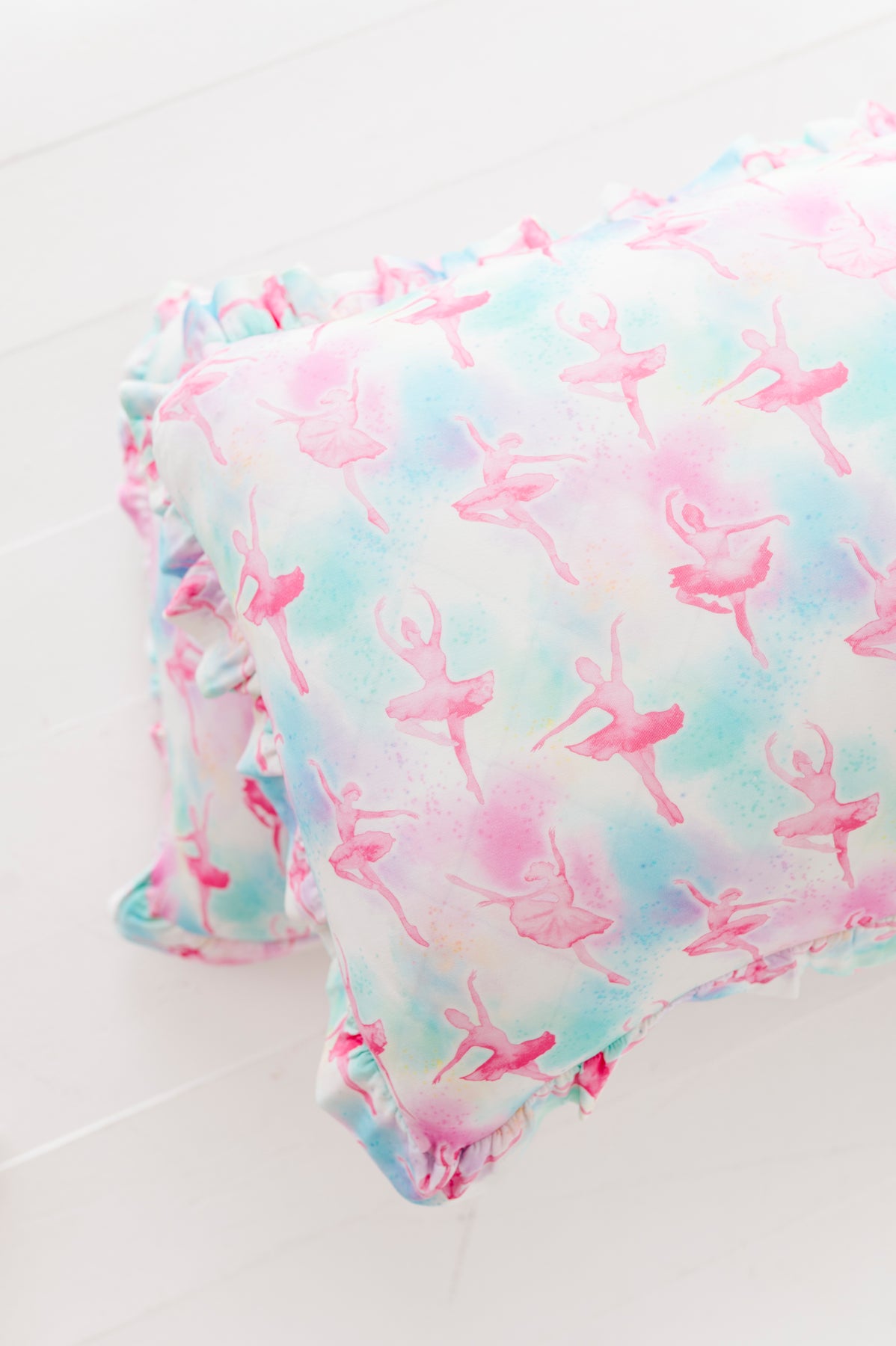 Bedtime, but make it beautiful. The Pastel Pirouettes Ruffle Zipper Pillowcase Set brings buttery soft bamboo viscose and a dreamy watercolor ballerina print to your little one's sleep space - because the bedroom deserves a good print too.