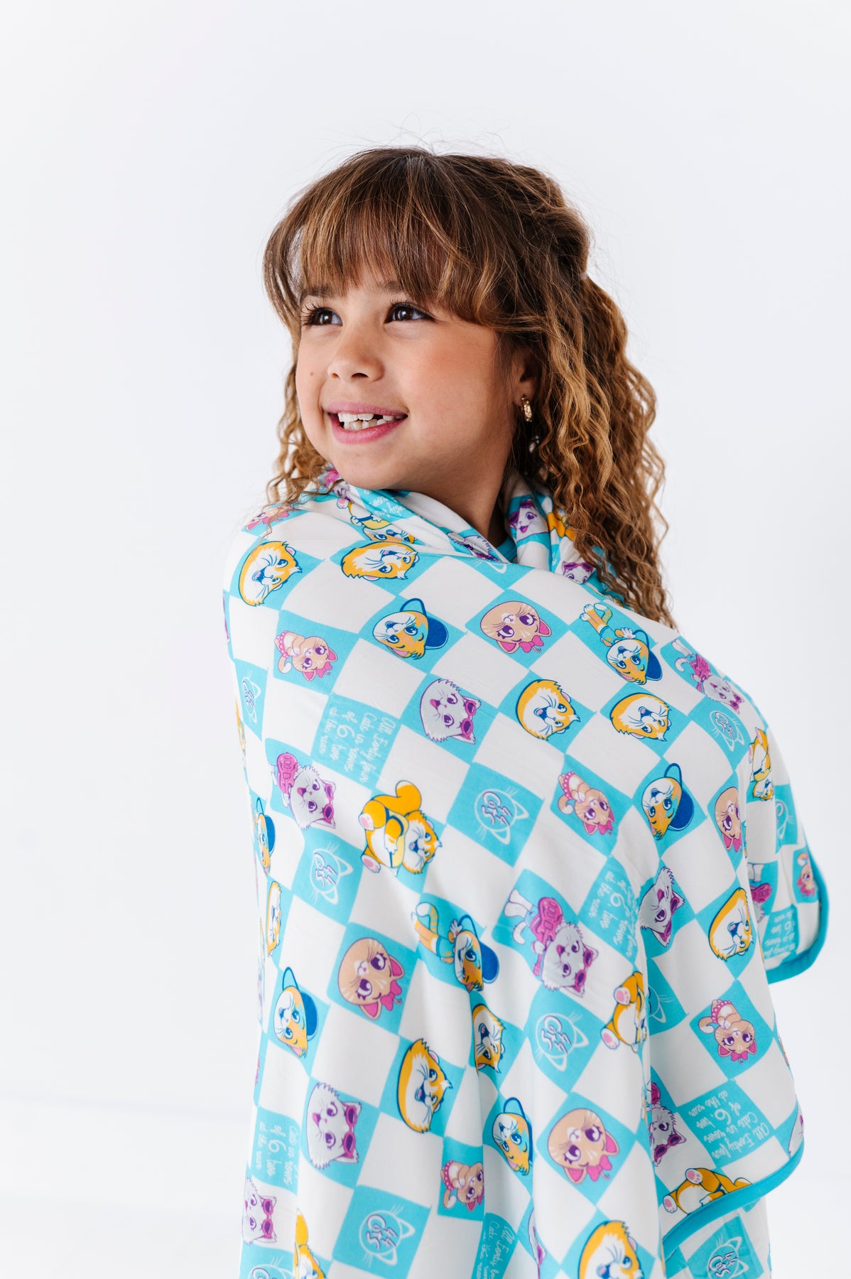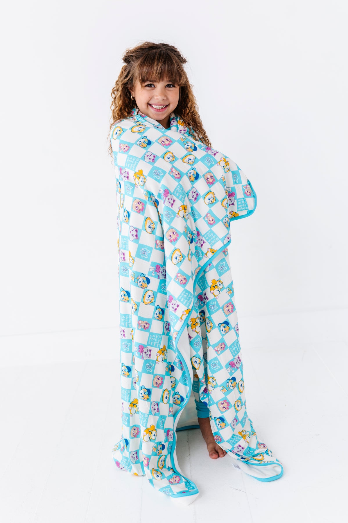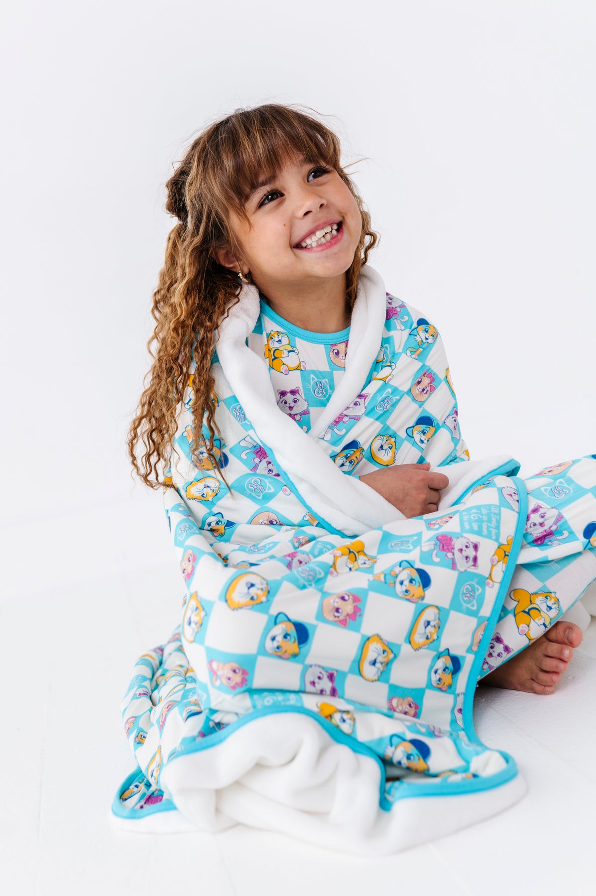 Child wearing a colorful 44 Cats pajama set and wrapped in a matching plush bamboo blanket