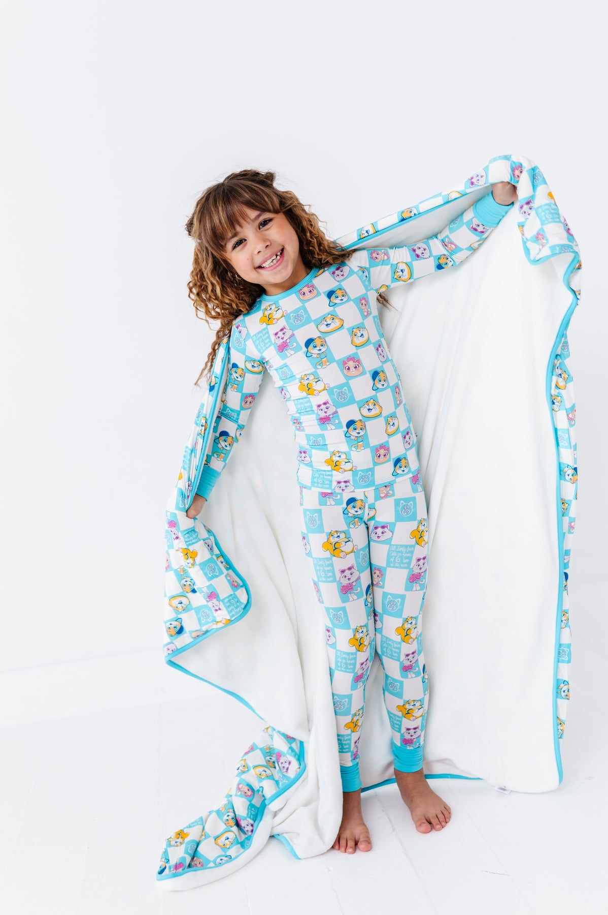 Child wearing a colorful 44 Cats pajama set and a matching bamboo blanket.