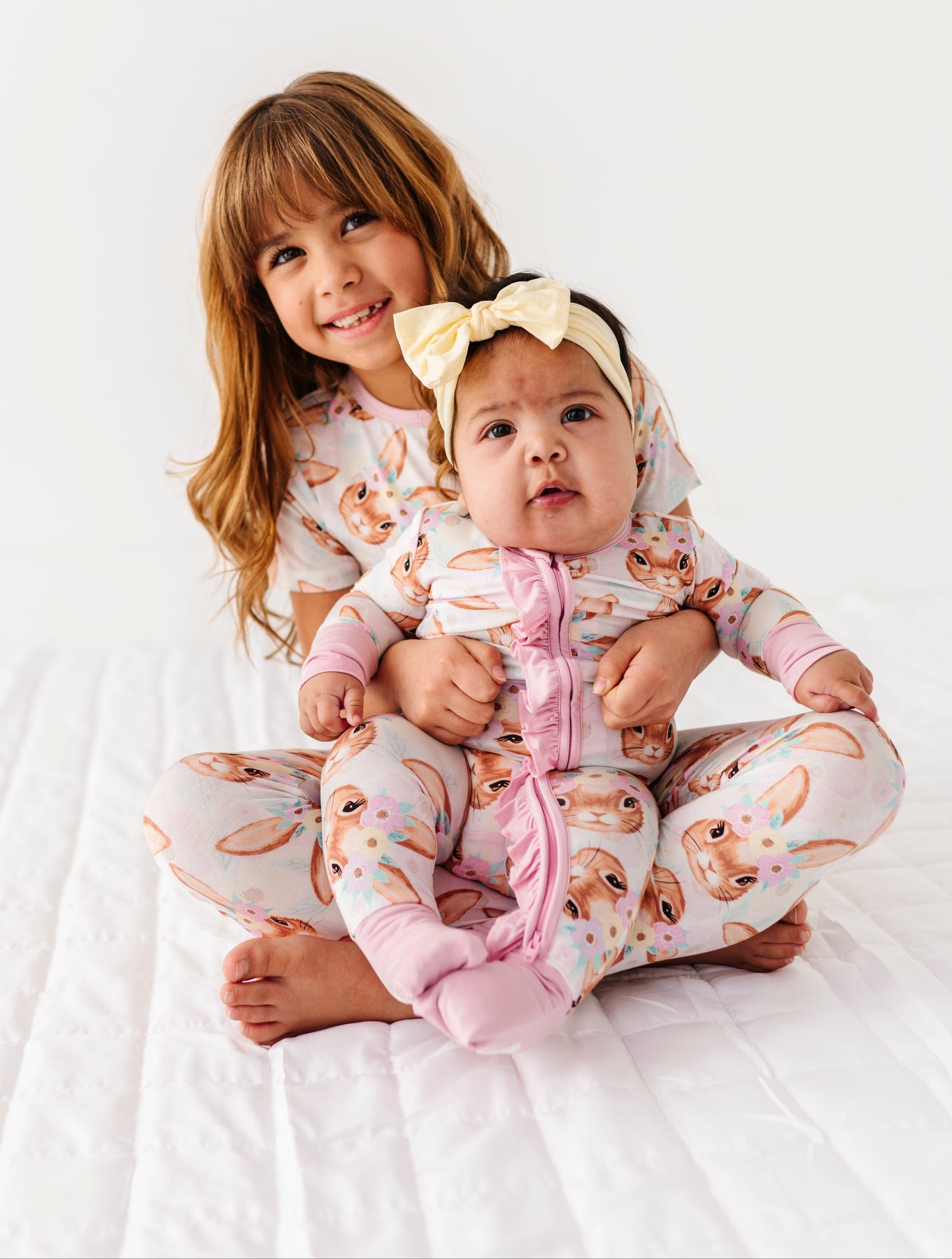 Two children in matching Easter pajamas sitting on a white blanket.