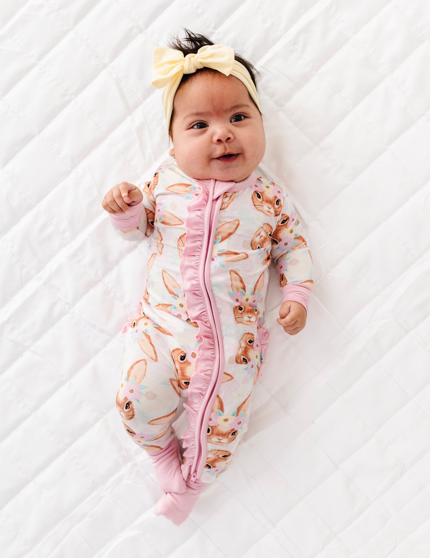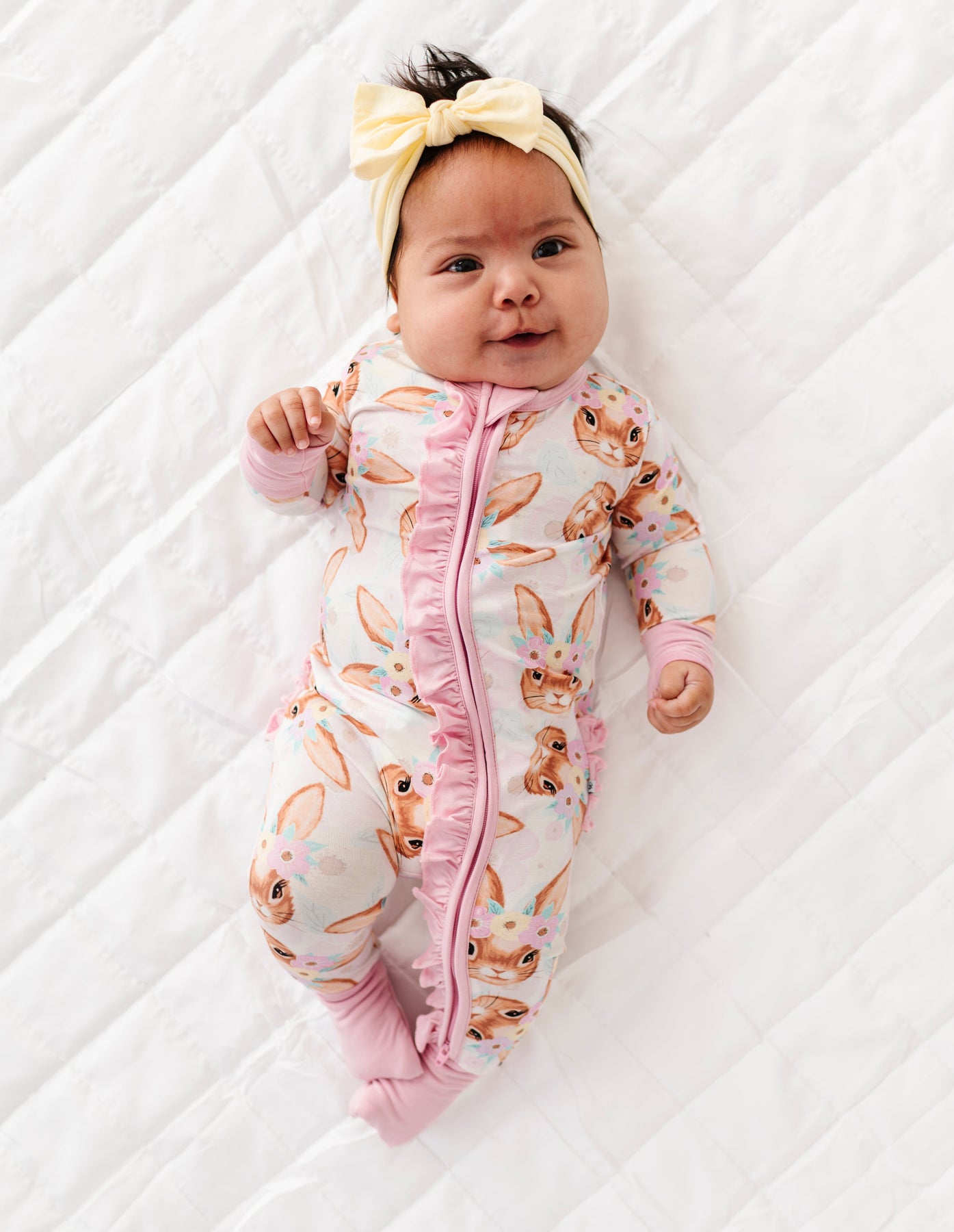 Baby in a pink bunny-patterned onesie lying on a white textured surface
