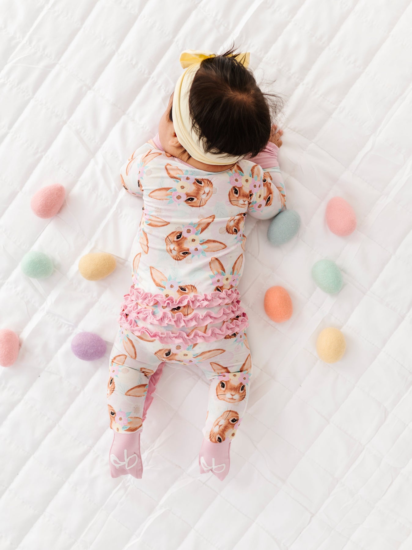 Baby lying on a white blanket with colorful eggs around, wearing a bunny romper.