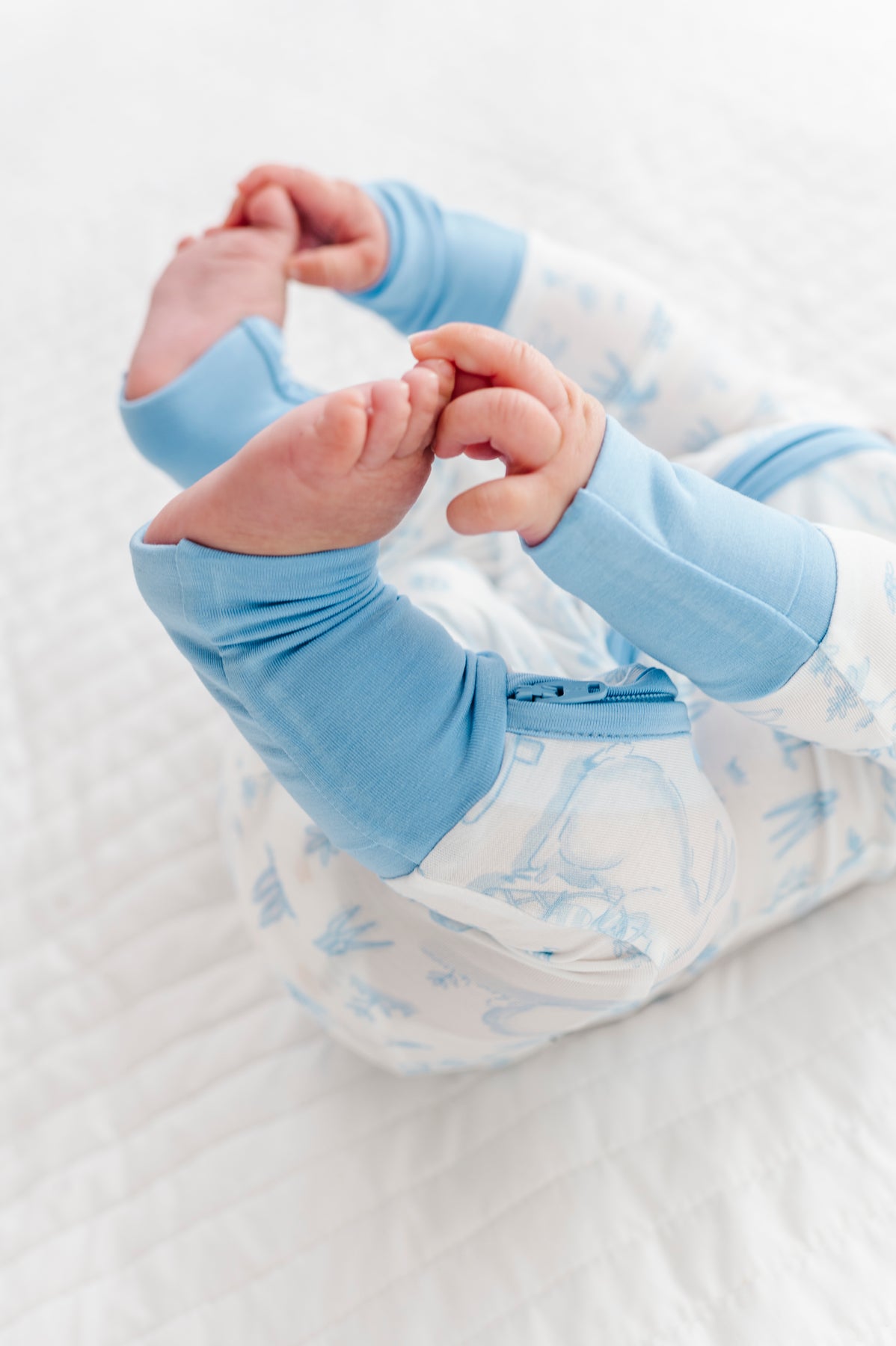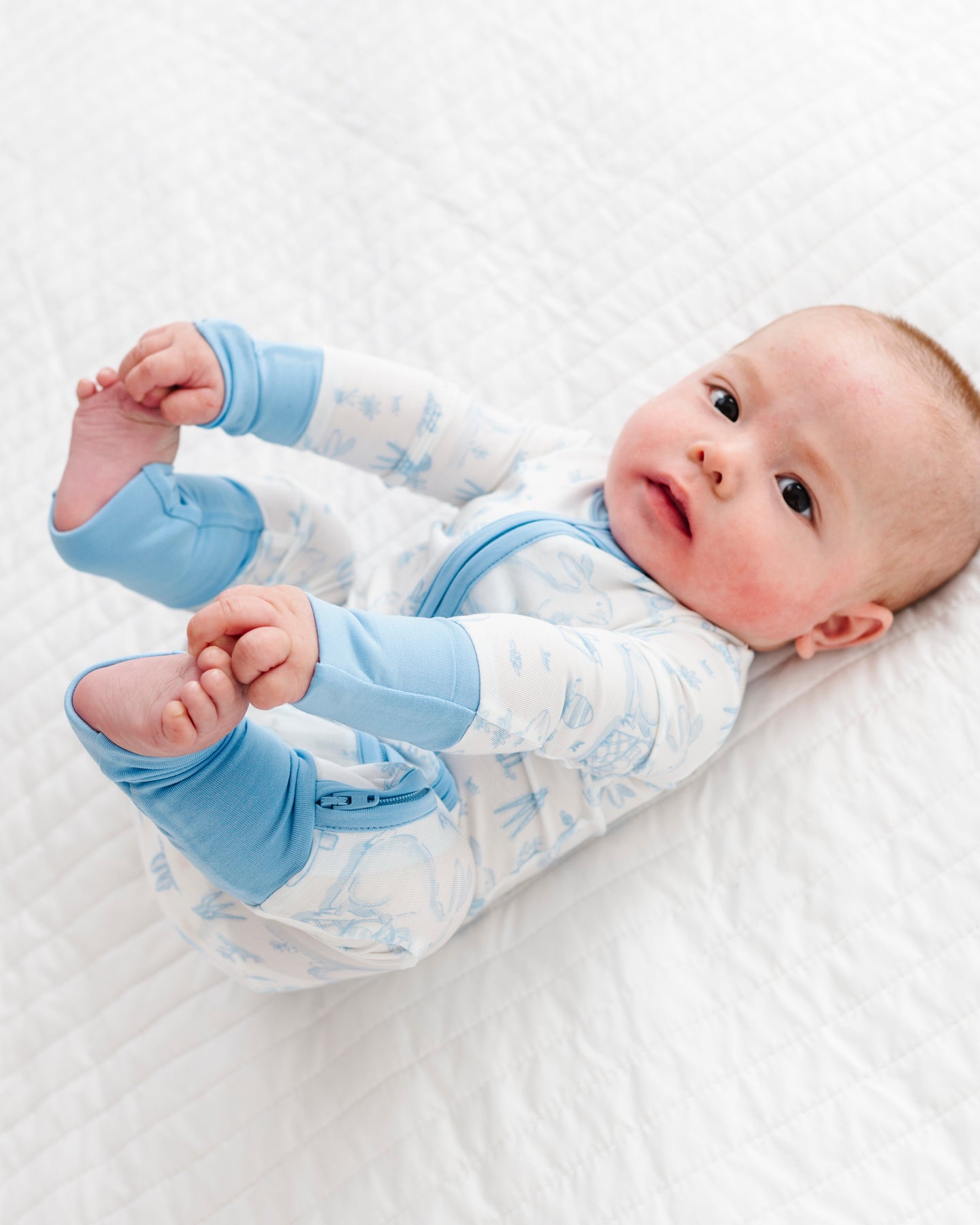 Baby in a white and blue romper on a white blanket