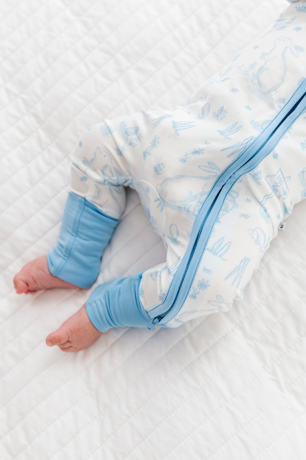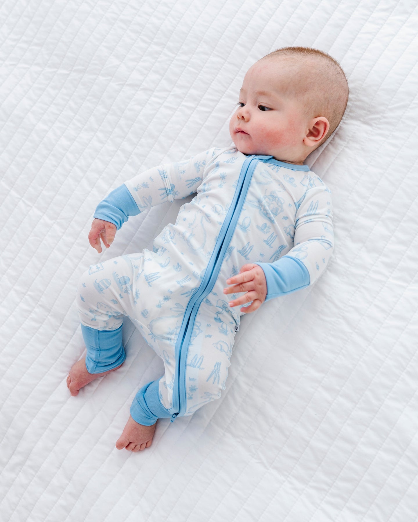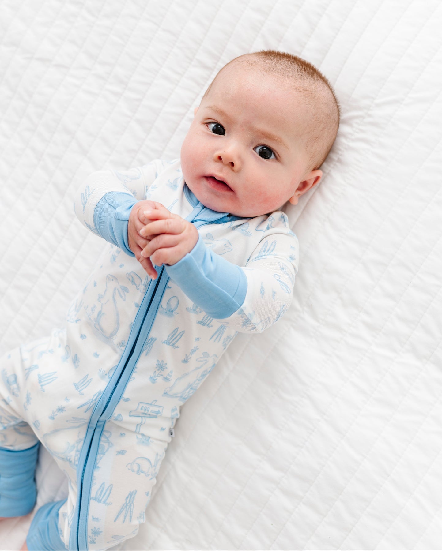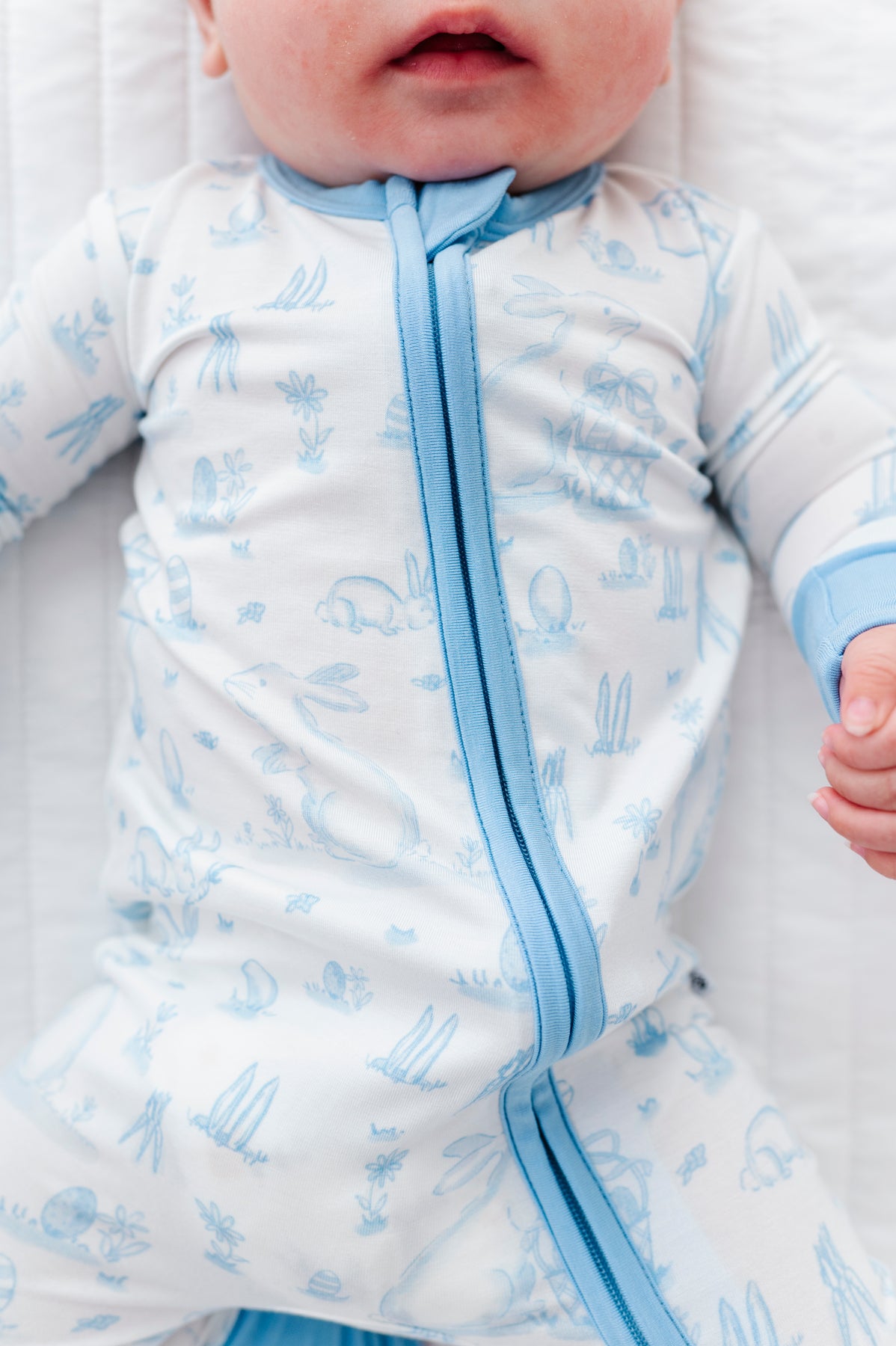 Baby wearing a white and blue Easter romper on a white textured surface