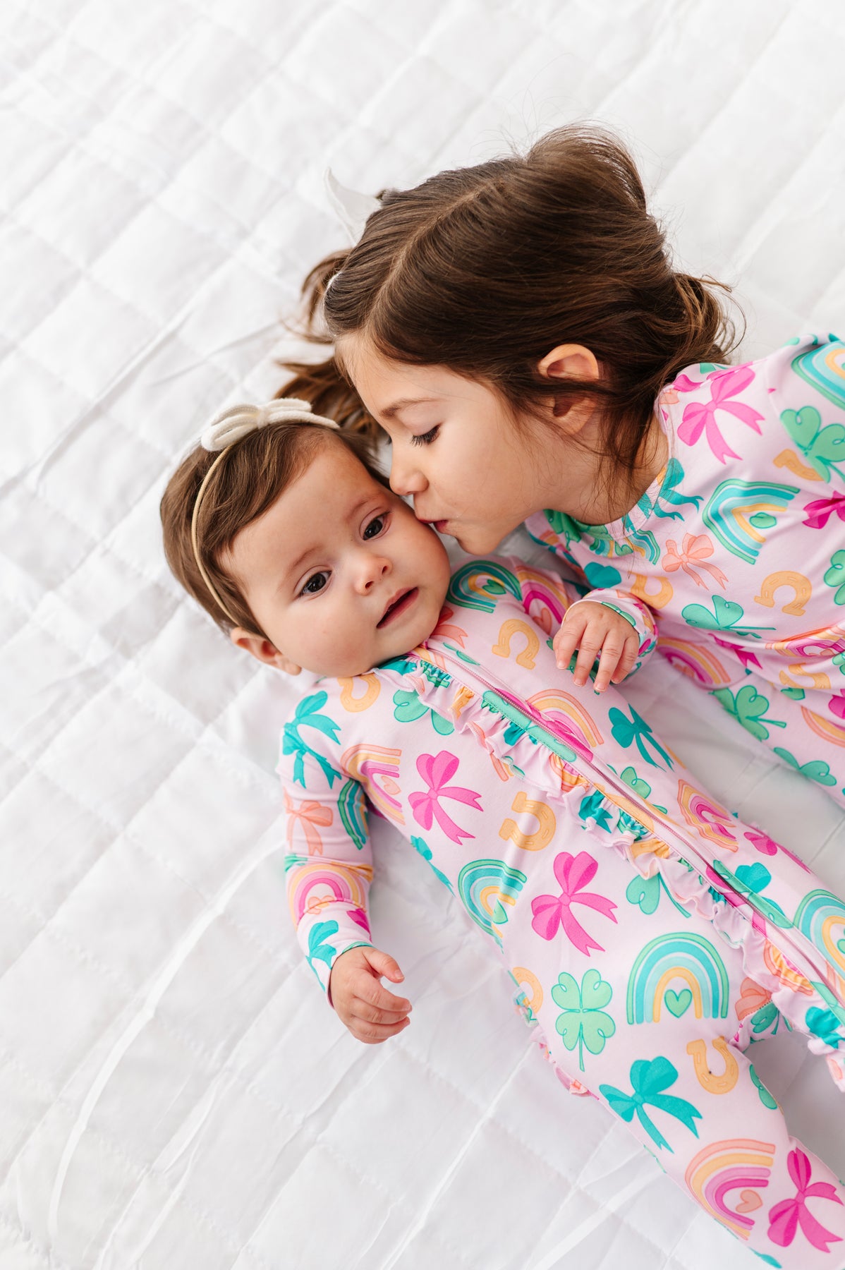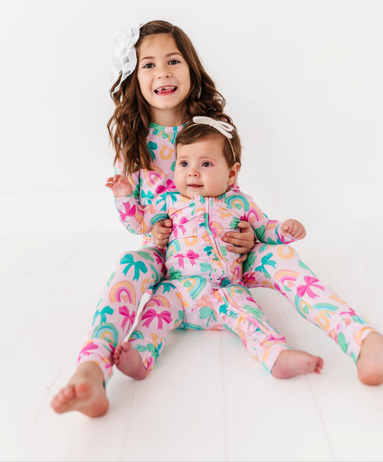 Two girls wearing matching bamboo pajamas featuring St. Patrick&